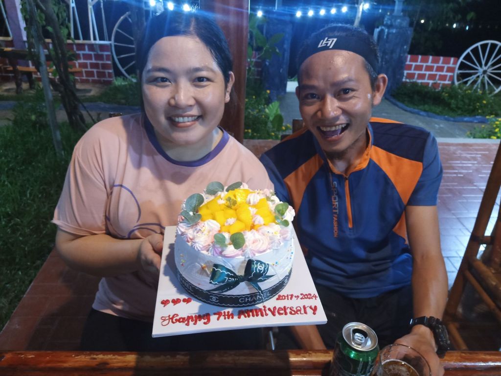 When I got back to the homestay, I decided to chance a full shower with a hair wash – this was a mistake. I was lathered up like a soapy meringue when the water went off! It took a while to get all the bubbles off me and, of course, Vietnamese hotel towels are rather small. I was 10 minutes late to my own leaving party and Chung, who was going to give me a lift, was busy so I cycled back down. René was already there and was a bit concerned he was going to miss me as he had guests back at Greenfield Ecostay who he had to get back to. Ngan, his wife, was in Hanoi and couldn’t join us. René had a drink with me and then left with arrangements to come back if work allowed. Maxime and his 2 daughters joined us, then Bich and Luc came for a drink and food and it was so lovely to catch up. I had also arranged to have a drink and some food at Son River House Homestay with Chung and Uy. It was also their 7 year anniversary. Manu from Victory Road Villas and the girls from Phong Nha Vegan were also meant to be coming to join the small party. Manu saw René drive past on a motorbike so I cycled back after paying my 1,200,000VND (£36.45). This included breakfast, lunch for 2 of us, 2 smoothies, 4 cocktails and a bottle of red wine to take away. Back at the homestay, I arrived to an empty seat where René must have been sat, a fresh beer with ice and a 100,000VND (£3) note under the glass as payment. He had obviously got tired of waiting for me and left – I was surprised not to have passed him as I cycled my little legs as fast as I could on Bluey. Manu didn’t arrive as he couldn’t find it, and the Vegan girls were too busy with customers to leave early. Chung was apologetic that the local chicken with sticky rice that I had ordered for us all to share, had been boiled instead of barbecued. I wasn’t, as it was so delicious – Ms My had done a lovely job and I opened the bottle of wine to share with Chung and Linh Giang. Once again, I was the only non-Vietnamese person at the table and we had so much fun. Eventually, Uy noted the date and redeemed himself of forgetting his anniversary with a romantic speech but I was more enthralled by Motthew IV. Chung had chopped up a couple of pineapples for us to share so a big, thirsty moth came to sample it. There was a cake, more cheers and drinks but I was in bed by 10.30pm. I still hadn’t packed for Danang, Dalyan or the UK. Tomorrow was going to be a bit disorganised and rushed.