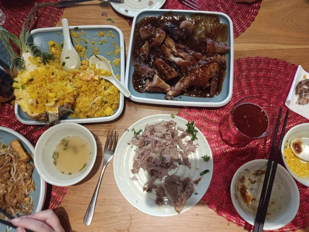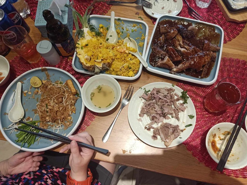 Thuy’s husband drove Captain Caveman, me, Thuy, her 2 kids and sister to Geminai restaurant. Captain Caveman and I hadn’t been for about a year and it had definitely had some changes and improvements. Because I’m fussy with food, I ordered my own Prawn Pad Thai but the rest of the adults ordered dishes to share. There was one pork dish with a bone in which looked impressive as well as duck and seafood rice dishes. Captain Caveman and I had a beer and the kids were allowed a Coke, they were exceptionally well behaved. Thuy wanted Tin and Su to pose for photos with us and Su was nervous so I told her she didn’t have to do anything she didn’t want to. She was super cute and gave me a hug and a kiss, which considering she was only 2 years old when I last saw her, was trusting. The lunch was amazing and I really enjoyed my food, as well as watching Captain Caveman don the plastic gloves to sort the meat out for the table.