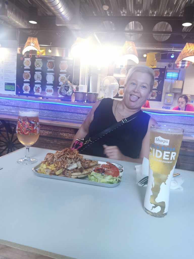 Our next stop off was for a drink at The Furnace, round the back of a sadly closed Debenhams. We had a pint of Madri lager, a first for me (but wouldn’t be my last) and I hadn’t heard of it before. It’s weird that even being away for just 2.5 years that the beers available on the draft pumps in bars are unfamiliar to me. After one drink in there, we decided to walk to a place that had been added to my list of places to visit. The owner of the Milestone restaurant on Green Lane, Matt, had been forced to close up during Covid. He had now opened the largest food court in Europe (apparently) called Cambridge Street Collective. Once inside it was a bit overwhelming as there are so many different food stalls from all over the world. I’ve never tried food from Eritrea or Ethiopia but, me being fussy, we decided to choose something I knew I’d like. We found a little gyoza/dumpling place first and had a starter. Louisa was super whizzy at ordering things on a QR code and an app. A lot of places didn’t like cash so this worked ok but I was finding it a bit too laborious, especially as my GiffGaff SIM didn’t have any signal in the building. The starter was lovely and then we had a walk around. I went to the toilet and got a bit confused when there was a man in there but it turns out that the toilets are not separated by gender any more. Very modern but slightly off putting as I had to put the seat down and clean pee off the seat before I could go. My guess is the men were complaining there were no urinals and they had to lift the seat up. Most people that came in to the toilets thought they were in the wrong ones and did a double take each time they saw a person of the opposite sex, which was funny. It took us a while to decide what to eat next but Louisa had something from Gyros Express, a gyros with pitta and chips which looked amazing. I decided on Asia Thai Street Food where I got a bit excited and ordered a Pad Thai and a prawn fried rice to share with Louisa. I had a pint of cider and Louisa stuck to the Madri lager and the prices (in £) are below.