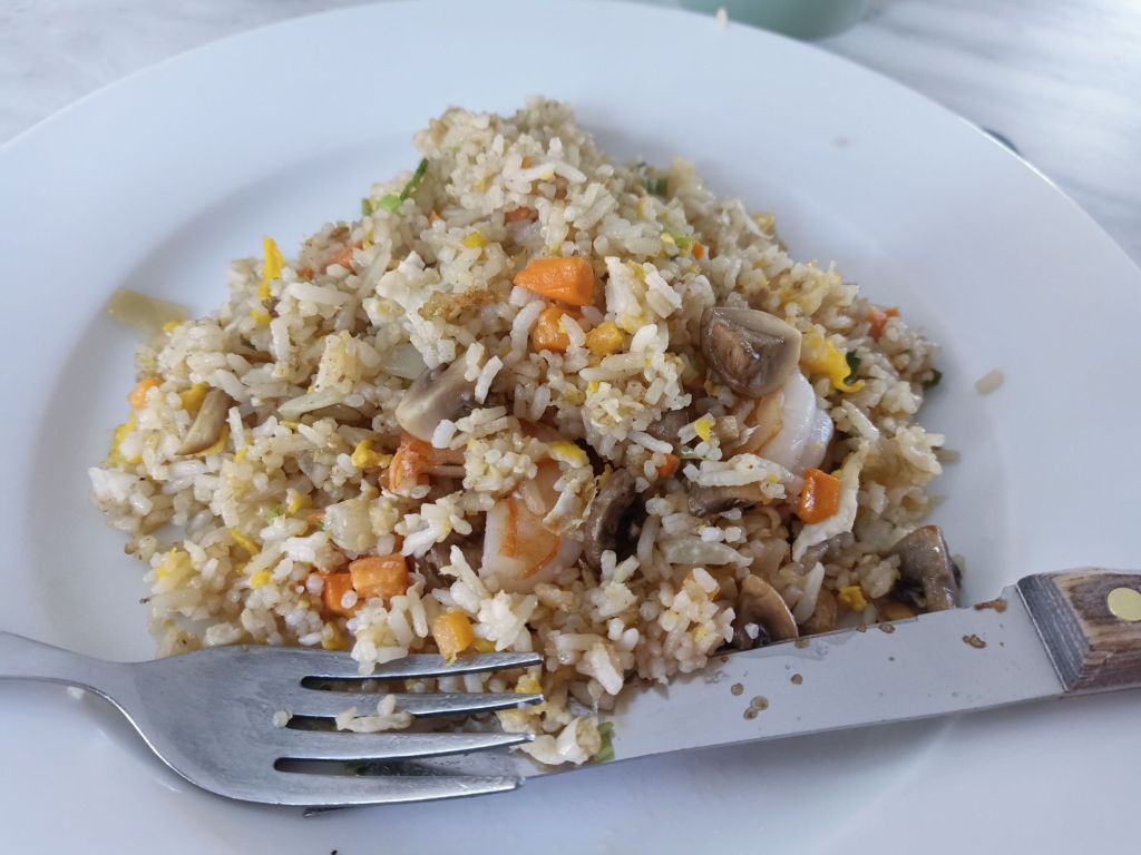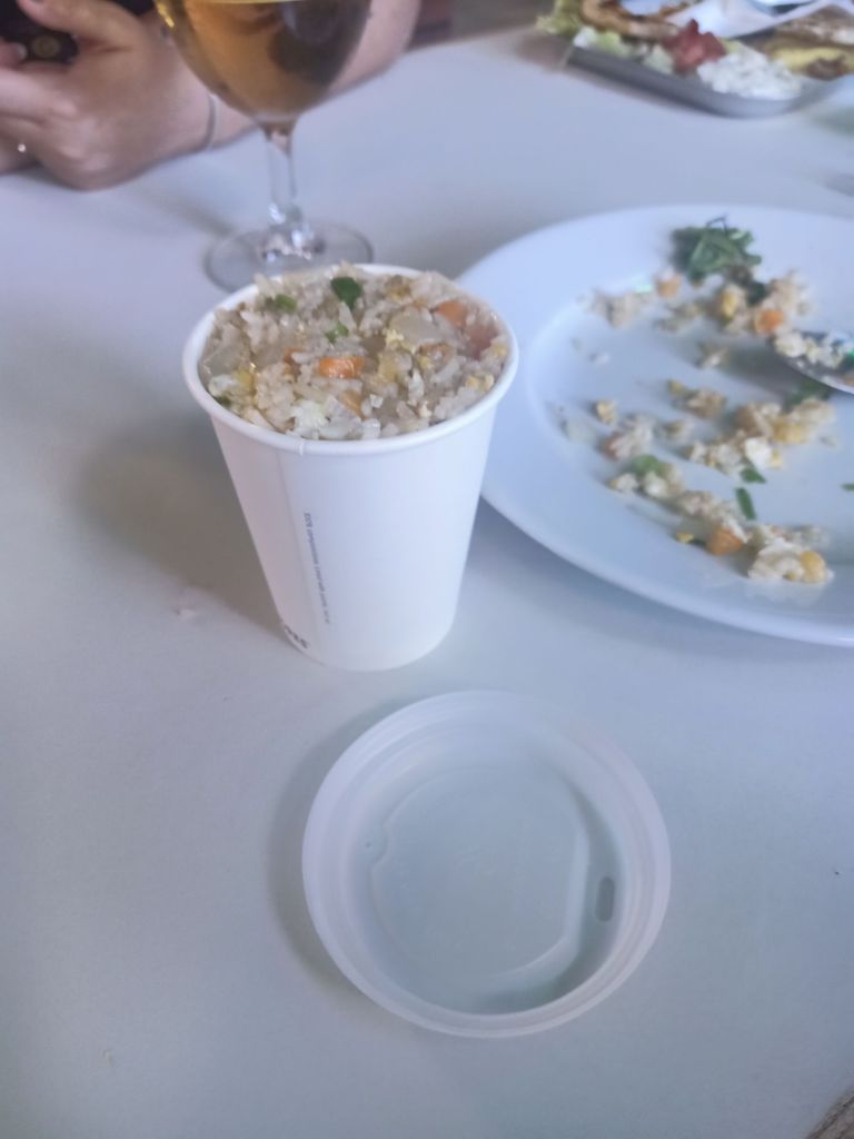 Unfortunately, when I saw the size of Louisa’s Gyros, I knew we wouldn’t eat the prawn fried rice so I asked if we could have a box for takeaway. Surprisingly, they do not do takeaway so I had to pinch a paper cup from a closed coffee stall and cram the rice dish in to it. I thought I would take it home and have it tomorrow for breakfast. After a lovely afternoon and evening out it was time to make our way to our respective buses.