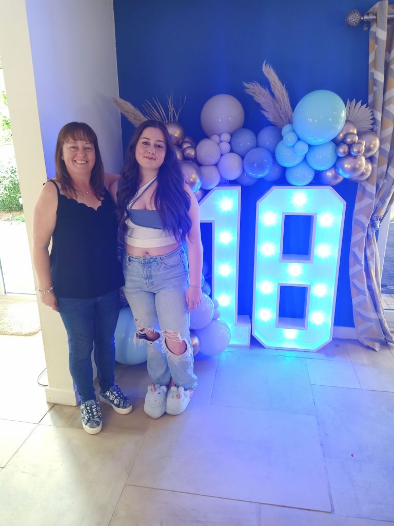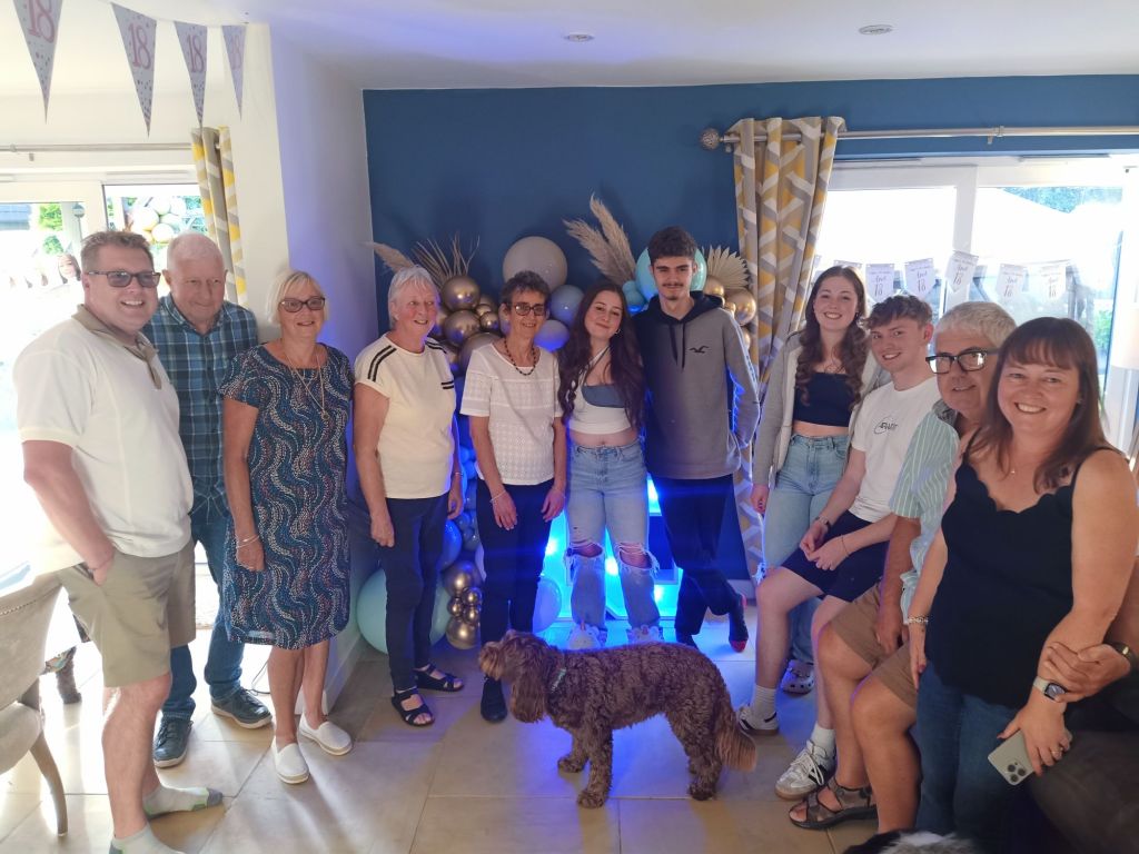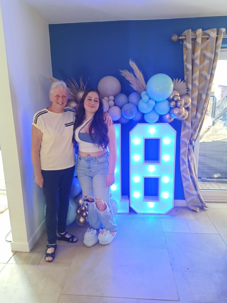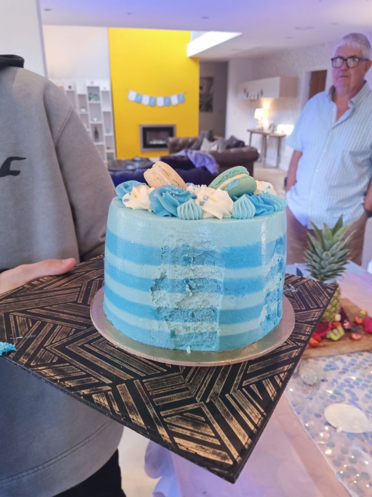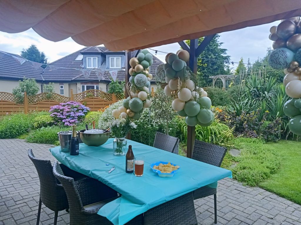 Gayle & Neil were throwing a party for April’s 18th birthday on Saturday 27th July from 2pm. My parents and I were all excited and there was talk of what we were wearing, how we were getting there and even which door we would be leaving from. I carried on trying to get as much work done as possible but I could tell Dad was excited to be going. Before we left for the walk up the hill, wearing sandals, out of the garage door, I had some beans on toast (I was too busy for breakfast) and had a quick video call with Captain Caveman who had returned from the cave yesterday. At Gayle and Neil’s we were unfashionably bang on time and the birthday girl was still getting ready. It wasn’t her actual birthday yet so we put the presents and card on a table to be opened another time and admired the lengths my sister had gone to, to trim up the house. It reminded me of when I see American’s having a party as there were nicely arranged balloons and a light up massive number 18 in the living room. The table was ladened with treats and nibbles, outside was fizz in an ice bucket and more garlands/swathes of balloons on the pergola. The kitchen was jam packed with so much food that I wondered who was coming to ‘the small party just for close family’. We all had a glass of champagne, avoiding the larger champagne flutes which Gayle went for. April came out to say hello and fixed herself an Aperol spritz while Gayle, in her lovely summery dress, wrestled with Sumo, the dog, over a cardboard box for empties. Morgan and her boyfriend, Harry, joined April and Harley and I got to meet Harry for the first time. I was already eyeing up the beautifully presented charcuterie board and macaroons while I helped myself to a top up of Prosecco. By 3.20pm I was in the kitchen videoing the extravaganza as Gayle did some last minute preparation while chatting on. There was lots of red wine I noticed too and I was intrigued as to what the shell full of blue balloons was for – maybe a party game was coming later!