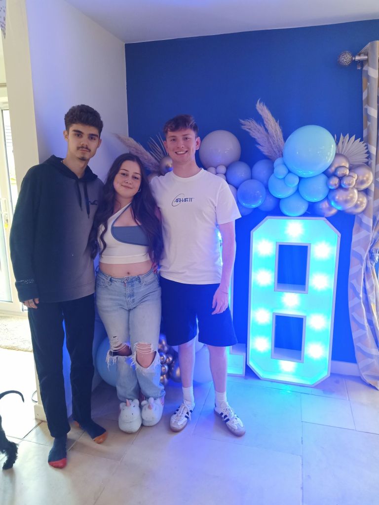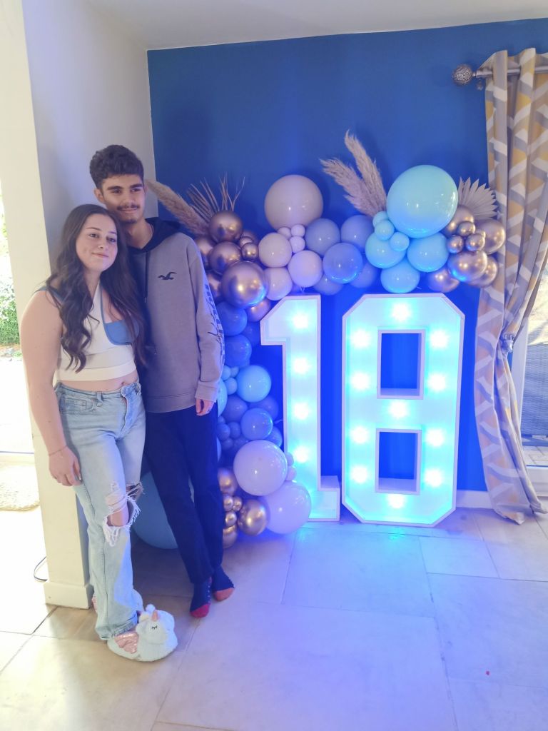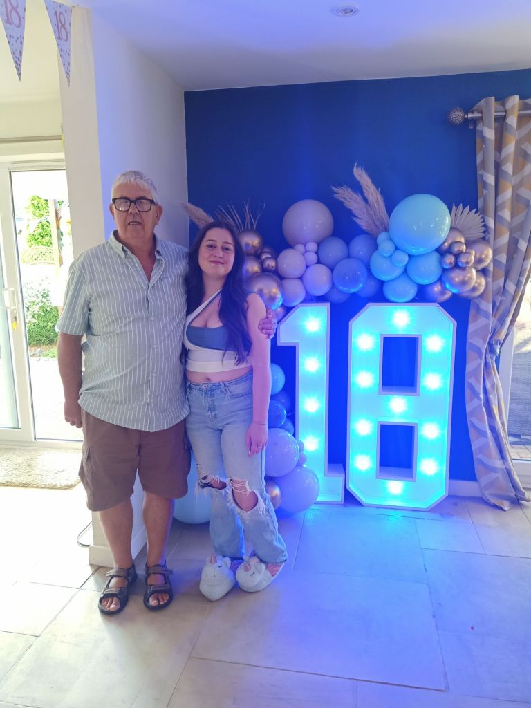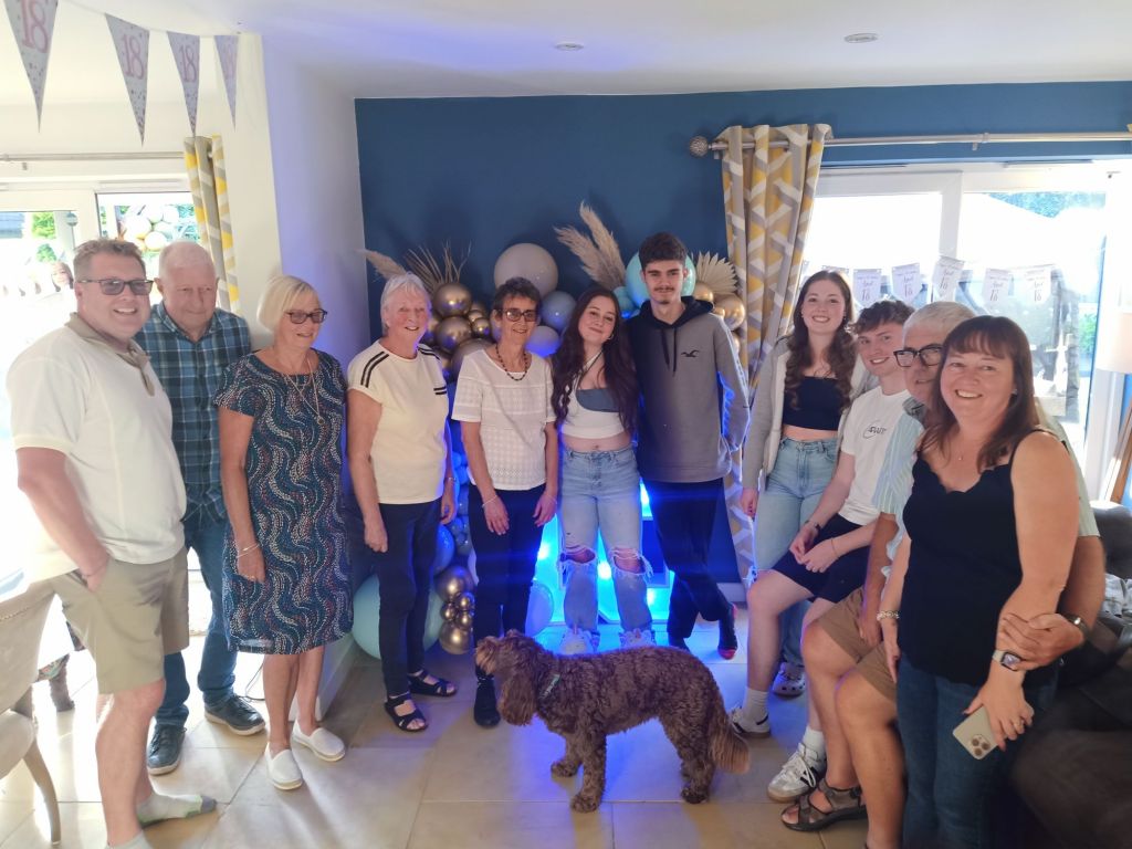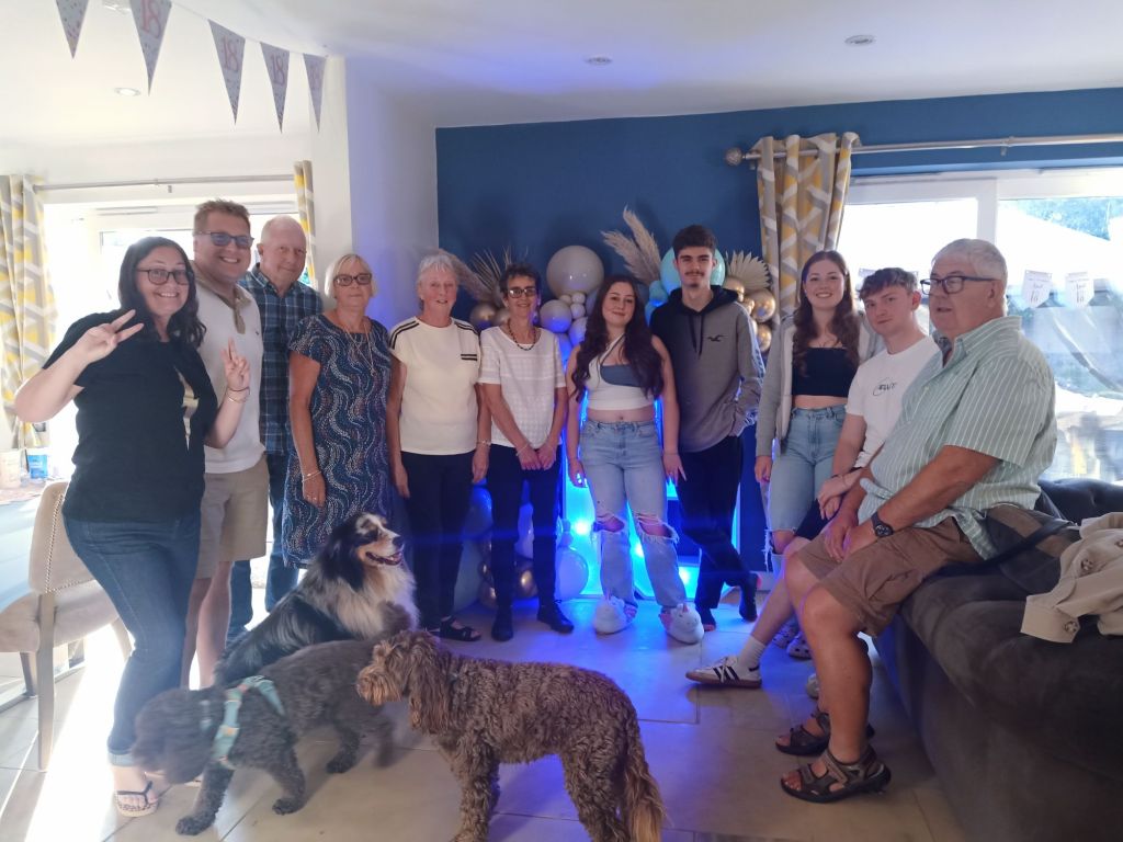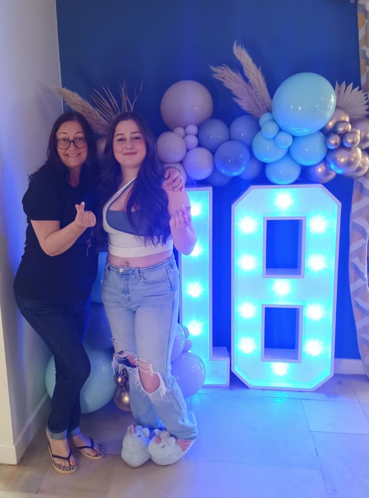 Gayle & Neil were throwing a party for April’s 18th birthday on Saturday 27th July from 2pm. My parents and I were all excited and there was talk of what we were wearing, how we were getting there and even which door we would be leaving from. I carried on trying to get as much work done as possible but I could tell Dad was excited to be going. Before we left for the walk up the hill, wearing sandals, out of the garage door, I had some beans on toast (I was too busy for breakfast) and had a quick video call with Captain Caveman who had returned from the cave yesterday. At Gayle and Neil’s we were unfashionably bang on time and the birthday girl was still getting ready. It wasn’t her actual birthday yet so we put the presents and card on a table to be opened another time and admired the lengths my sister had gone to, to trim up the house. It reminded me of when I see American’s having a party as there were nicely arranged balloons and a light up massive number 18 in the living room. The table was ladened with treats and nibbles, outside was fizz in an ice bucket and more garlands/swathes of balloons on the pergola. The kitchen was jam packed with so much food that I wondered who was coming to ‘the small party just for close family’. We all had a glass of champagne, avoiding the larger champagne flutes which Gayle went for. April came out to say hello and fixed herself an Aperol spritz while Gayle, in her lovely summery dress, wrestled with Sumo, the dog, over a cardboard box for empties. Morgan and her boyfriend, Harry, joined April and Harley and I got to meet Harry for the first time. I was already eyeing up the beautifully presented charcuterie board and macaroons while I helped myself to a top up of Prosecco. By 3.20pm I was in the kitchen videoing the extravaganza as Gayle did some last minute preparation while chatting on. There was lots of red wine I noticed too and I was intrigued as to what the shell full of blue balloons was for – maybe a party game was coming later!