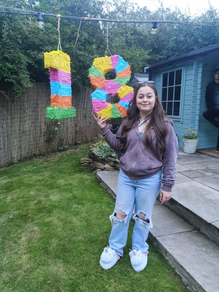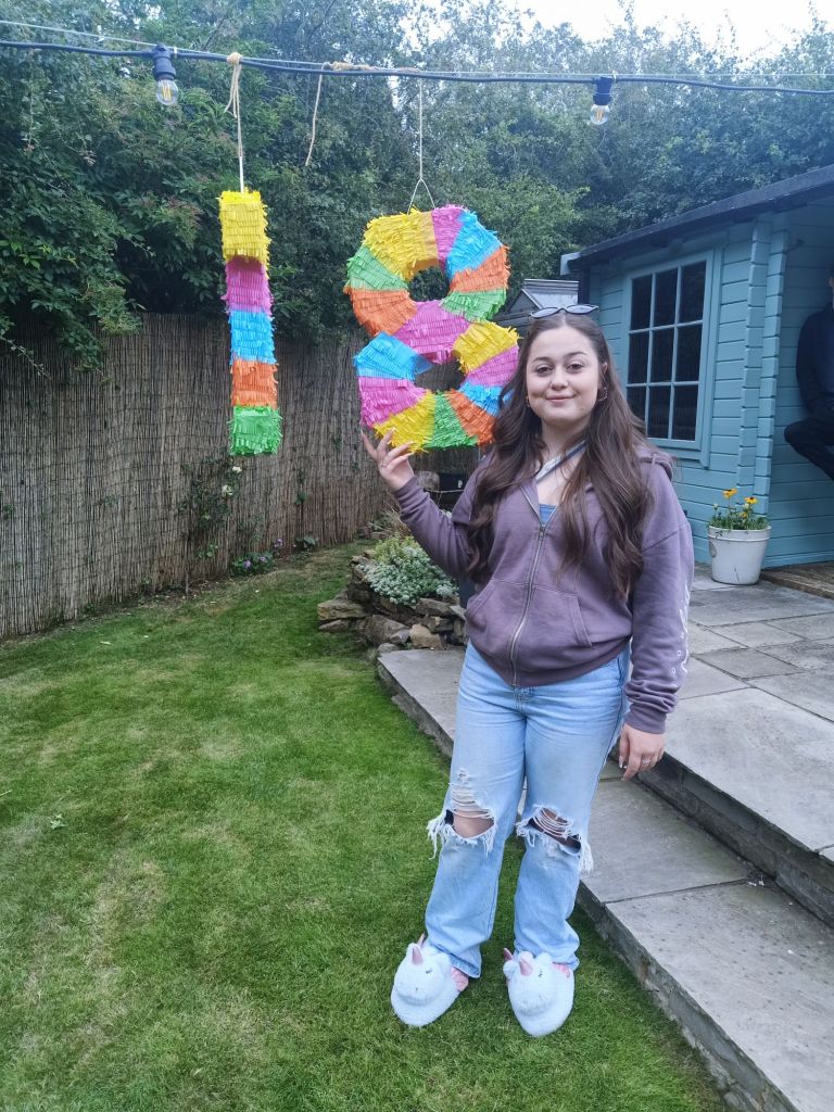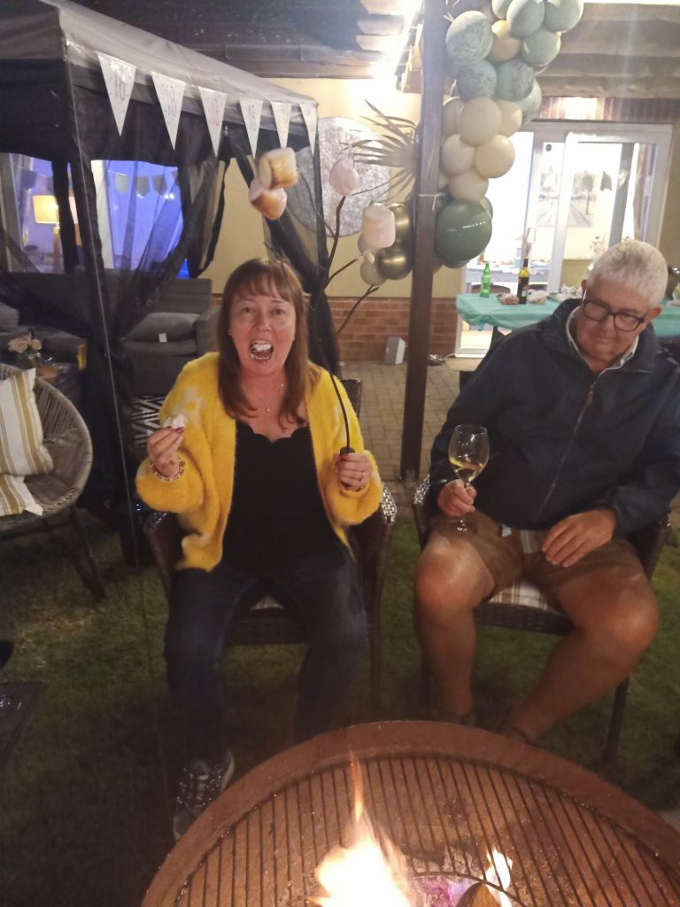 Neil’s parents, Susan & David, and their 2 dogs arrived who I don’t think I’d seen since Gayle and Neil got married over 20 years ago. I got Sue a fizz, Dave was driving, and the adults went to sit on the decking area while I chatted about music with the kids. I noticed Gayle had accidentally on purpose got herself a bit tiddly with the extra large champagne flute of champers and she flashed her knickers. She decided that she would take her dress off as she was too cold. Just as we were getting comfy there was a bit of excitement as it was time to have a go on the piñata. Much hilarity ensued and the funniest people to have a go were my Dad and Neil. Poor Neil seemed like he might’ve been working out some stress or anger and we all couldn’t stop laughing!!!
