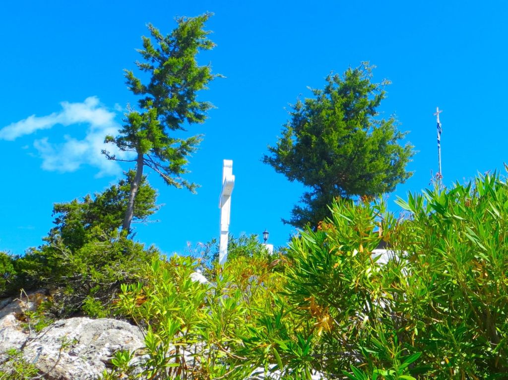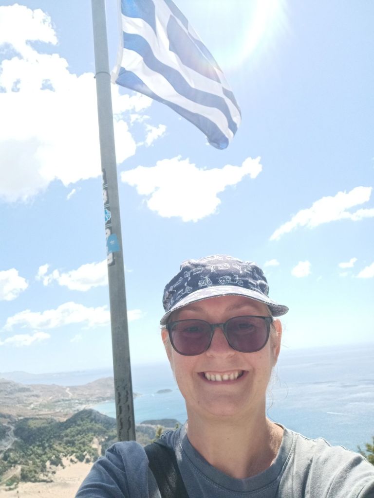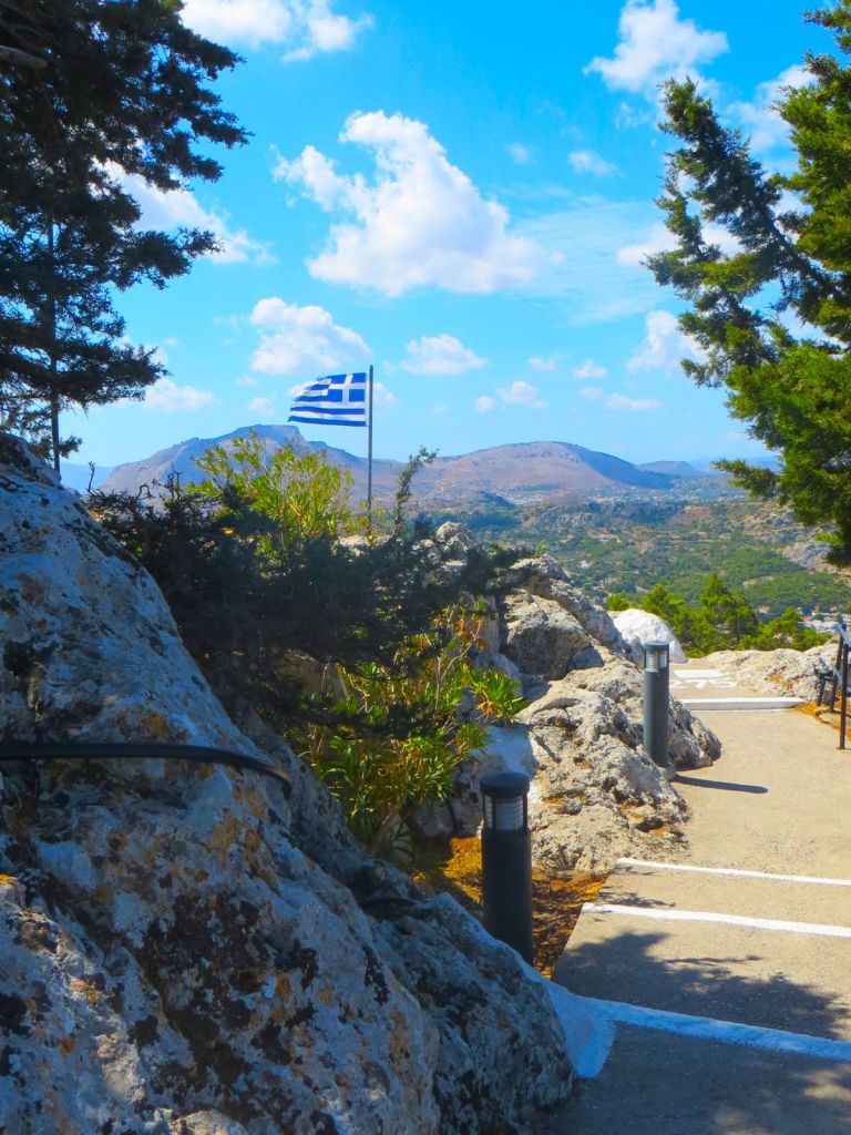 It took us 50 minutes to get there and the sun was already pretty warm so I wasn’t relishing the thought of walking to the top but my friend was so keen to see this place and I’d never been. A Greek lady who also got off the bus and was wanting to visit the Tsambika Monastery was chatting to us, in Greek, as a car came past and we flagged them down. The 3 of us managed to cram in the back and got a lift to the first main car park, then set off walking. My friend reminded me a little of Captain Caveman as she forged on ahead, stopping to briefly check I was still following. I finally reached the top at 12.30pm and took a selfie at the Greek flag.