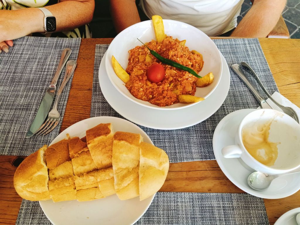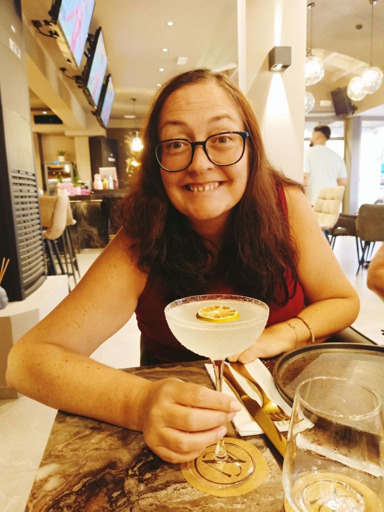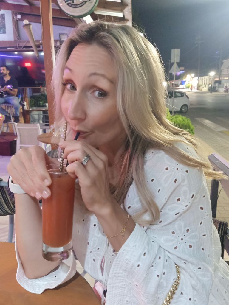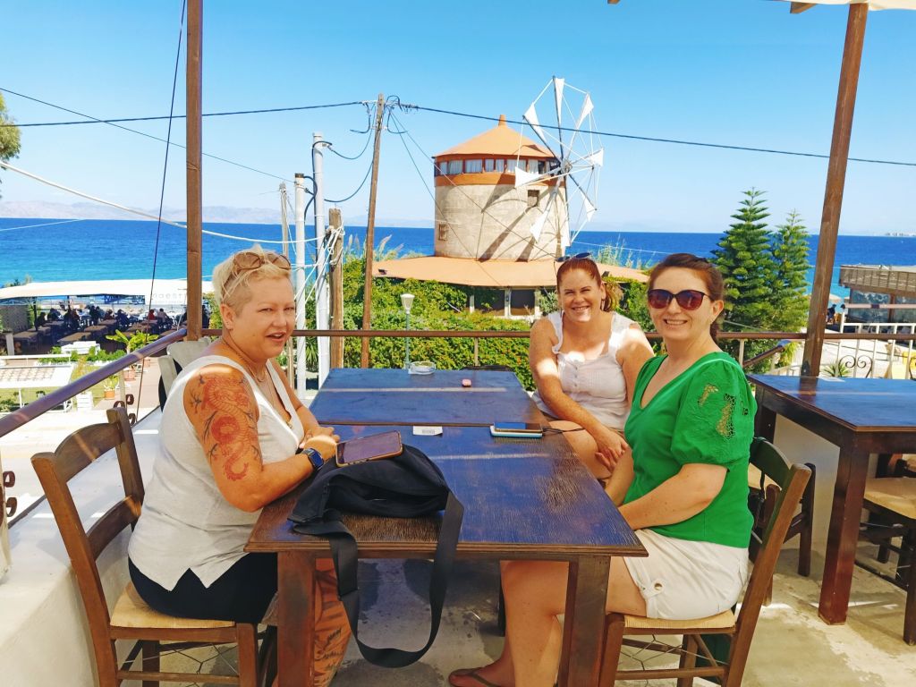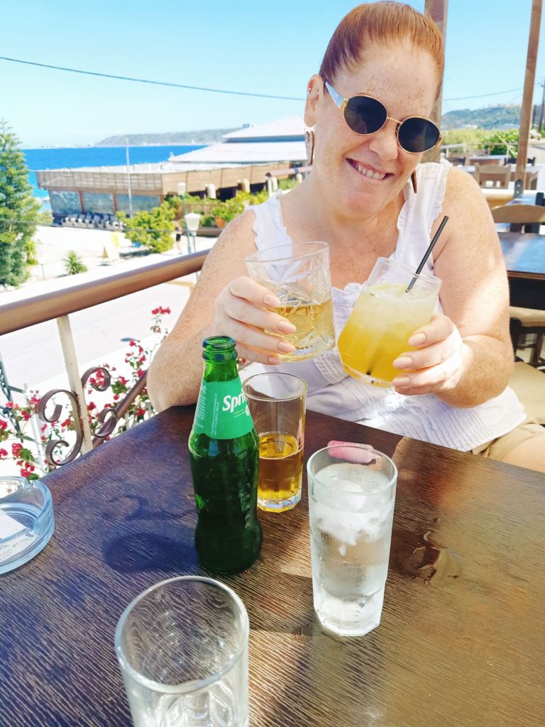 My day on Tuesday 17th September started with a healthy breakfast but would not continue in that vein – it was probably a good thing I was missing the Dalyan Fat Club tomorrow! I ate a banana and a plum with my cup of tea, then got on with work. At lunch time the girls were going for a walk so I decided to close the laptop and join them. On our walkabout, we spotted a lovely rooftop bar and went in for some lunch and a drink. Kompologaki restaurant also had sunbed rentals by the beach across the road and we had nice views of the sea from our corner rooftop table. There were lunchtime specials on so we ordered from that menu where it came with a beer or wine included in the price. It had one of those QR code readers to view the menu so we used that and I made a list of who wanted what so that I could go back downstairs and order, here’s what everyone chose; Kelly: Pasta Carbonara + beer + Sprite + Mai Tai cocktail Louisa: Gyros plate + beer + Sprite Clare: Gyros plate + wine + soda water Jo (me): Gyros plate + beer