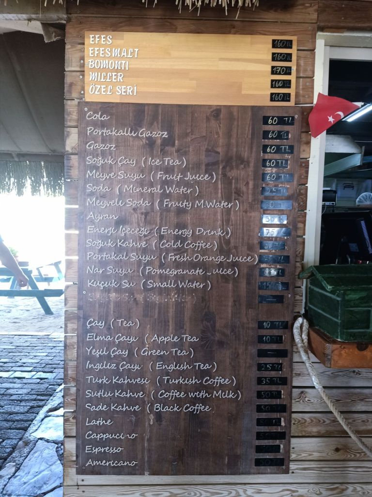 After breakfast, Gayle & Neil were going back to get ready for leaving Dalyan tomorrow and, as I was up and off to Fethiye really early, today was the last day I would see them. They invited me to join them at Kingfisher restaurant that night but I was mindful they would probably want a romantic night by themselves. I did invite them to call in at mine for a drink before or after though, so we could say goodbye. I had really had a great time with them and I wasn’t really sure when I would see them again. I popped to the shops and picked up some essentials, including provisions for my trip to Fethiye tomorrow, prices below in lira;