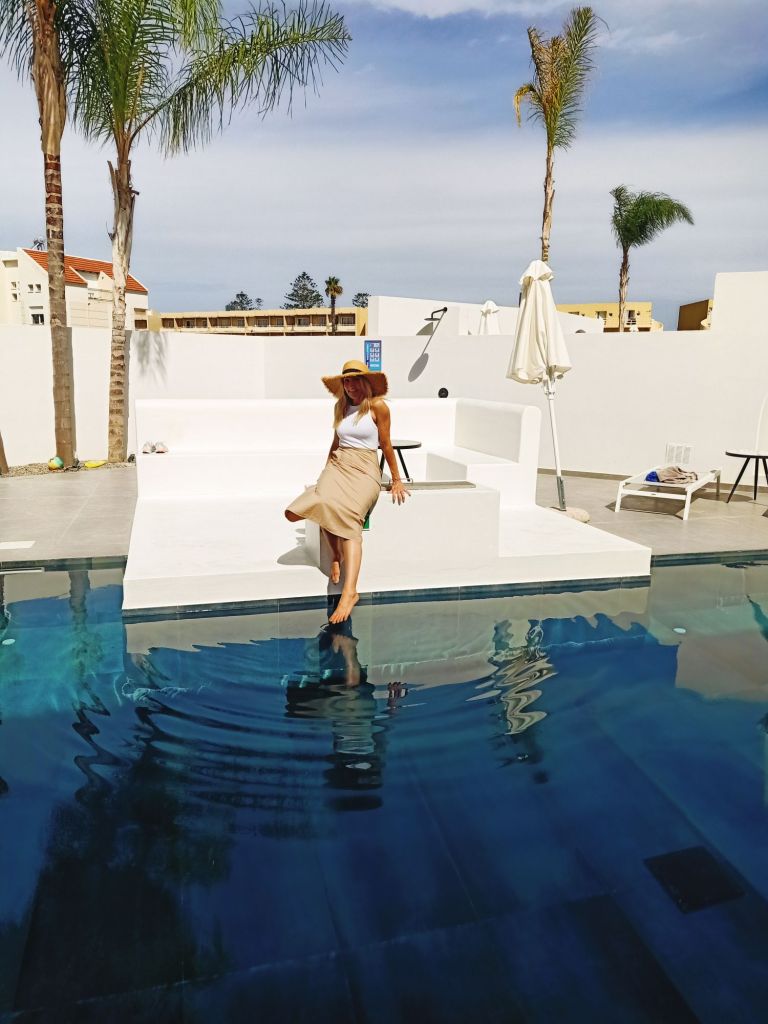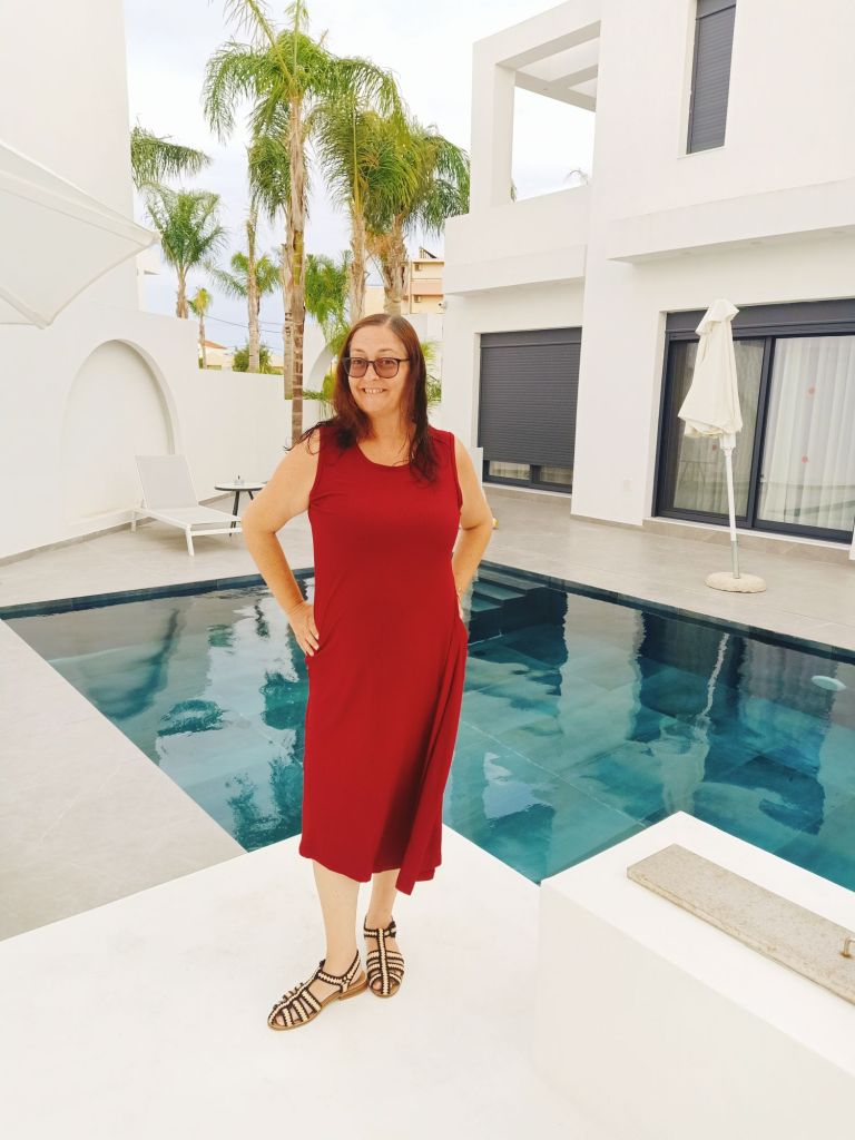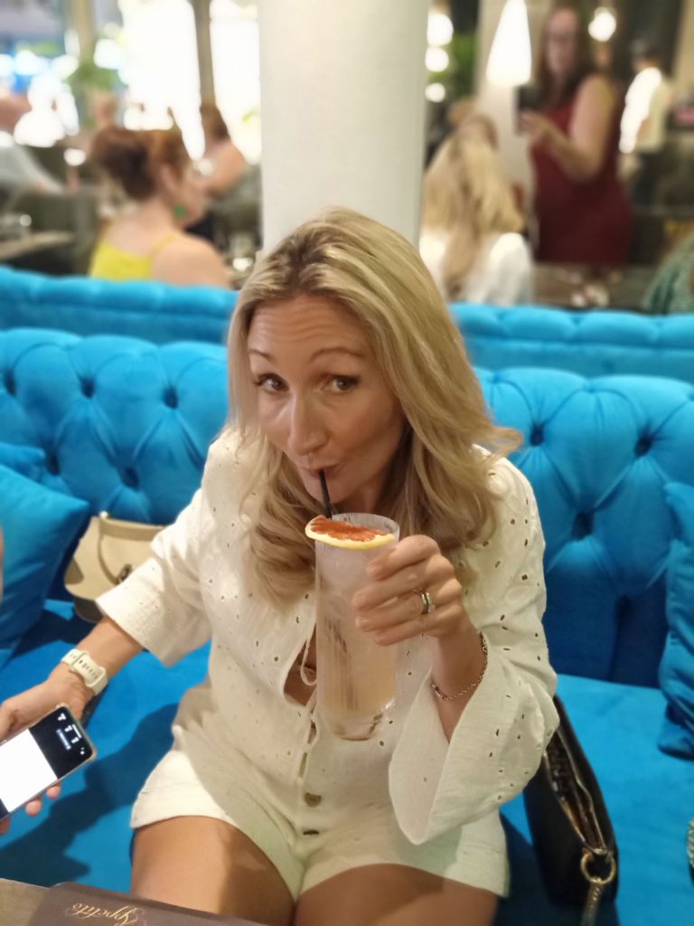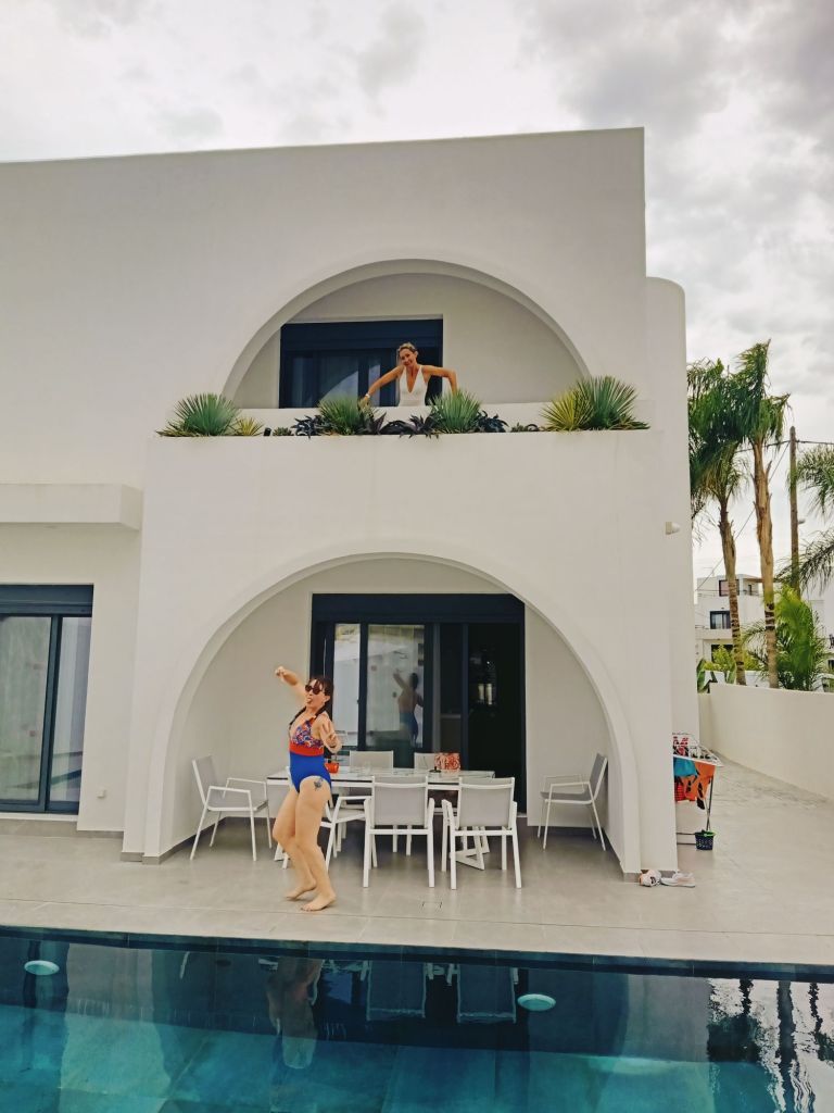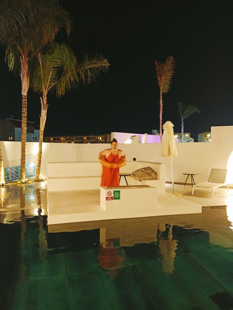 As if the girls knew to cheer me up anyway, the fizz was out of the fridge and it was jacuzzi time. Not before being dragged through a yoga/HIT session with Liz and Clare. It was far too difficult for me on a concrete floor with my knees but I gave it a go where I could. Louisa kindly took photos of us and pointed out when I needed to adjust my position. The jacuzzi was fantastic and the bubbles were very much appreciated as I secretly celebrated being unemployed once again! By 6pm we were showered and changed, ready to hit the town – I even wore one of my dresses. Clare and I took photos of each other by the pool while we waited for everyone to finish getting ready. It was pretty windy and it took a couple of goes to get some without our hair all over the place.