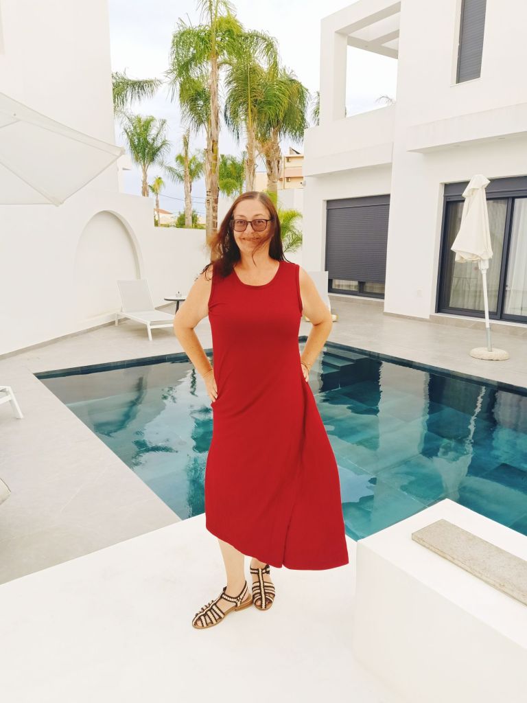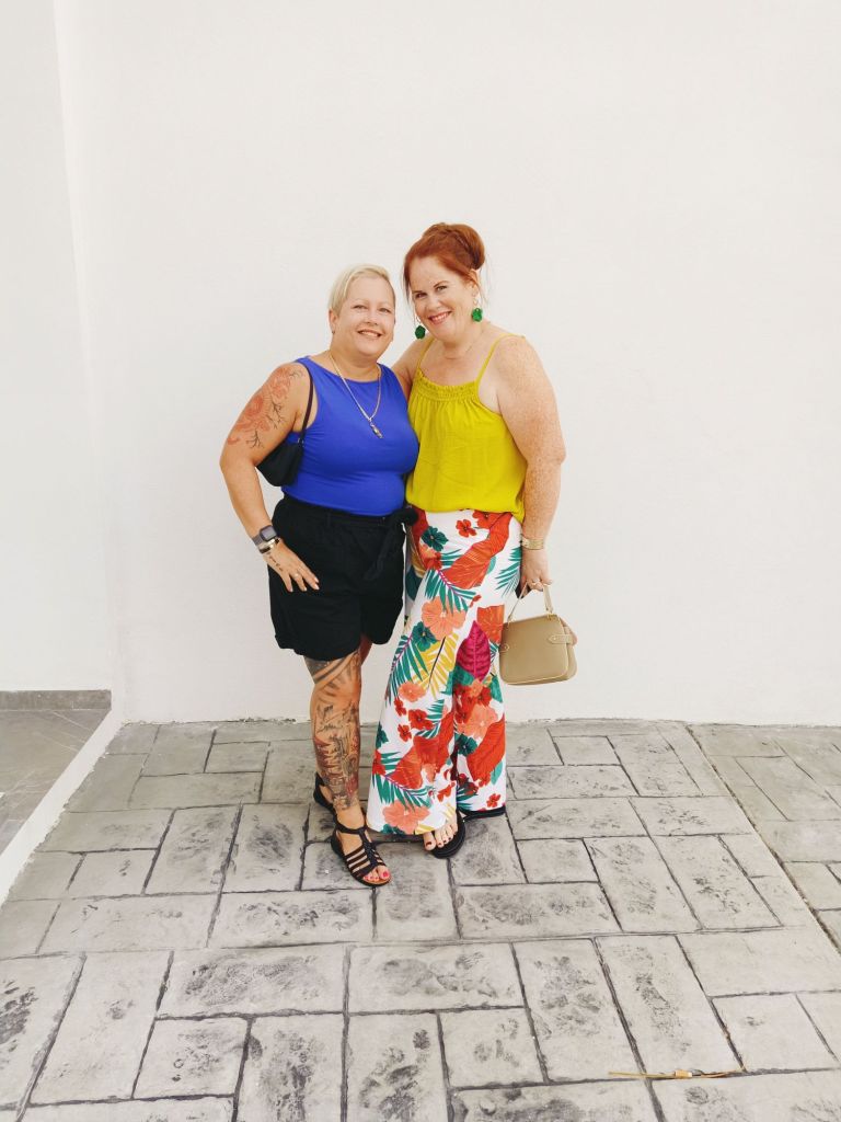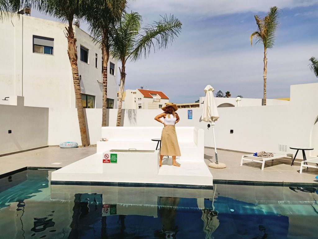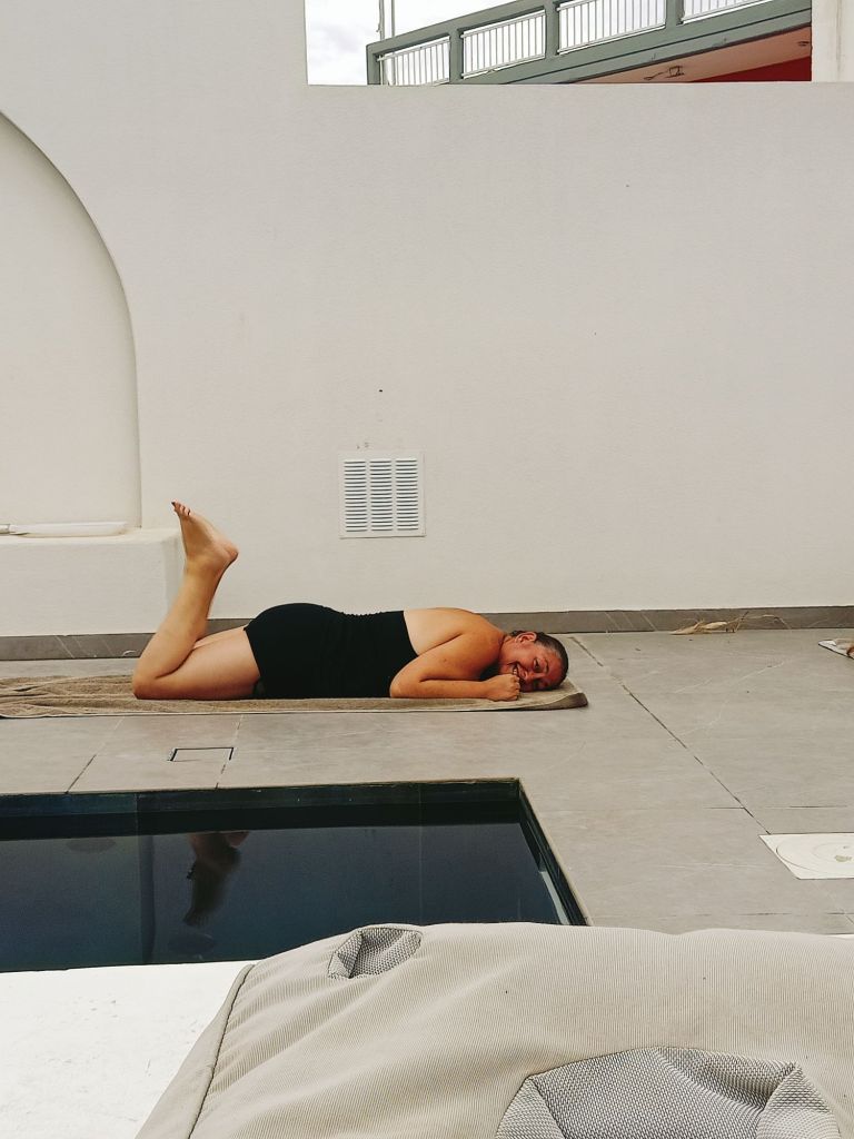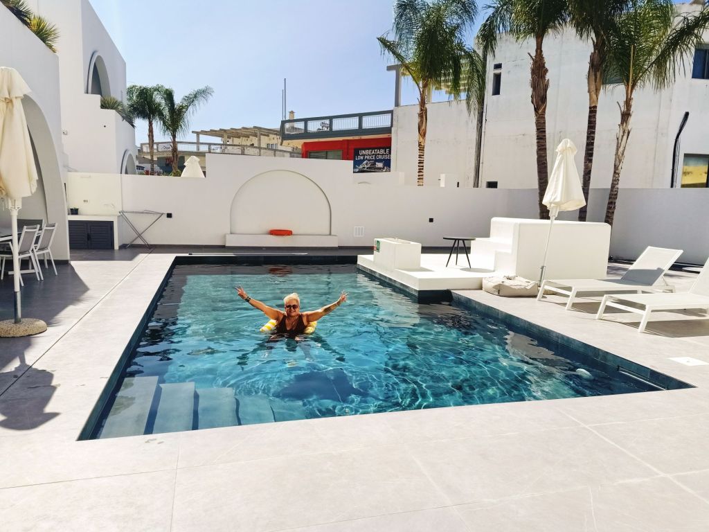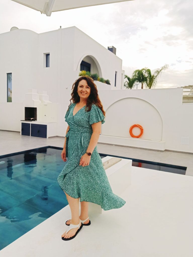 As if the girls knew to cheer me up anyway, the fizz was out of the fridge and it was jacuzzi time. Not before being dragged through a yoga/HIT session with Liz and Clare. It was far too difficult for me on a concrete floor with my knees but I gave it a go where I could. Louisa kindly took photos of us and pointed out when I needed to adjust my position. The jacuzzi was fantastic and the bubbles were very much appreciated as I secretly celebrated being unemployed once again! By 6pm we were showered and changed, ready to hit the town – I even wore one of my dresses. Clare and I took photos of each other by the pool while we waited for everyone to finish getting ready. It was pretty windy and it took a couple of goes to get some without our hair all over the place.
