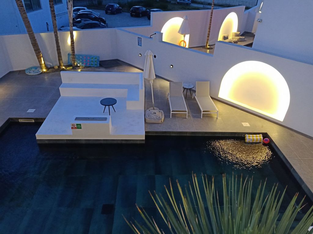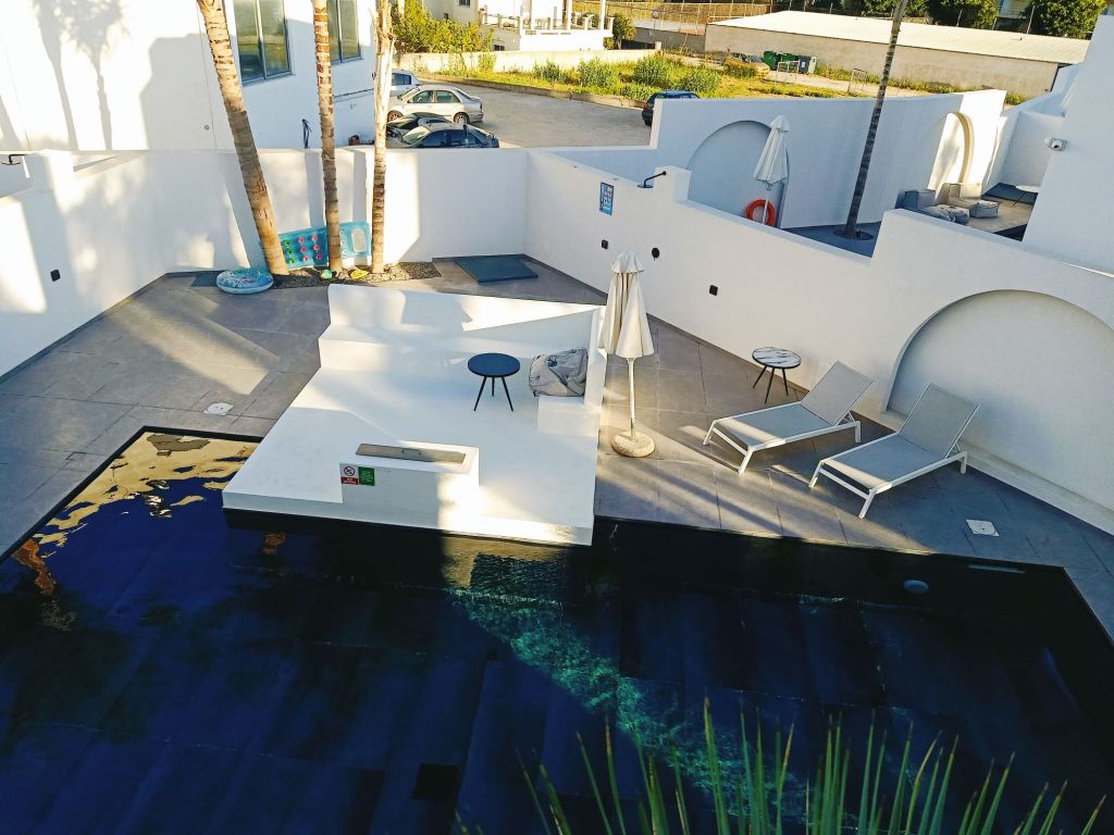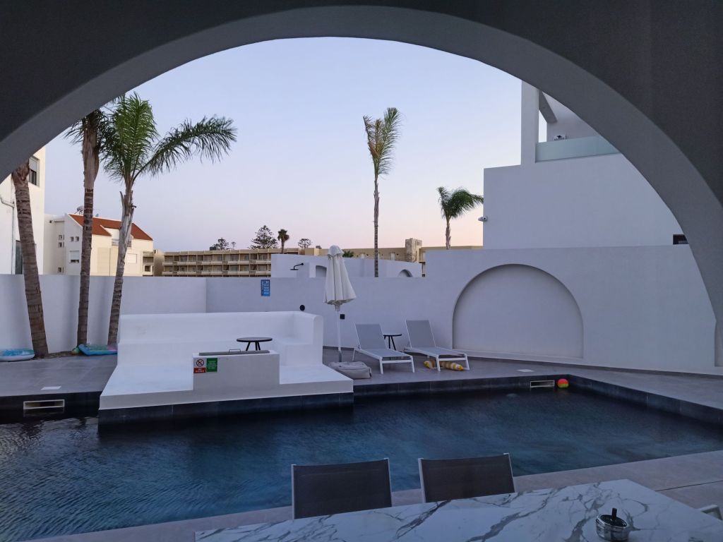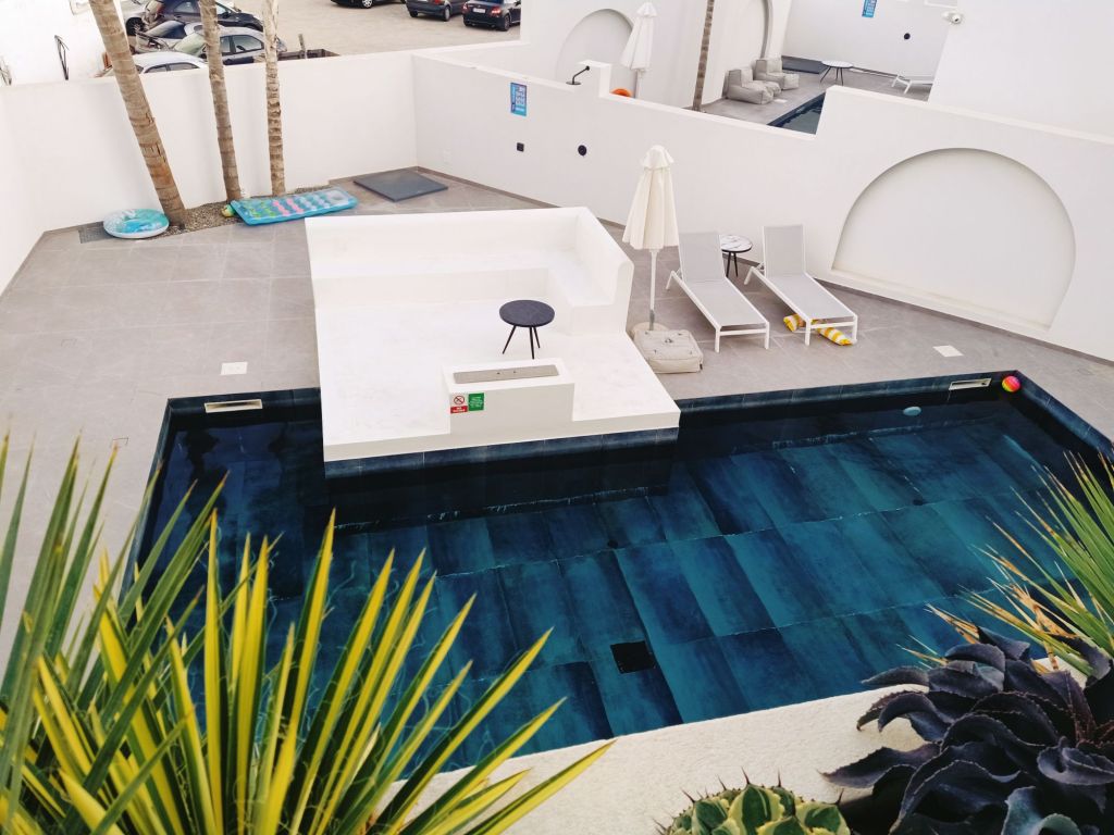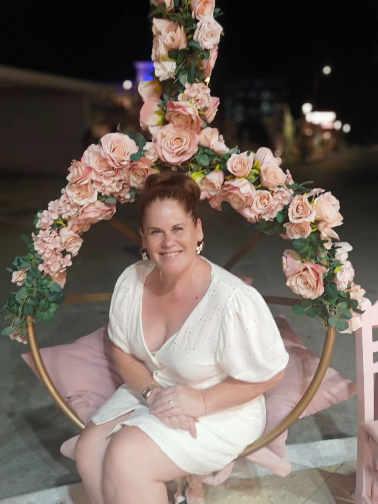 As if the girls knew to cheer me up anyway, the fizz was out of the fridge and it was jacuzzi time. Not before being dragged through a yoga/HIT session with Liz and Clare. It was far too difficult for me on a concrete floor with my knees but I gave it a go where I could. Louisa kindly took photos of us and pointed out when I needed to adjust my position. The jacuzzi was fantastic and the bubbles were very much appreciated as I secretly celebrated being unemployed once again! By 6pm we were showered and changed, ready to hit the town – I even wore one of my dresses. Clare and I took photos of each other by the pool while we waited for everyone to finish getting ready. It was pretty windy and it took a couple of goes to get some without our hair all over the place.