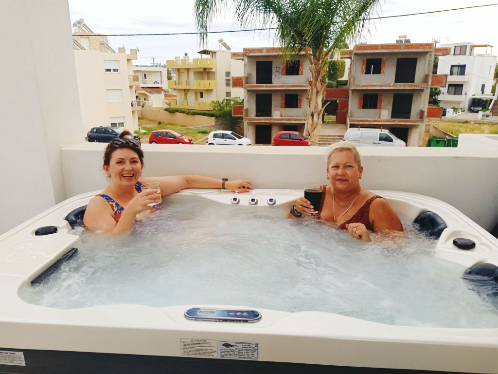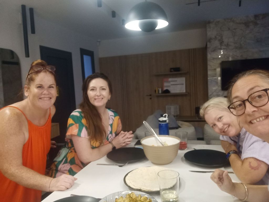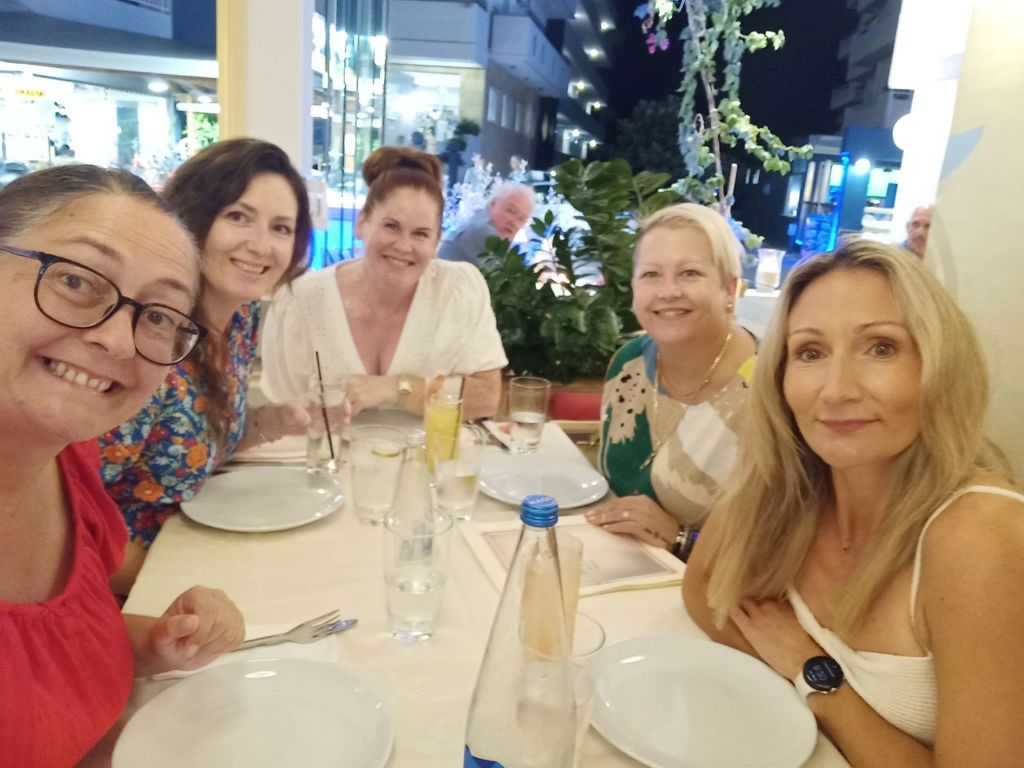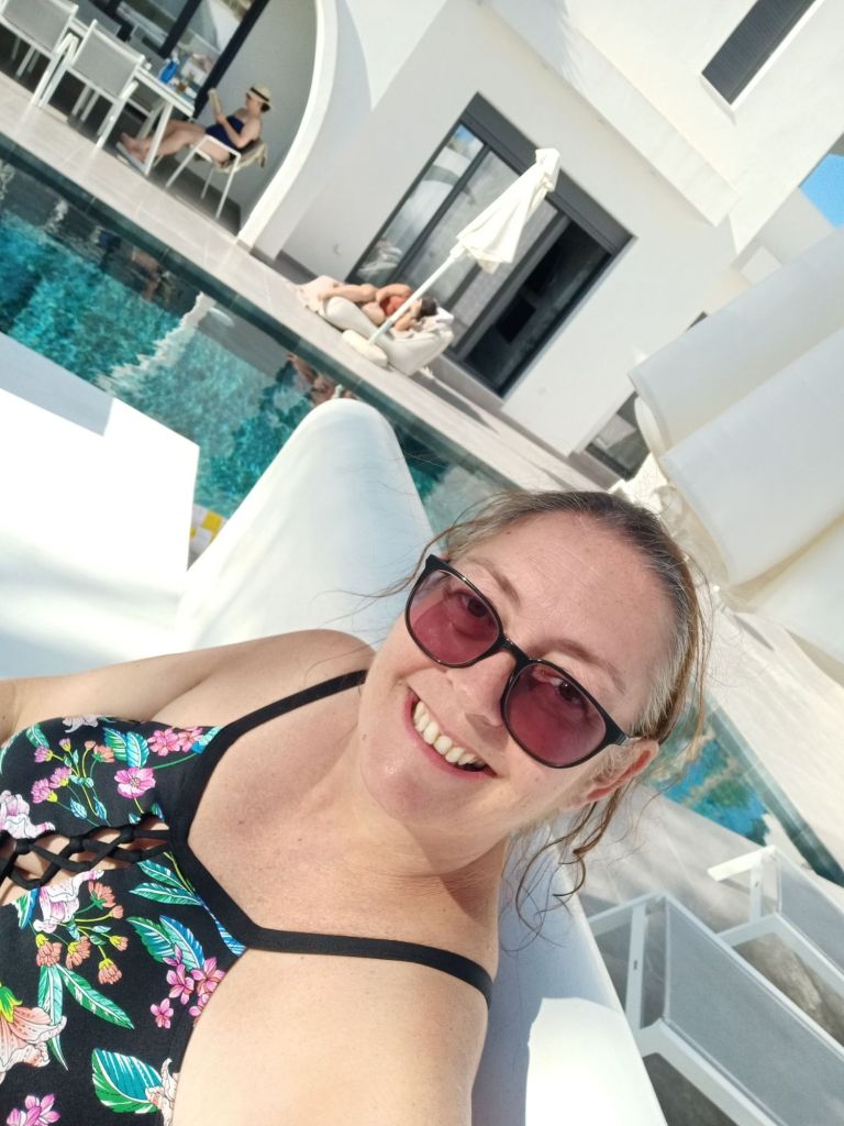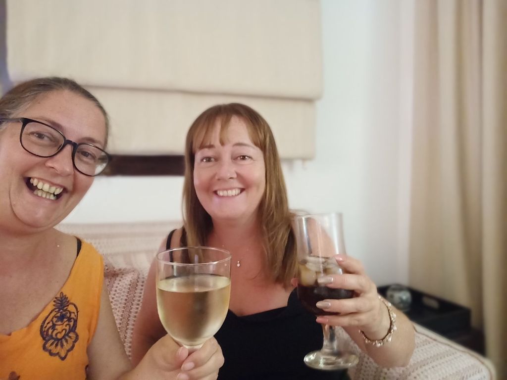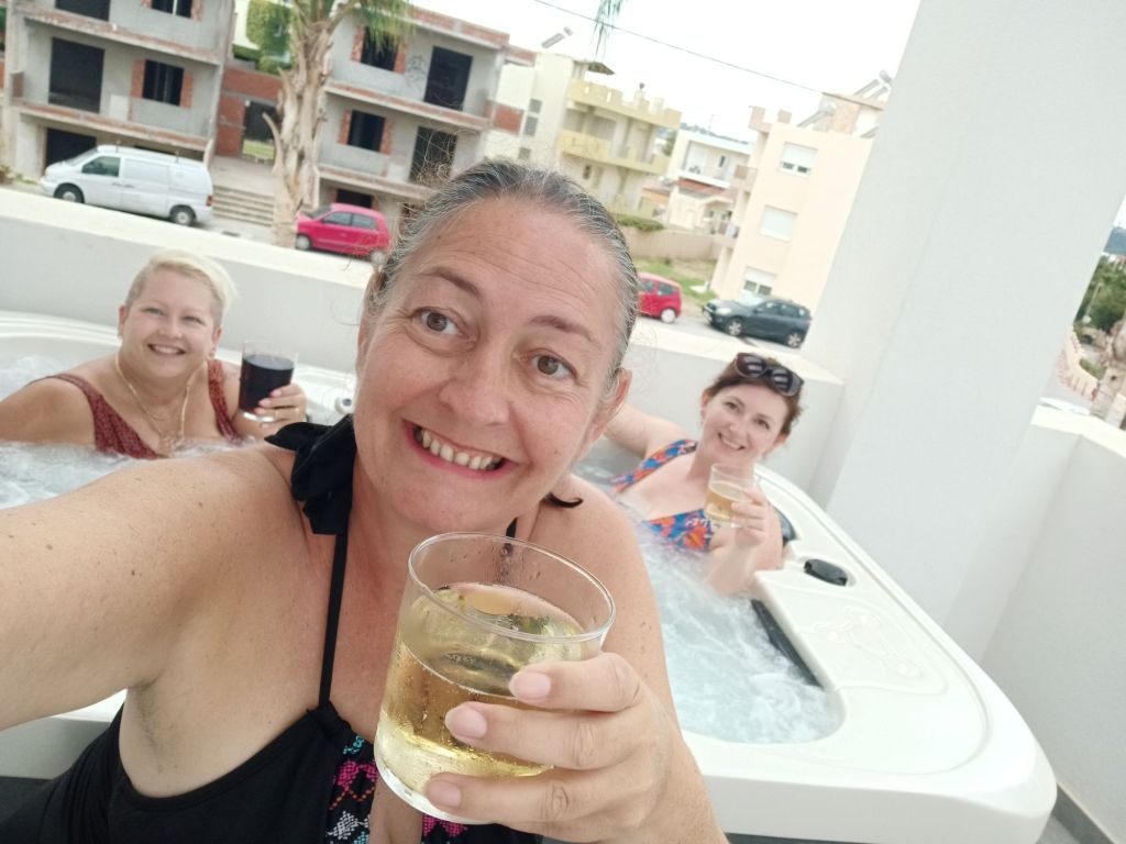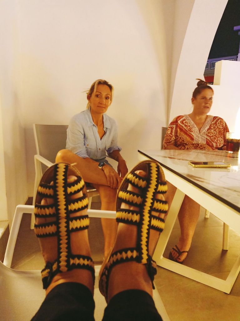 On the way back to the villa, we called at the supermarket for provisions too. Back ‘home’ I did a bit more work while the girls relaxed by the pool. I was happy to close the laptop and join them for crisps and a wine in the early evening. One of our other friends, Liz, was on her flight to come and join us. We were looking out for her plane, which would be flying directly above us. As we were waiting, we got a bit peckish and started our buffet for dinner, Kelly plated up some for Liz so that we didn’t eat it all. Clare took a video of the BA plane which Liz was on as she came in to land and we were all super excited when she arrived. There were hugs, tears and extraordinary footwear. Wine was had but not the fizz in the fridge as that was for when we went in the Jacuzzi in the main bedroom – oh wow, I hadn’t realised there was one! The rosé wine Clare and I had bought went down a treat and I even got to wear some fancy shoes of Liz’s while we caught up on her news. It was like having the band back together and I was so happy that Liz got the short straw and had to share my twin room for the next 4 nights.