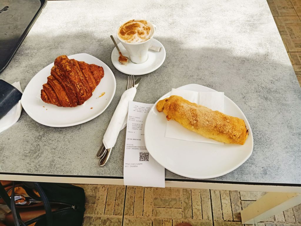 I was awake so early on Monday 16th September as the burglar alarm on the neighbouring villa was sounding continuously and it was very hard for me to ignore. It was still not properly light as I went downstairs and discovered that there was no electric or wifi and it looked to have been a windy night. It was only 6.30am so I decided to get dressed, I got to see a glimpse of a sunrise from my bedroom balcony, before I went out for a walk. I had no clue where I was going so I just headed away from the ringing of the alarm. It was quite cold and I had popped on my jeans and a jumper for the first time in a month. In fact, this was one of my outfits that Clare had brought out for me. I took photos as I walked, in case I got lost and then I decided on getting some breakfast and something for lunch at a lovely café called The Cake Box, here’s what I had with prices in Euros;