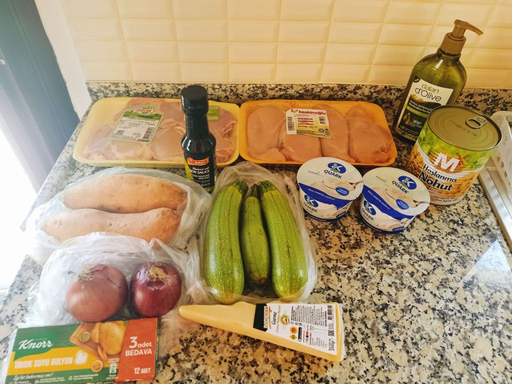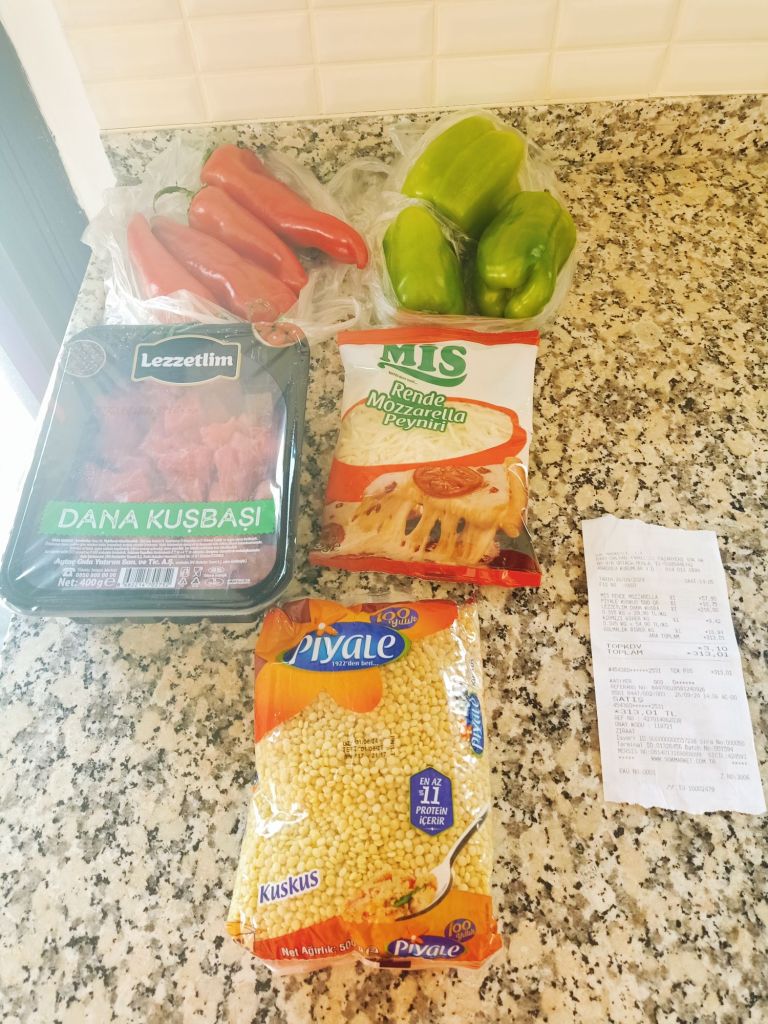 Şok Supermarket Red peppers 9.42 Couscous 10.75 Green peppers 18.94 Mozzarella cheese 57.90 400g Diced Beef 216.00 Total spent 313.01 lira (£6.86)