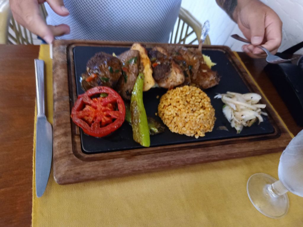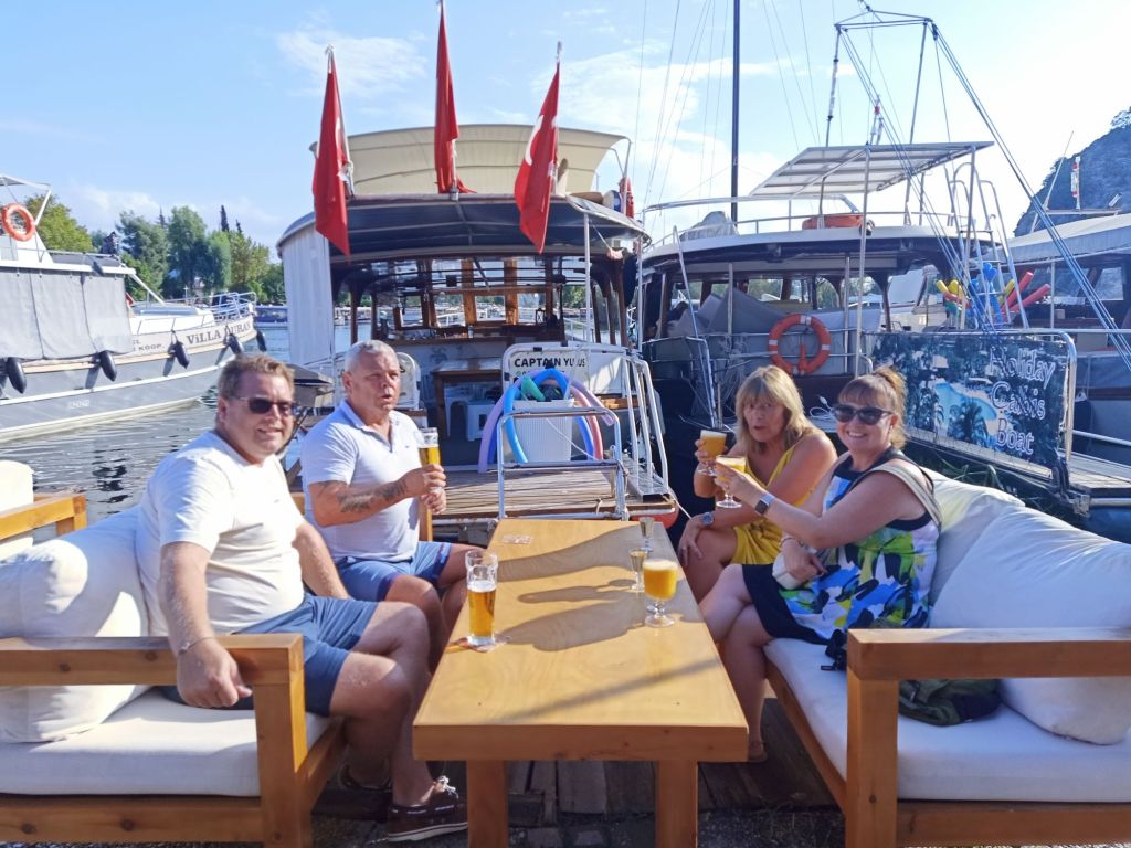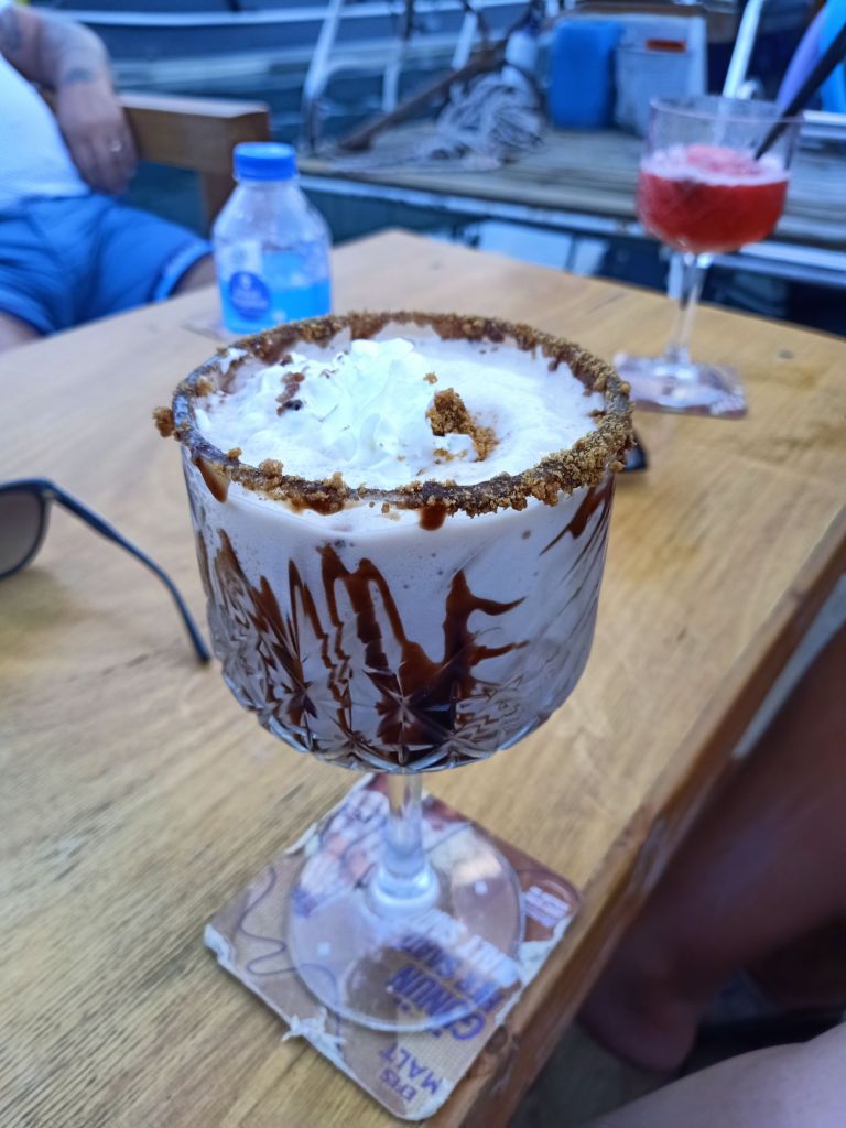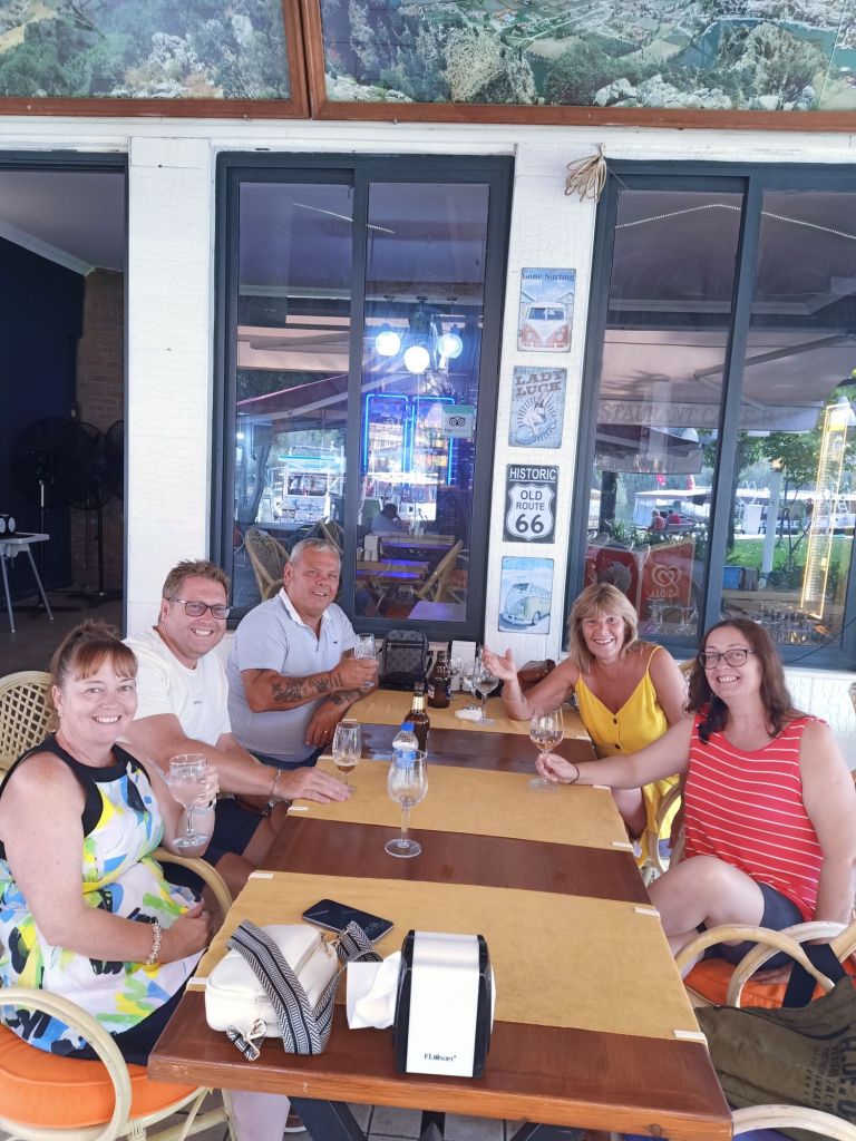 When we eventually got Gayle to drink some water and get ready to leave River House, on the afternoon of Wednesday 11th September, it was decided that we would go to Tapa for a drink. Ann wanted to introduce us to the delights of the pornstar martini which she had been impressed with there, and Gayle is partial to the odd Tapa cocktail too. Three pornstar martinis arrived for us women and the fellas had a pint of Efes each. The cocktails were impressively large for 350 lira (£7.87). On the next round I decided to have a whiskey sour as it was 2 for 1 on cocktail happy hour. Ann ordered a strawberry daiquiri and Gayle had been hankering after a marshmallow martini so insisted on one of those without checking the ingredients. When the barman brought it, Neil and I saw that it had sauce and biscoff all around the edge which probably contains gluten. I had the biscuit and scooped off the cream as Gayle was going to drink it. When she did drink it, she noticed there were no marshmallows in it and complained. The barman was not impressed with her and told her the marshmallows are only for children’s drinks. She was not happy! Neil told her to order something else so she got a pina colada, Ann stuck with the daiquiri and I asked for a wine which they didn’t bring in the end. Gayle was still going on about the missing marshmallows in her martini so the barman was now asking if she wanted him to go and buy her some, she said yes and pointed out the nearest shop. It was time to leave, we asked for the bill. Neil tried to pay on card, I tried to pay for Ann & Stuart’s and Gayle decided she was only putting so much cash in as she was drunk and unhappy with her drink. I ended up putting the rest of what Gayle should’ve put in instead of paying for Ann & Stuart as that was all the cash we had between the 3 of us. I bet Ann & Stuart thought we were a right set.