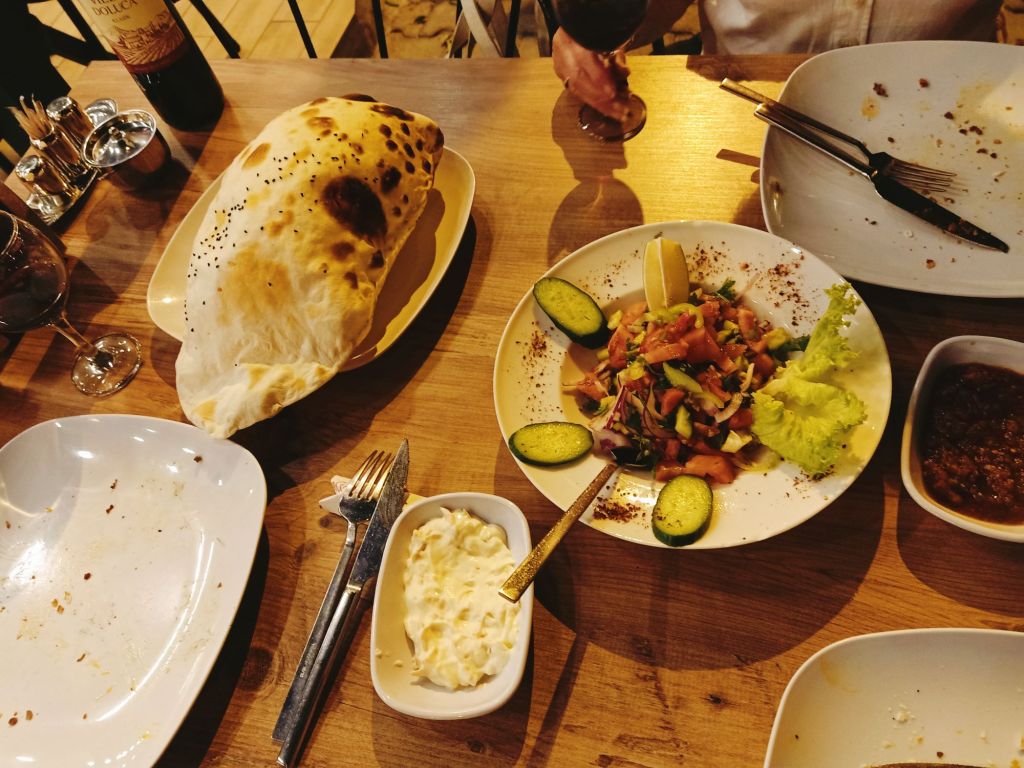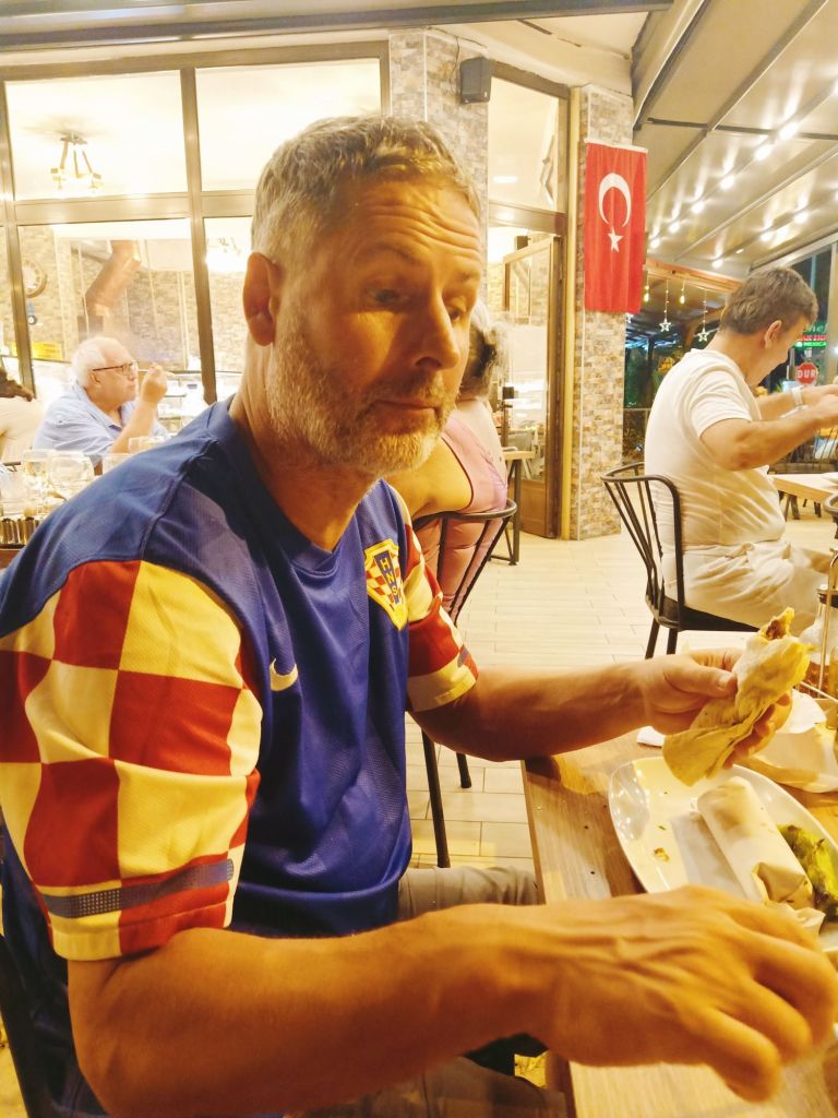 It was Linda’s last day in Dalyan so we had arranged to go out with her that evening, my parents were also invited but were already invited out by their friends. After feeding and taking the dogs out for an earlier walk than usual, we walked over to Kebapçı Yusuf to meet Linda. We were a bit early so I suggested that Captain Caveman take me to Ren Garden for a cheeky wine. I really like Ren Garden, which is a bar on the main Ataturk Street, at the back of it is Grandma’s Garden which is a lovely little hotel with a pool. The owners are very welcoming and the white wine is always fresh and cold. We both had a white wine and then walked back to meet Linda, who arrived at the same time as us. Our table was sat outside, while the weather was still nice and warm. We ordered a bottle of red wine and some lahmacun to be going on with. We all ordered different mains; Captain Caveman had a lamb wrap, Linda ordered a lamb shish and I chose liver shish. We shared one and a half lahmacun between us and a complimentary balloon bread (lavaş). I thought my meal was delicious and I was absolutely stuffed. The total cost for a bottle of wine, 1.5 lahmacun, 1 salad, and 3 mains came to 2500 lira (£55.80), so less than £20 each which was excellent value. After the dinner, we decided to walk Linda back to Riverside hotel and have a night cap, I messaged my parents to let them know, in the hope that they could join for a last drink and say farewell to Linda. Luckily, they were finished eating and were able to pop along. We had a lovely last evening with Linda and it looked like it wouldn’t be her last visit to Dalyan, either.