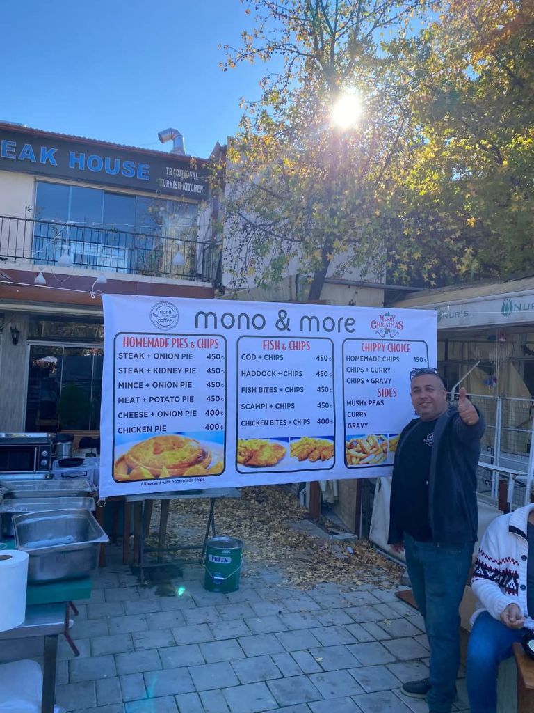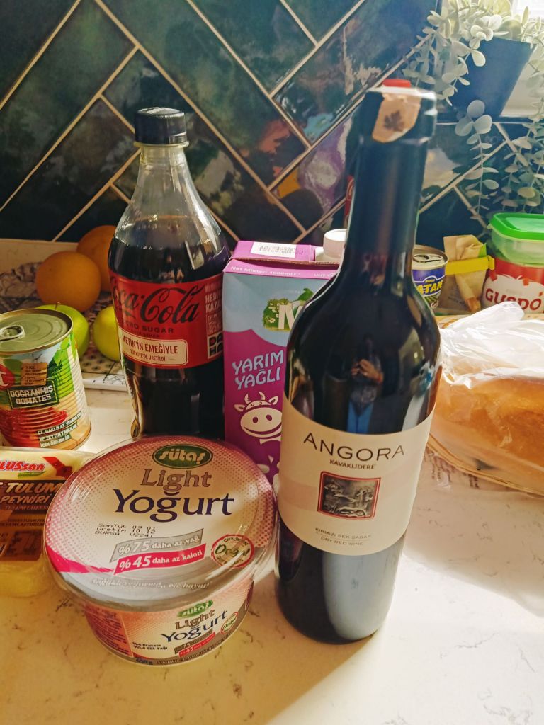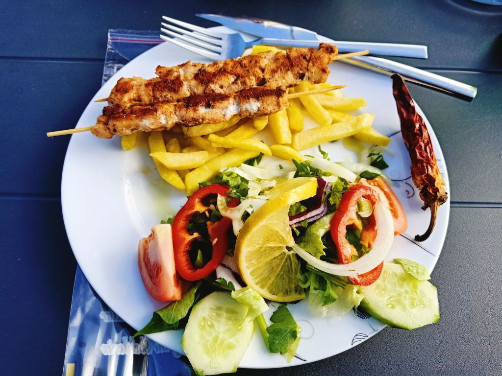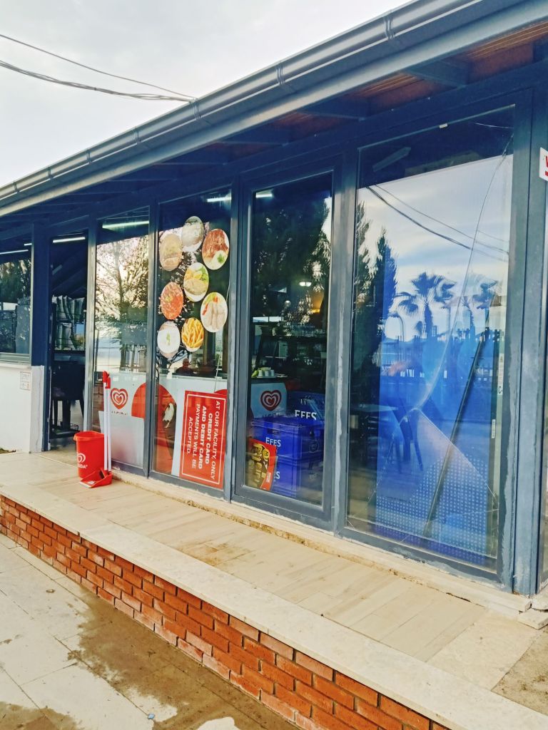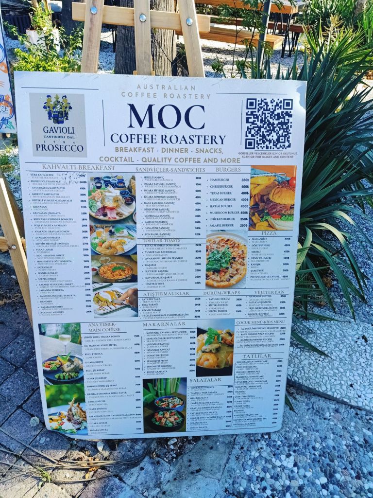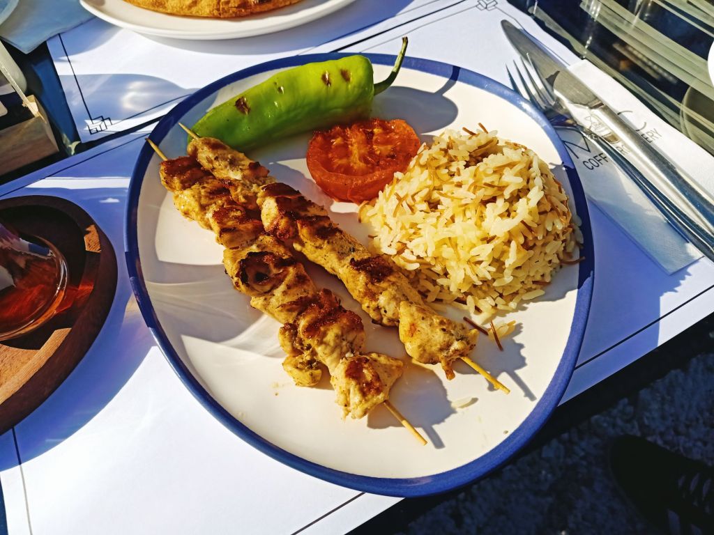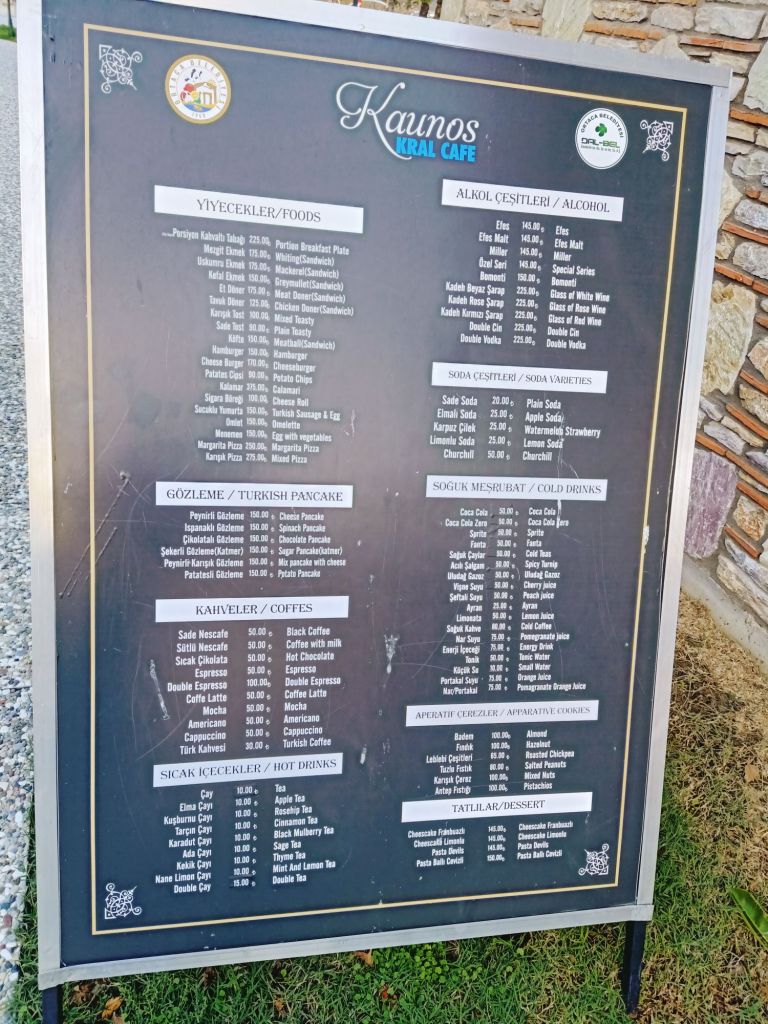 It was cheaper than the Dalyan market but we had paid 400 lira (£9.03) each for the trip, so it’s not something we could do every week just for the shopping. I wanted to get some cheese but there was a queue and we were getting peckish. We decided to walk over to the tea gardens right on the end of the promenade as they have good value, tasty Turkish food. Captain Caveman had an Efes Malt, I had a lemon soda and we mistakenly only ordered one main meal of a chicken shish and ended up sharing it. We also got loads of bread with it so there was plenty of food. Here’s what we paid, in lira;