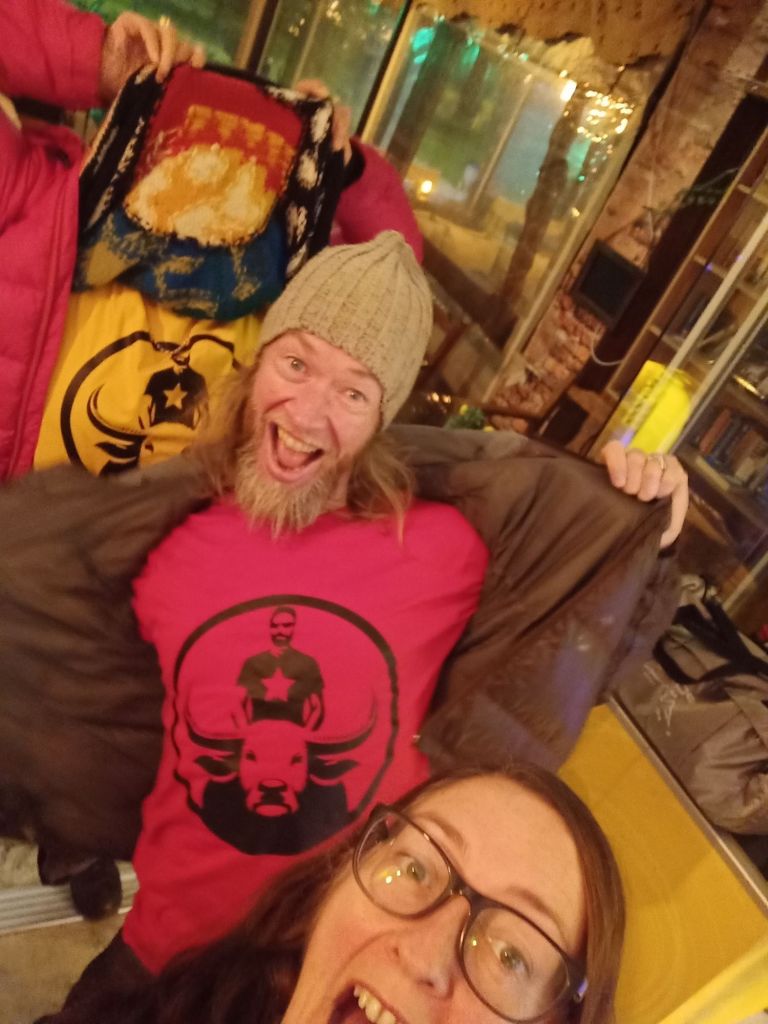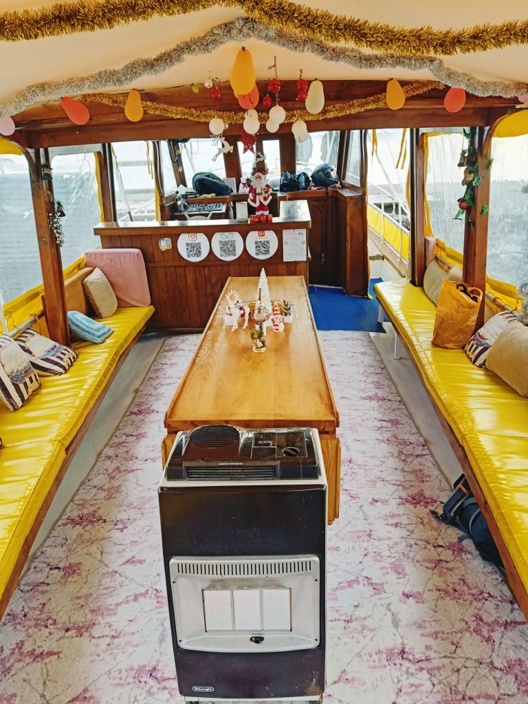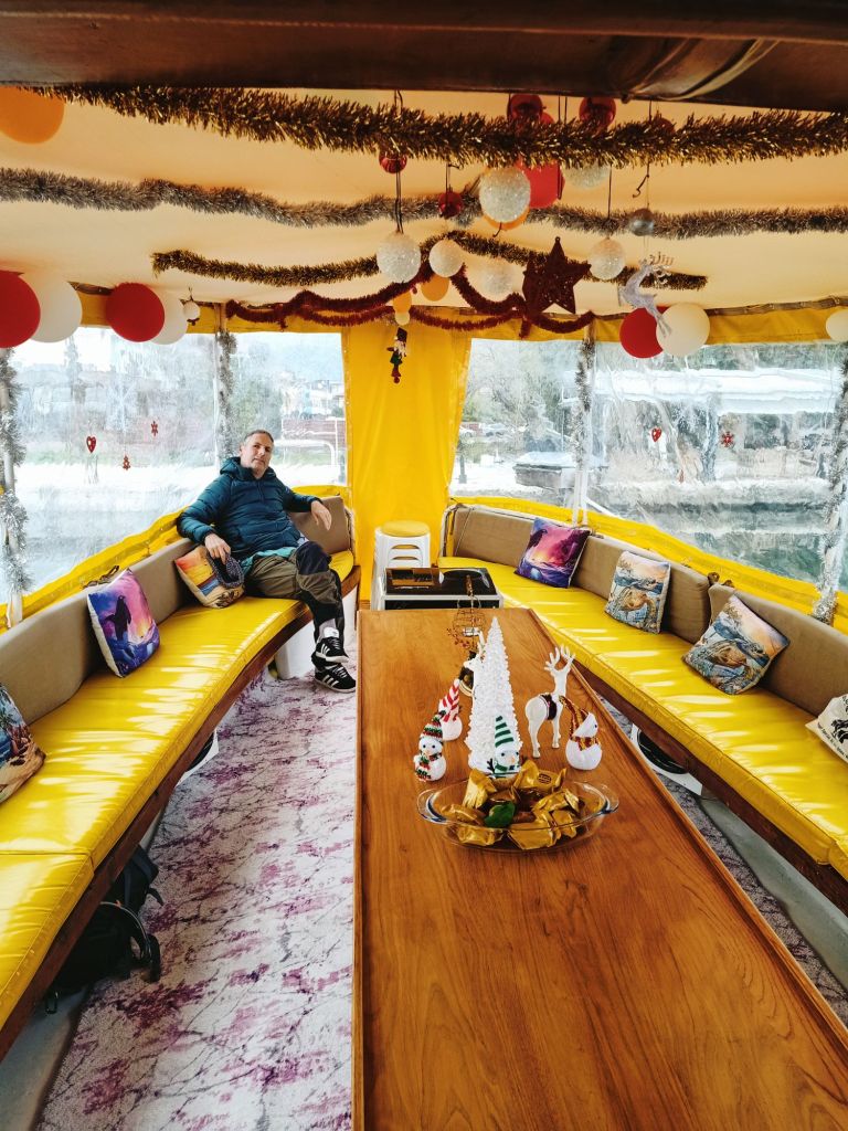 When we got on to the boat, it was all trimmed up in a Christmas fashion and had 2 Calor gas bottle heaters, on full blast to keep us warm. There was tea and coffee being served by Waterlilly and she asked after my parents. There was a nice group of 10 of us and it was good to see Adam & Kath who have become good friends of my parents and we had a little catch up. Kath asked why she’d not seen me in the bars on any day or night with all the usual Dalyan Dwellers. I explained that for health and money reasons we were not able to go out like we were on holiday (as we aren’t) and that I had cut right down on alcohol. I said I was tired of not reaching my weight target and spending too much time out in bars so I distanced myself a bit from the drinking culture in Dalyan in order to achieve what I wanted and to concentrate on my new job.