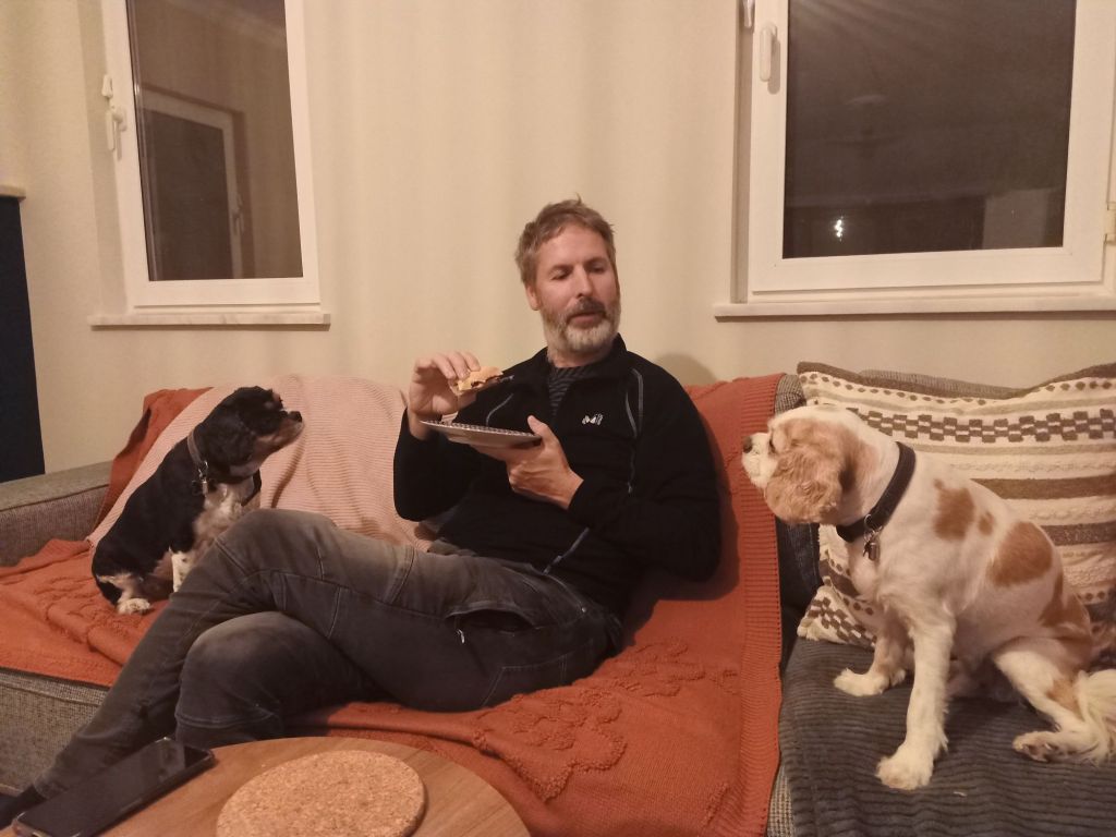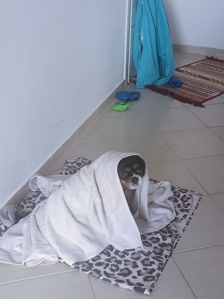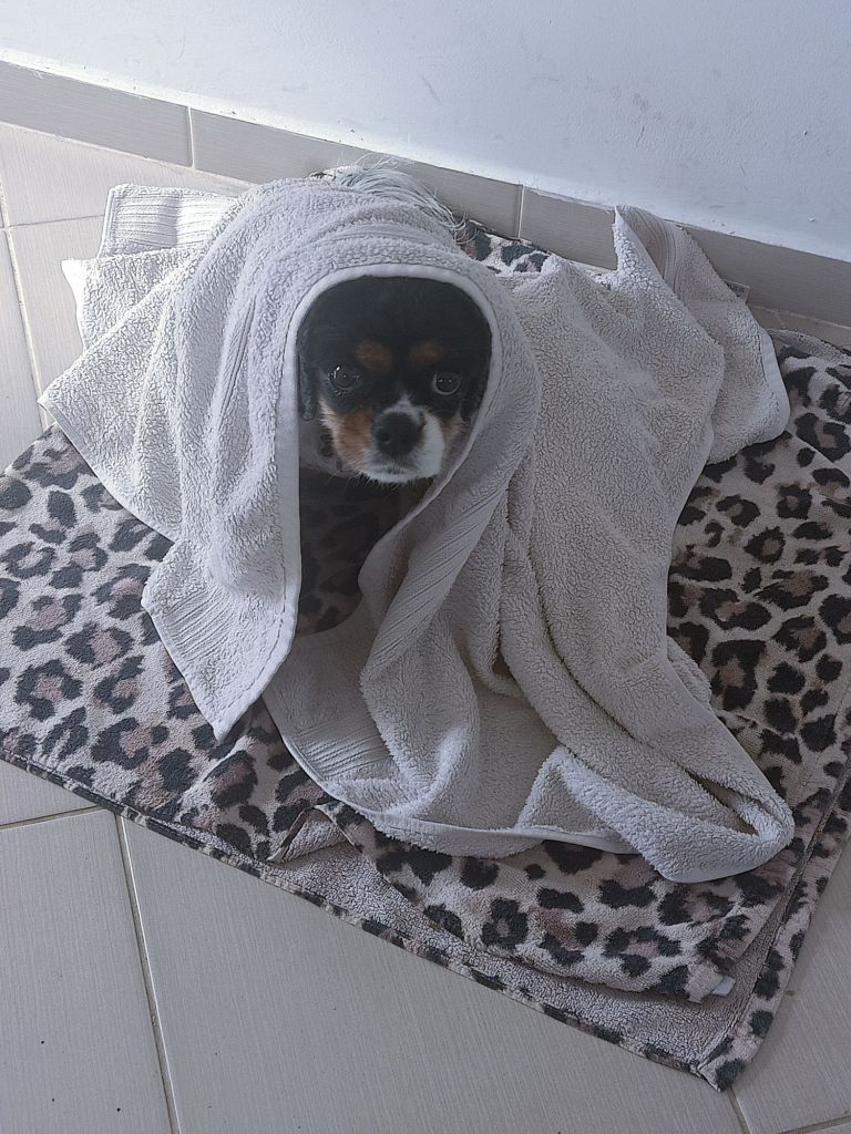 The weather wasn’t too good but we managed to get the dogs over to Fire Opal just as it started to rain heavily. Edna really wasn’t impressed and had to be wrapped in towels.