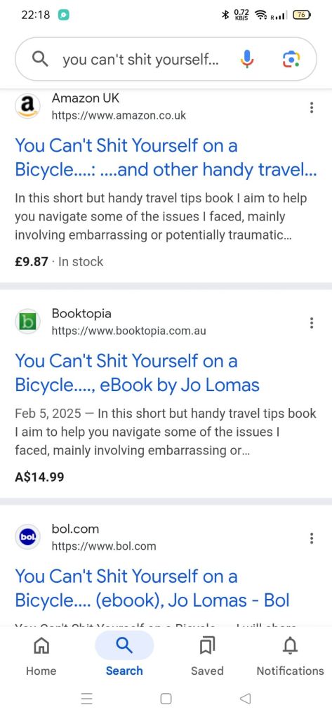 If you aren’t in the UK you can also find my book on Amazon in USA, Australia, Spain, France and a few other countries by searching the title ‘You Can’t Shit Yourself on a Bicycle’.