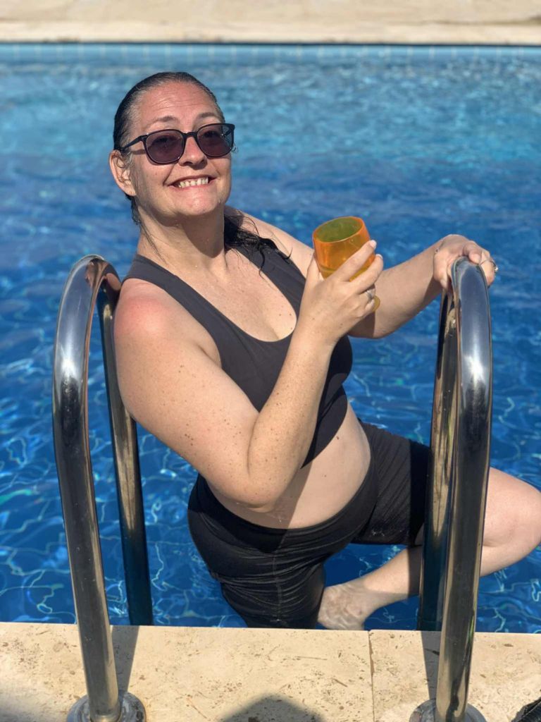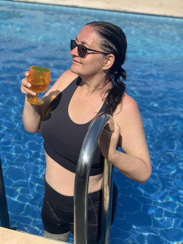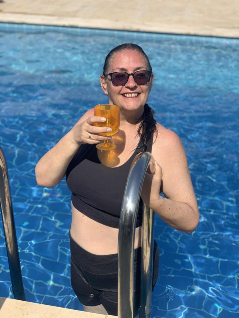 I went downstairs, it was already 11am and I was meant to have been going for a walk with Vanessa at 10am. She had already been to call for me and had assumed I was still in bed. No one had a phone charger to fit my phone and I had a bit of a panic that I might need it. We established not having my phone on for a change would do me good, but I had to ask Mark to call Matt to explain why I wasn’t at home. Mark made me a cup of Yorkshire tea and Kate made me a slice of homemade sourdough toast with homemade marmalade for breakfast. By 11.30am Glynn had popped round and offered to give me a lift in to town when he left so I thought that would be a good idea. However, once Mark’s sister, Tracey and Kate were in the pool it seemed like a good idea and I got in, wearing my cycling shorts and sports bra. I was meant to be meeting other friends, with it being my only day off and I’d likely made loose plans.