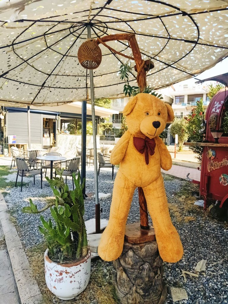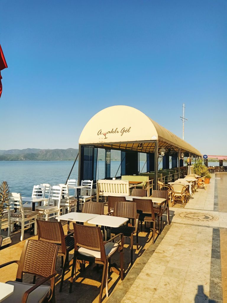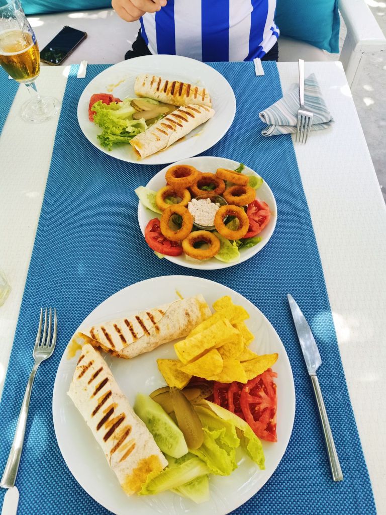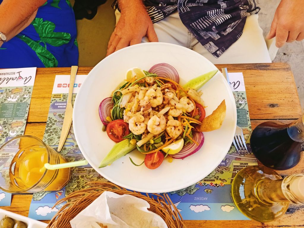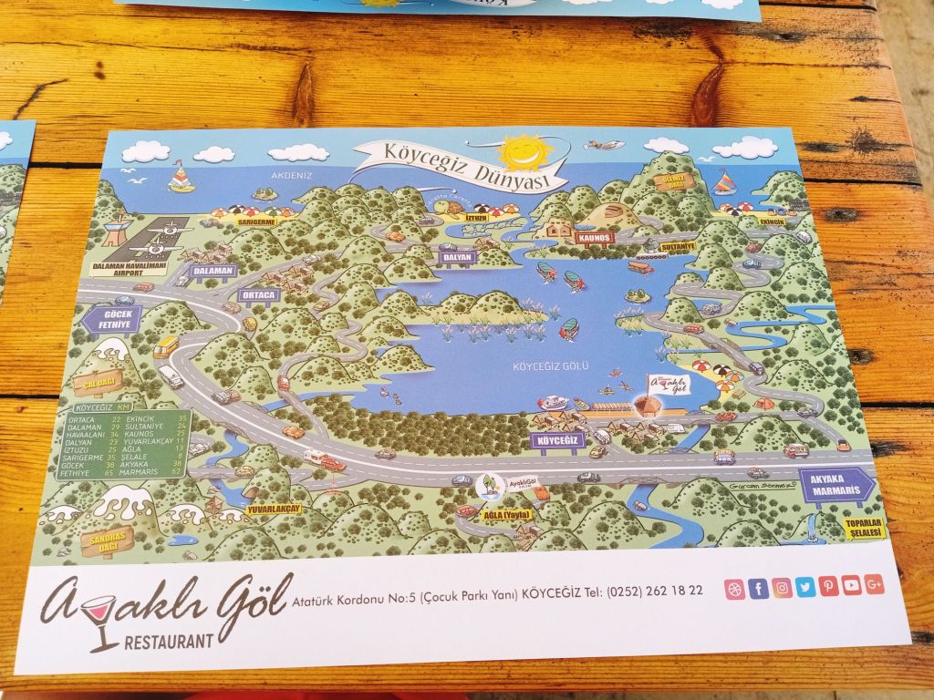Of course, the swimming pool was in the shade, it was numbingly cold to swim in at 10.15am but I suffered it. Captain Caveman lay on a sun lounger on his phone and at noon we met up with Janet & Ian for a lovely walk through the park which I didn’t even know was there. The sun was hot and I was glad I had my cycling shorts on to prevent the chub rub. We stopped for a drink at the council run cafe where there’s a small bit of beach. Captain Caveman must’ve been on the mend as he ordered a shandy! For lunch we went to Ayaklı Göl restaurant which I’d been to before with Janet and Ian. It’s located on the waterfront and has a really good choice of food, which is very tasty. The place mats are maps of the area so I kept one to bring home. Here’s what we ordered with the prices in lira;
