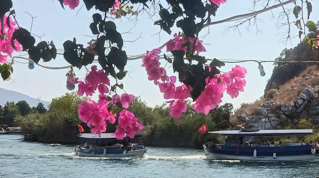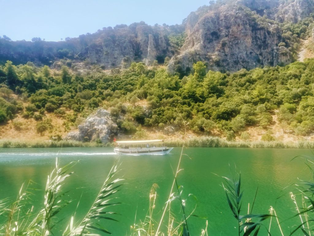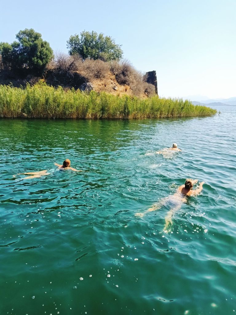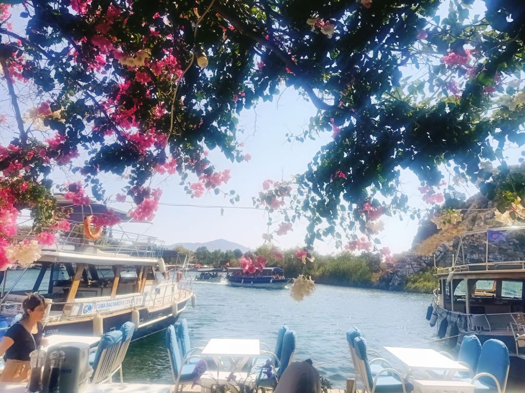 While friends in the UK had a bank holiday on Monday 25th August, Captain Caveman and I were off on another adventure from Dalyan. I’d arranged to join a friend’s boat trips to the Köyceğiz market and then I had booked a night in the Kaunos Hotel. It did mean we had almost a full day on Adıl boat with Captain Fuat and all the lovely guests. We were meant to set off at 9.30am so I was on at Captain Caveman to be on time, he seemed to have increased the amount of times he leaves thing to the very last minute. This means he can rush there but then it always looks like I’m the late one as I can’t keep up. He wasn’t ready, so I decided to take the bin out and said I would wait for him by the bins. It was hot, I waited ages, he never arrived. I called him but he didn’t answer his phone. I walked back to the apartment and he wasn’t there so I decided to walk to the boat – he was already on it, sat playing Bridge on his phone and we had our first fall out! Captain Caveman was annoyed that I lost my temper at being stood by the bins in the hot sun while he had gone to the boat a different way, not even passing the bin! He then retaliated by going quiet and going on his phone rather than speaking to anyone. We set off late so Captain Caveman was annoyed at me nagging him to not be late so the trip didn’t get off to a good start. I soon forgot about it when Captain Fuat got out the cake for breakfast. We sailed to Prison Island where some had a swim around it but I was conserving my energy for a swim in the hotel pool later; so we just had a shorter swim. The lunch was a feast of many delicious dishes and Captain Caveman and I had a beverage or two! When we got to Köyceğiz, we paid our 2000 lira (£37) bar bill, in addition to the £30 each for the boat trip and said farewell. Our friends on the boat had an hour in Köyceğiz while we were going to check in to the hotel and return tomorrow.