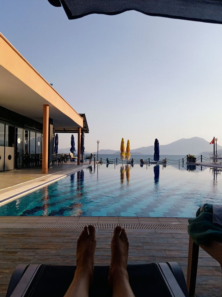 We got back to the hotel around 5.15pm and went to get our swimmers on. Again, Captain Caveman wasn’t as speedy as usual and by the time we got down to the pool it was almost 6pm. Unfortunately, the pool was closed for cleaning so we were unable to use it and I was so disappointed – it was the main reason for choosing this hotel. I couldn’t believe it was almost the end of August and I’d still to swim in a swimming pool! The pool man could see my frustration and came over to show me the signs and explain that the hotel pool is always closed from 5.45pm until 10.15am for chemical treatment. In just my swimwear I went off to the reception to check what time we had to check out. I was flabbergasted to find we had to be out by 10am, 15 minutes before the pool opened! I said to Captain Caveman that we would check out tomorrow but then come to the pool until midday and he agreed. I also insisted we sit on a lounger by the pool for half an hour now, just to get some photos of the pool and hotel grounds.