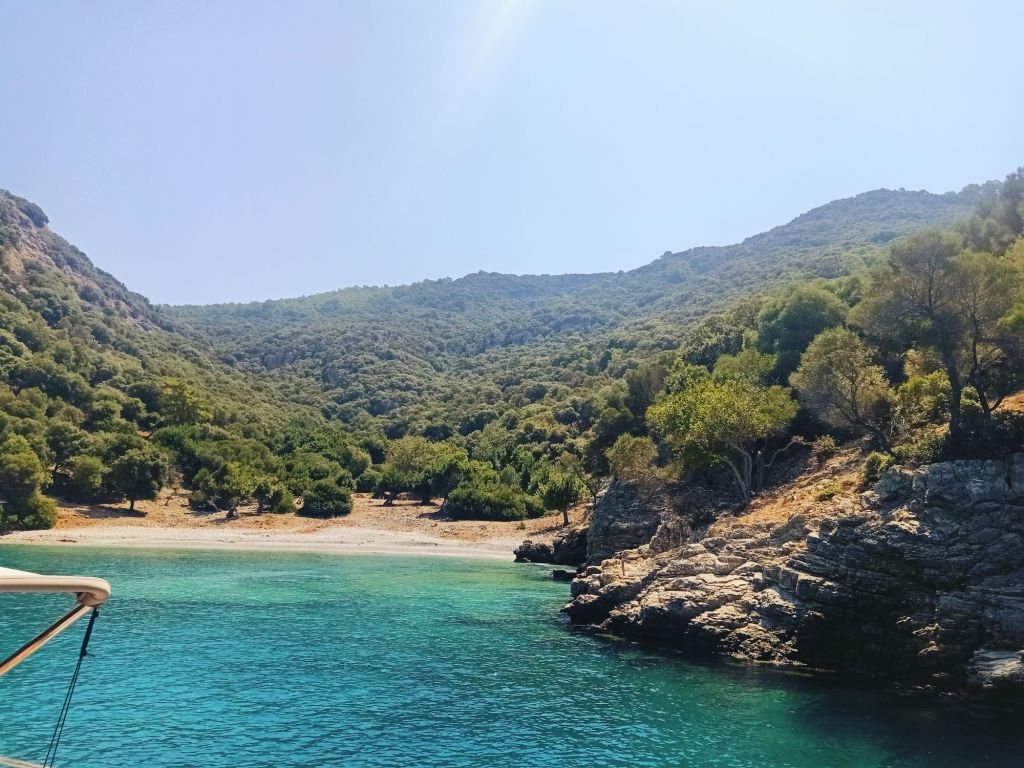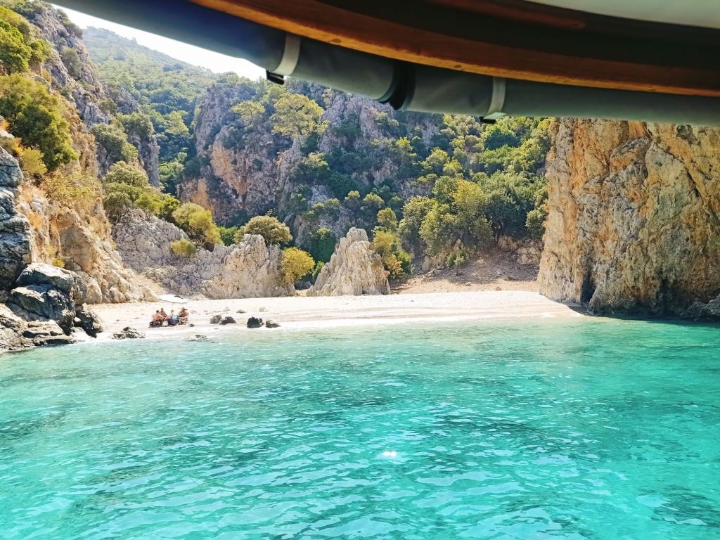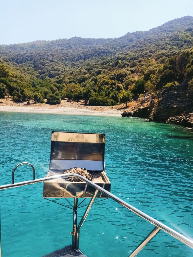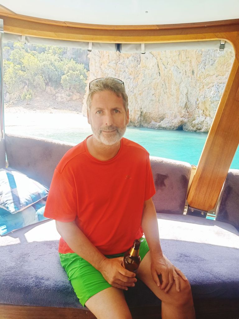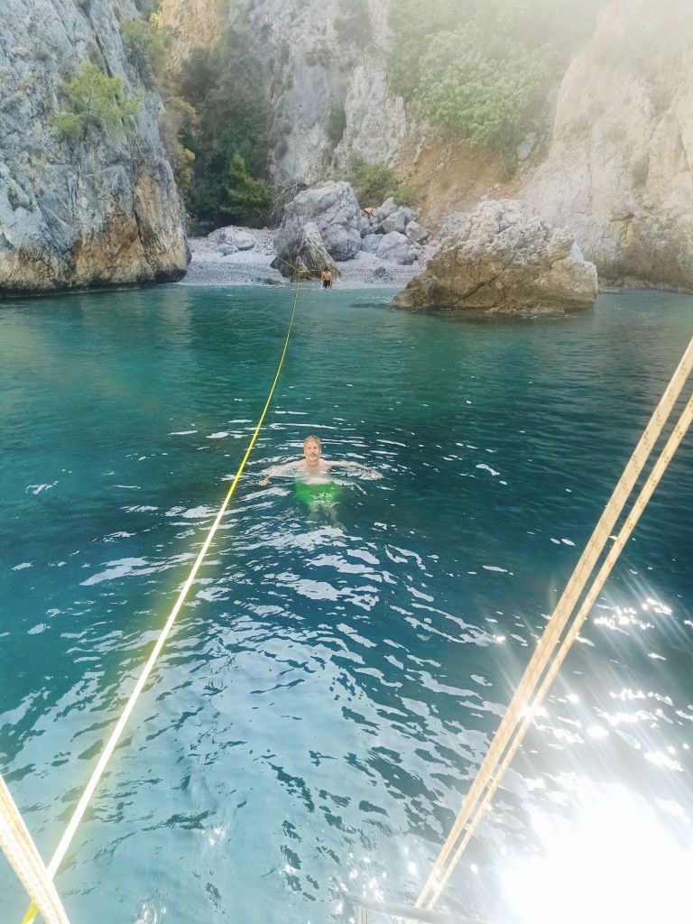 By 12.30pm, Ünal had started the BBQ and we ate lunch around 1.15pm in a bay on our own, except for a few Turkish men who ate on the beach, having arrived by speedboat. They seemed to be quite taken with the young girls on board and went past a few times to ogle! Lunch consisted of several mezes, bread, hot chips, chicken and meatballs – again, all excellent. Captain Caveman drank Efes Malt and I had rosé wine. There were lots more swimming and drying off in the sun before sailing to a secluded spot to scatter some ashes of the young man’s father. I’d found myself sat in the middle of the family, so I excused myself and we gave them some space to say a few words and support each other through the tears. Captain Caveman and I raised a glass for the poor guy as a mark of respect and kept quiet while they did what they needed to do. I didn’t know the bloke but I think he would’ve been pleased to be scattered where he was, in such a beautiful place.