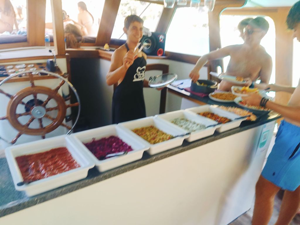 It was time for another boat trip on Friday 29th August, this time with Captain Ünal on Villa Duran Boat Trips. We had booked it at short notice when a couple of spots had become available due to a cancellation. It was going to Devil’s Bay, cost £40 each and included breakfast, lunch and afternoon cake and fruit. We were on board before 9am and the boat departed from very near to where we live so there was no falling out this time. Apo, the Captain’s mate, made us all a hot drink and we set sail towards the sea. The breakfast consisted of bread, cheeses, salad, olives, eggs, cheese rolls, jams, honey, and fruit – it was excellent. I’d took a travel sickness pill just in case. The sea wasn’t too choppy so we were moored up in a quiet bay for our first swim. On the boat were various passengers, none of who we knew already. There was a family on who were friendly and funny so we got talking to the son who was a nice young man. We gave him scores for his diving off the top of the boat.