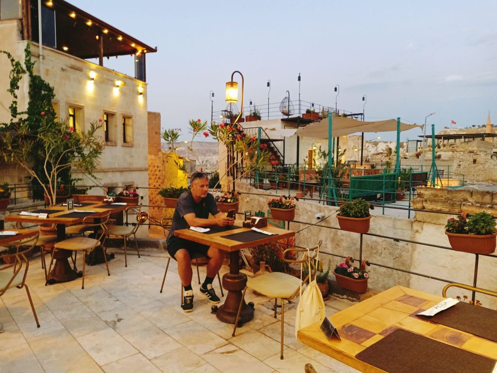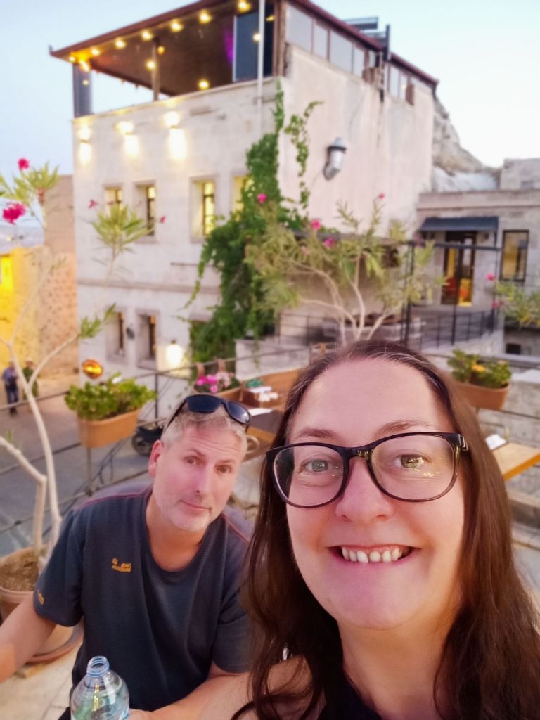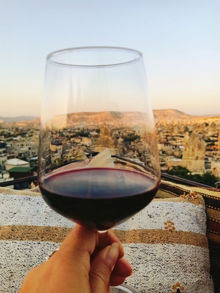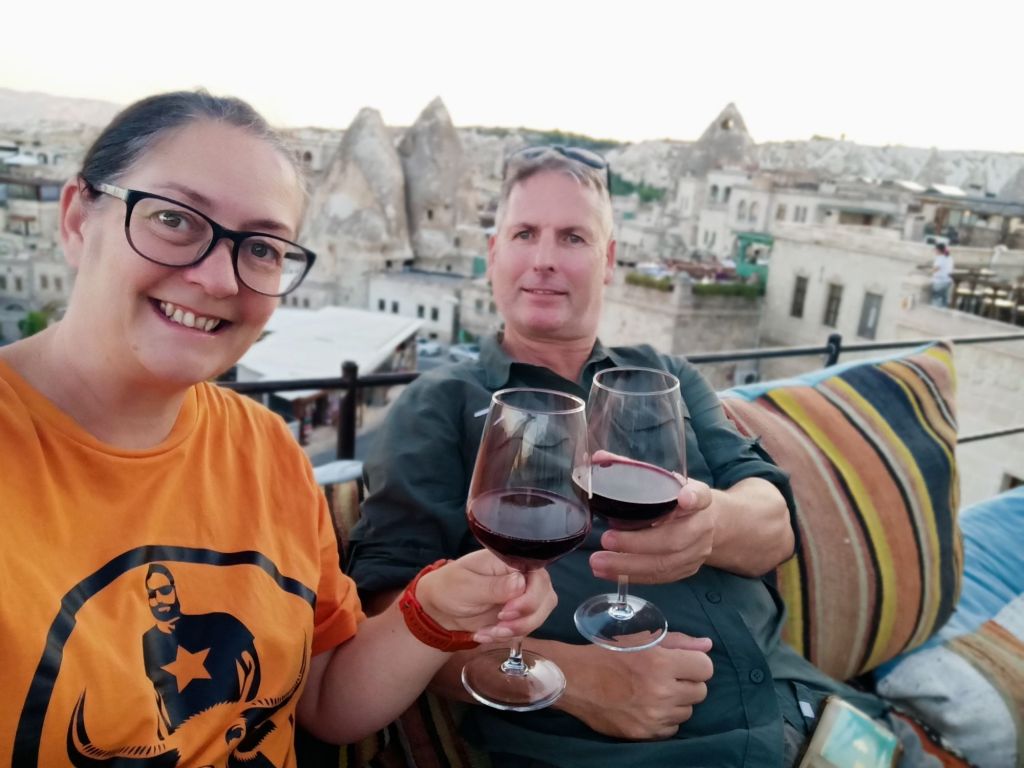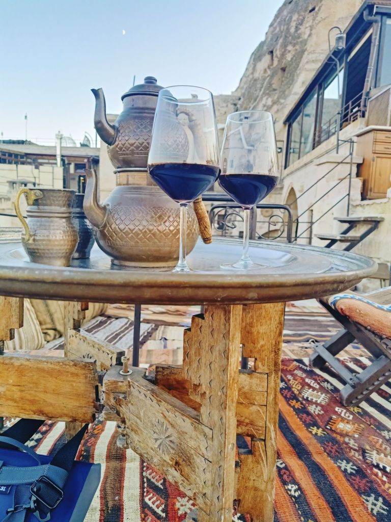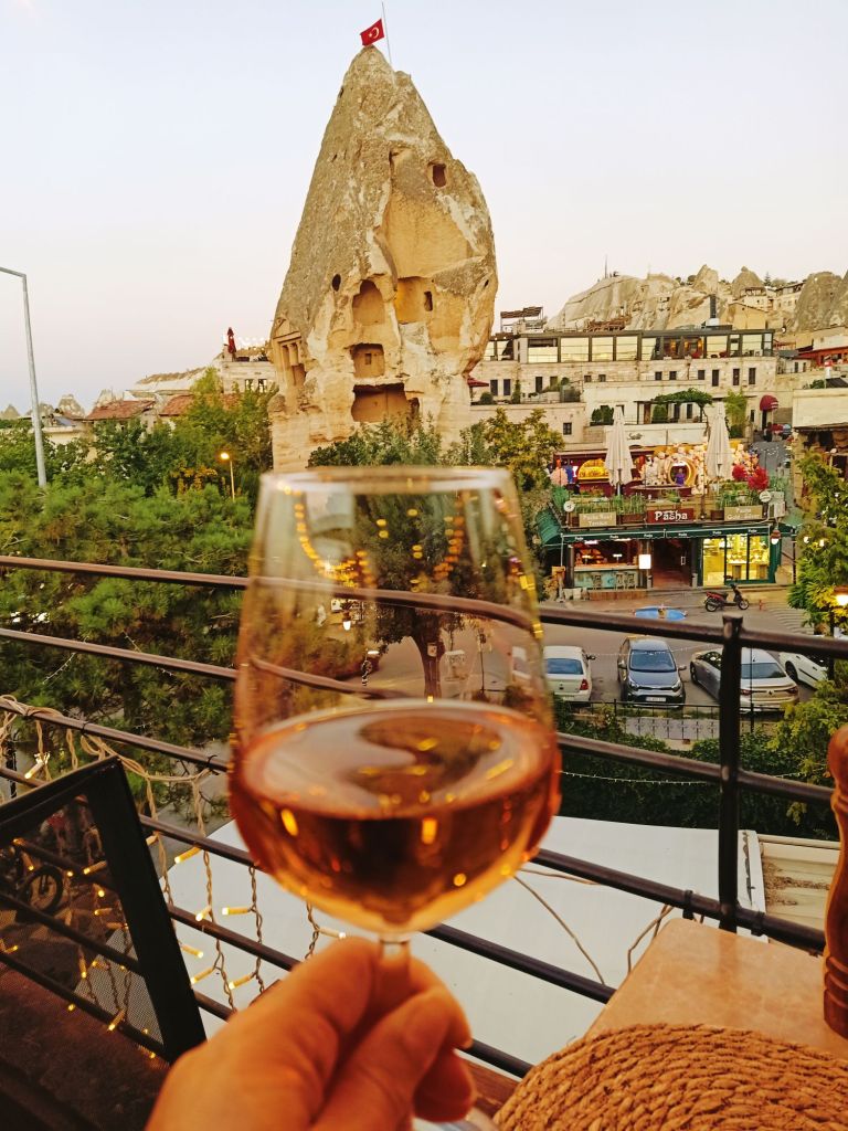 For sunset we walked around the hotel then sat on the hotel terrace with a glass of wine each and took the obligatory Cappadocia skyline photos. I went to pay the bill and was quite surprised to find it was 880 lira (£16.30) for 2 glasses of red – luckily we just had the one!