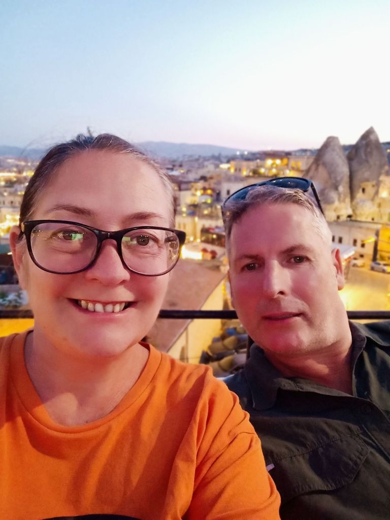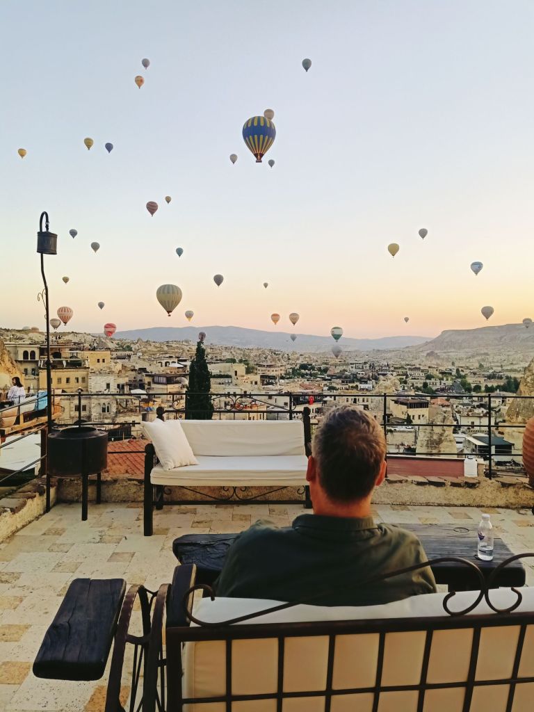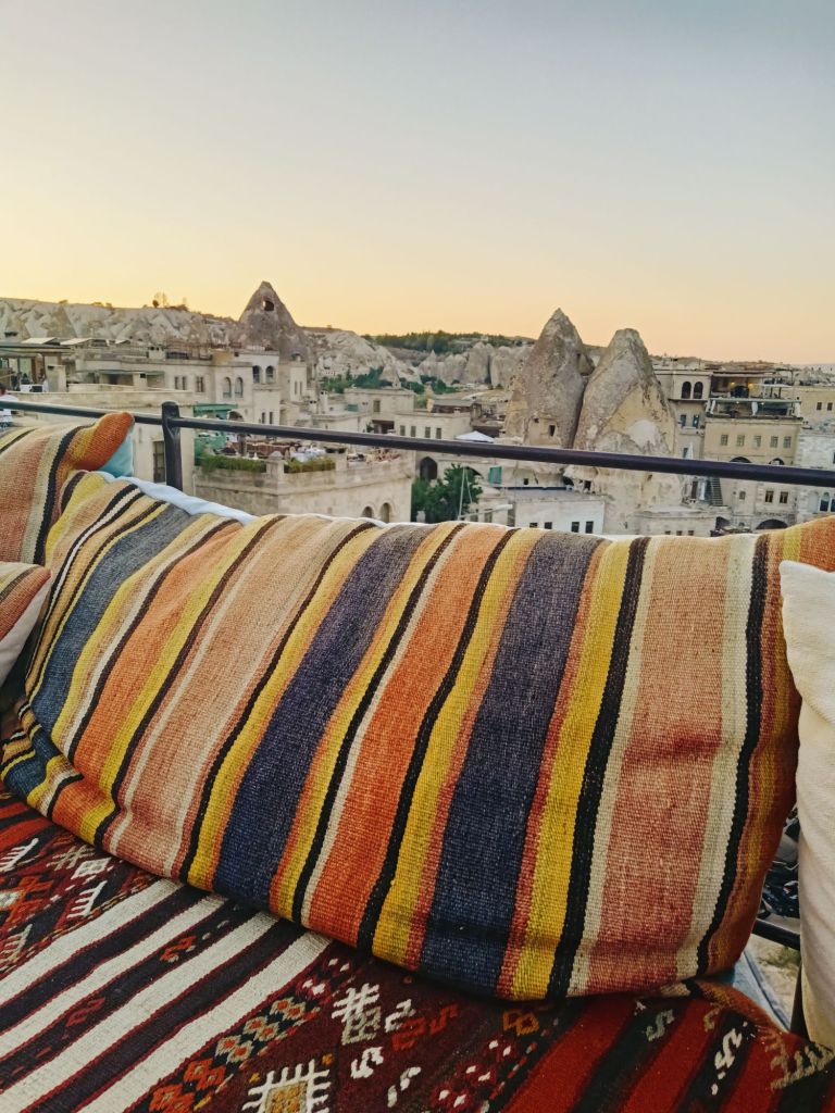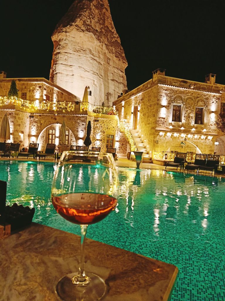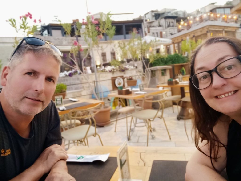 For sunset we walked around the hotel then sat on the hotel terrace with a glass of wine each and took the obligatory Cappadocia skyline photos. I went to pay the bill and was quite surprised to find it was 880 lira (£16.30) for 2 glasses of red – luckily we just had the one!