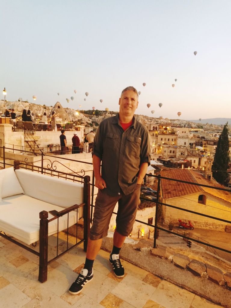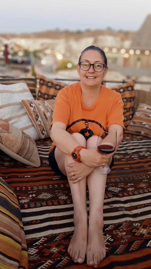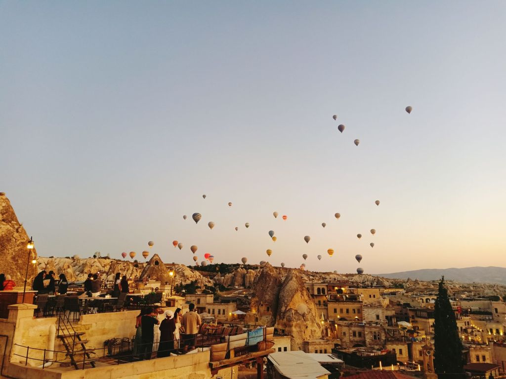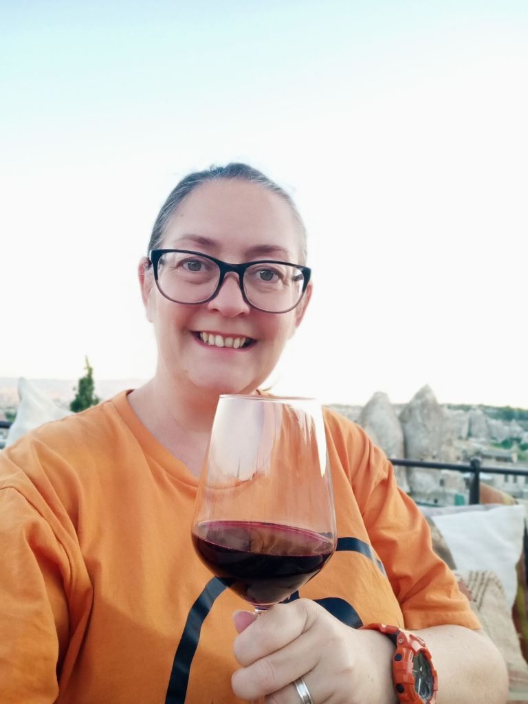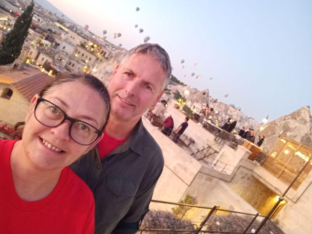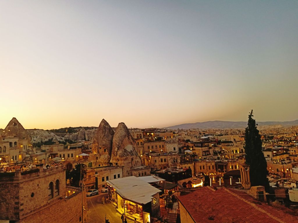 For sunset we walked around the hotel then sat on the hotel terrace with a glass of wine each and took the obligatory Cappadocia skyline photos. I went to pay the bill and was quite surprised to find it was 880 lira (£16.30) for 2 glasses of red – luckily we just had the one!