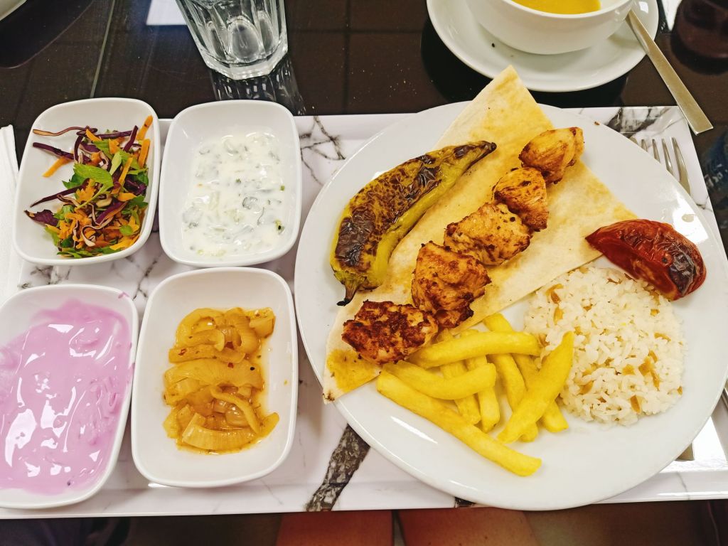 2 Lentil soups 250 1 Haydari 155 1 Beetroot 160 1 Hummus 170 1 Potato croquettes 165 1 Prawns 495 1 Liver & Onions 295 1 Red wine 140 1 Big Water 95 Tip 200 Total spent 2,125 lira (£38.64)
