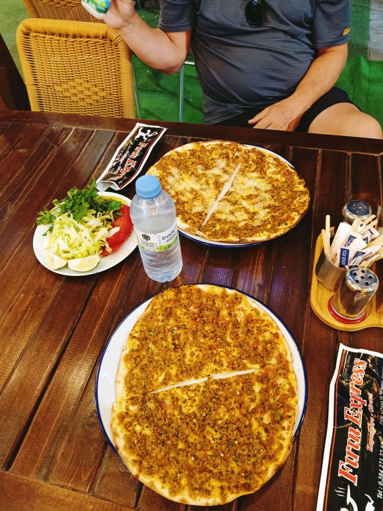 We’d seen a hotel with a gorgeous swimming pool which we wished we had booked so we decided to go there for another glass of wine and a nosey round the hotel. It was just 770 lira (£14.26) for 2 glasses of wine with a 10% tip but with a poolside view. I spoke to a member of staff to see if they had rooms to stay there after our current hotel booking finished. He made us a deal for €160 (£140) for a good room and we thought about booking it tomorrow. For dinner we went to a restaurant opposite where we had eaten last night. Turkish Ravioli had a more varied menu and we had a bit of a feast, they didn’t sell alcohol, though. Here’s what we had with prices in lira;
