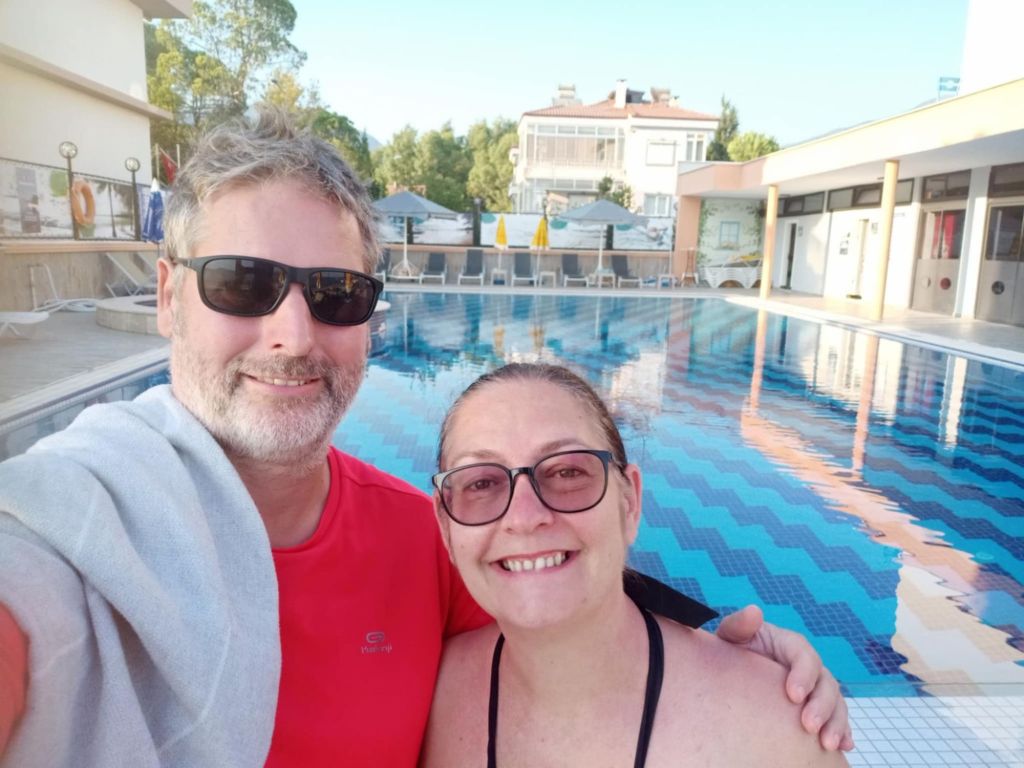 Just over a tenner for lunch by the lake seemed a good deal to me. Captain Caveman was definitely feeling better as he had a Belfast beer. We strolled back, feeling full and then Ian drove us all back to Dalyan. We had intended on going home, however, we decided to have a stop off at Janet & Ian’s where we all got in the pool. It had been a very hot day so it was really nice to cool off, and their pool was very lovely! After rehydrating with water, I had a glass of wine, Janet and Captain Caveman had some flavoured gin and Ian doesn’t drink alcohol. We had a really good laugh and didn’t even realise the time until it had gone dark and we thought it prudent to go home! I still had a load of cheese in my bag and all the bits we didn’t eat last night, because of Captain Caveman’s sickness.