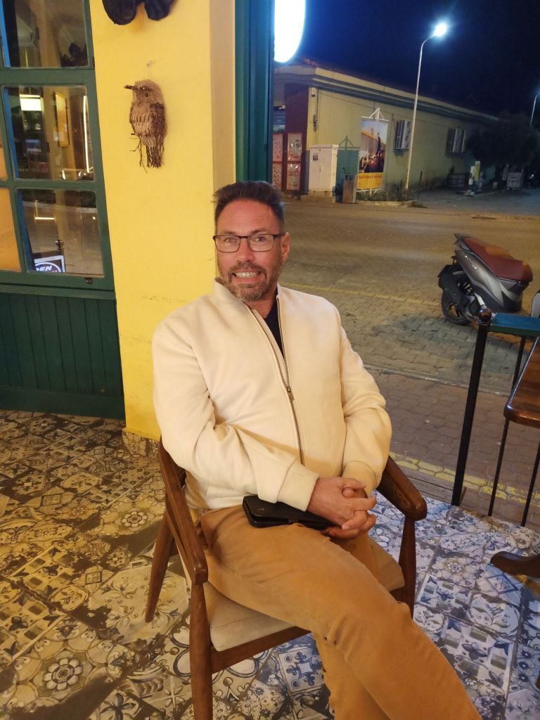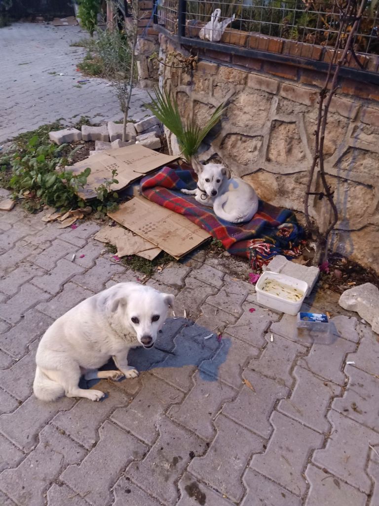 I worked hard at my laptop until lunch then made a Slimming World friendly pizza from a wholemeal wrap. I had a quick video call with Captain Caveman who was excited to be getting out to Dalyan tomorrow. I’d been invited to Jamie and Drew’s for dinner and then we decided we would have a Friday night out. On my way to feed the cat again, I picked up a bottle of red Angora wine for 415 lira (£7.55) in Yaman Büfe 2. I also stopped to check on the 2 white dogs who were now firm friends.