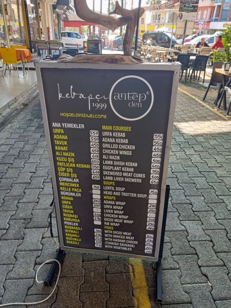 After dropping the shopping back in Dalyan, I went to feed my friend’s cat and we had sausage casserole for dinner again. This time Captain Caveman had the leftover lamb added to his. Later, we headed to Ozzy’s bar to meet my parents for a farewell drink. Here’s what we had with prices in lira;
