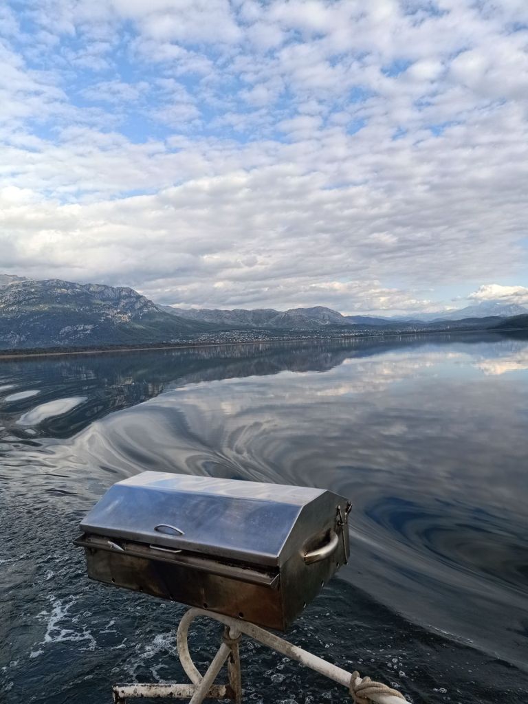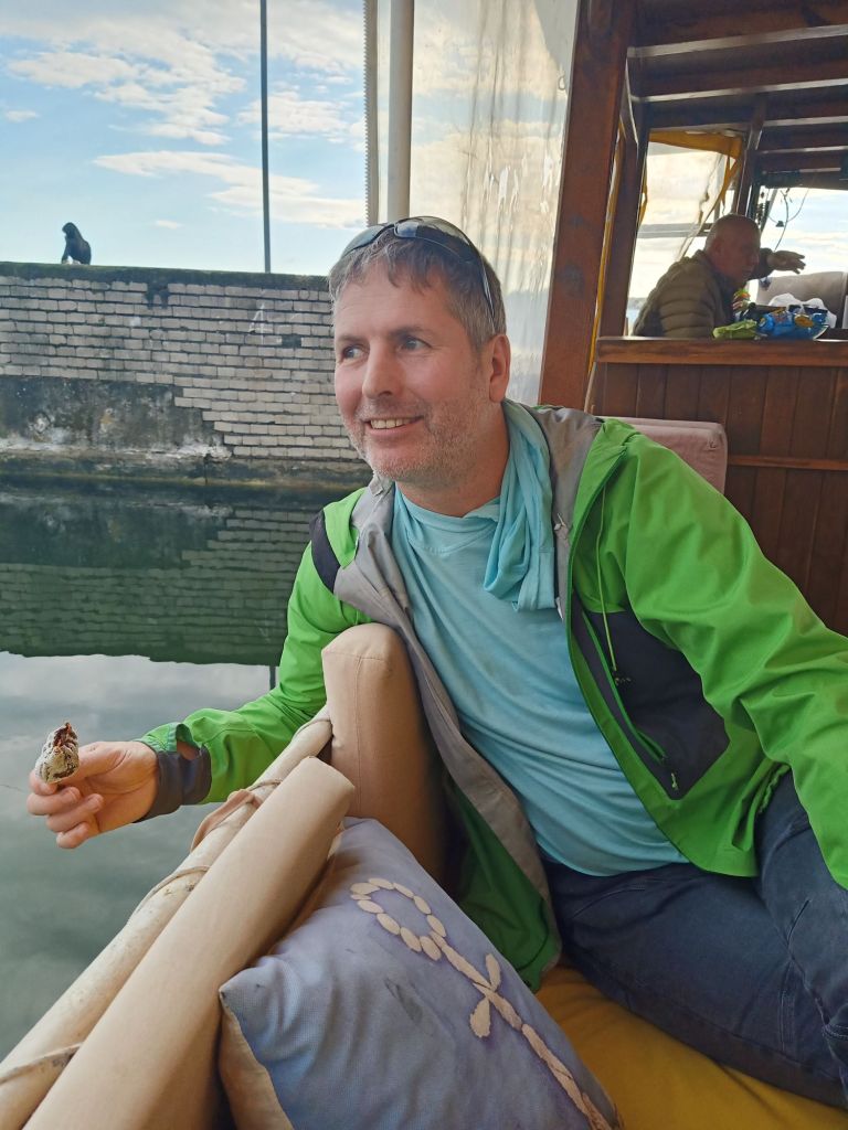 It was quite chilly out but dry, so we were optimistic for the boat trip today. When we got on, there was just us, Brigette and her hubby, Jim, plus a Turkish lady who was the mother of a walking friend of Captain Caveman’s. Usually there are about 16 onboard so this felt like our own private trip!!