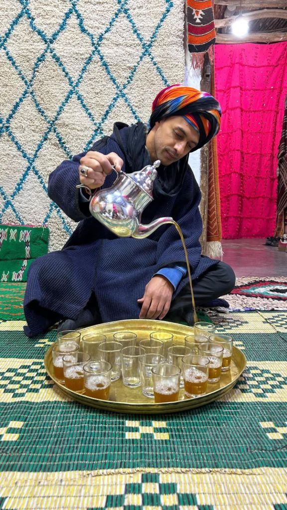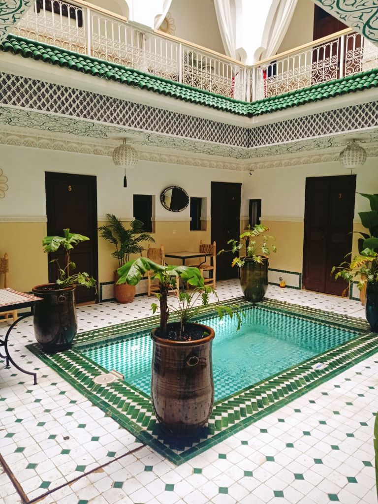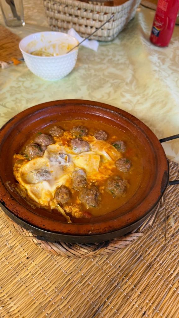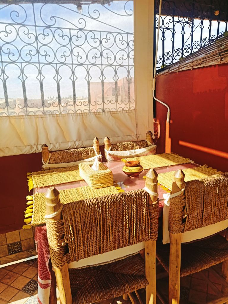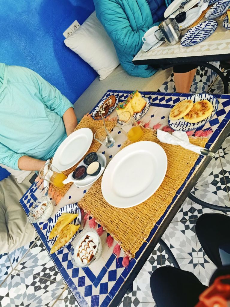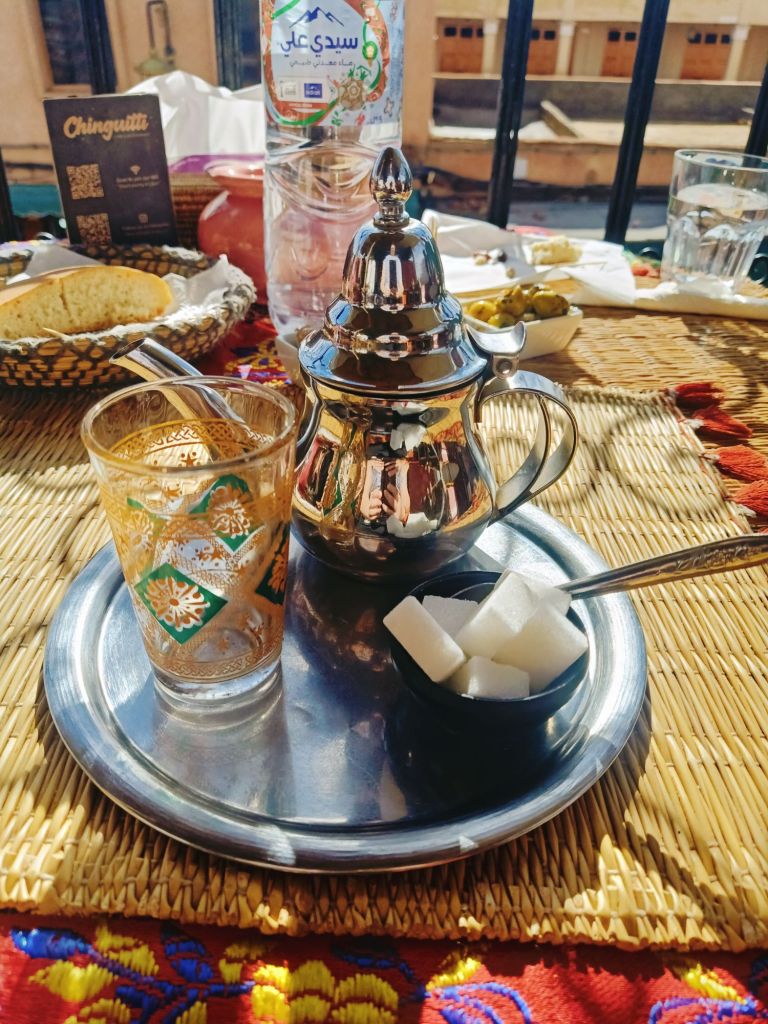 Breakfast was included at our riad and was served on the rooftop terrace each morning between 8 and 10am. Our first breakfast on Saturday 3rd January consisted of several bread based items, yoghurt with a sauce in, a piece of cake, juice and a choice of coffee or mint tea. I tried to take a photo of the spread and the photo was there, but later disappeared from my phone. This was to be the start of my phone deciding it was going to delete photos just minutes after taking them, with no warning! Captain Caveman had his coffee which he said was alright but didn’t eat the cake or the yoghurt. I tried a bit of everything but it was very sweet for a breakfast. We both liked the dosa type bread which we later learned was called Msemmen. I ordered the mint tea and it became my drink of choice throughout the week. At first I thought it was simply a healthy mint tea but it’s actually made with gunpowder green tea and plenty of fresh mint and sugar!!! The Moroccans pour the tea from the pot at a height to aerate it and it looks a bit like dirty water or whisky.