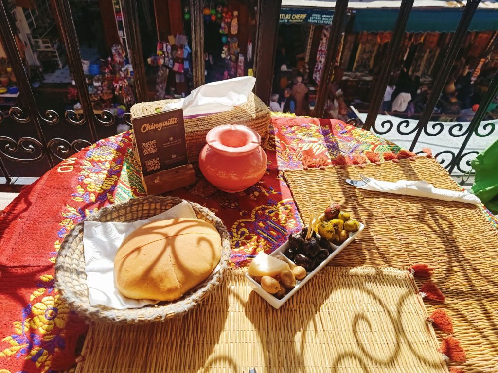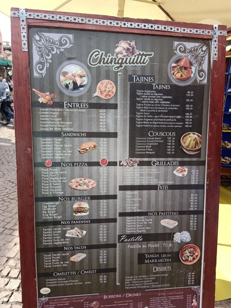 We called for some lunch on the rooftop dining area of Chinguitti restaurant in the square where the spices are. The sun was shining and I actually had to take my hat and hoody off. They didn’t sell alcohol so I ordered a mint tea, Captain Caveman a coffee and both of us chose tagines for our meal – a minced meat and egg for Captain Caveman and a chicken for me. The waiter was friendly and spoke french, we can get by in french too (although I’m a little rusty, food is my forte). The menu was in French and English so it was easy to order. A selection of olives with a basket of warm bread was given for free and we ordered a bottle of water as it was getting quite hot on the upstairs terrace.