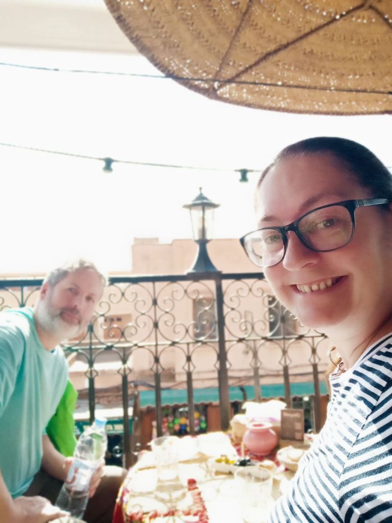 We had more of a wander round the Medina and then I needed the loo! Everywhere I go where I eat out, I often end up with a dodgy tum but it didn’t last long and I was ok after a cafe visit. I ran off to the top floor of Argana in the famous Jemaa el-Fnaa square, shouting back to Captain Caveman to just order me anything to drink.