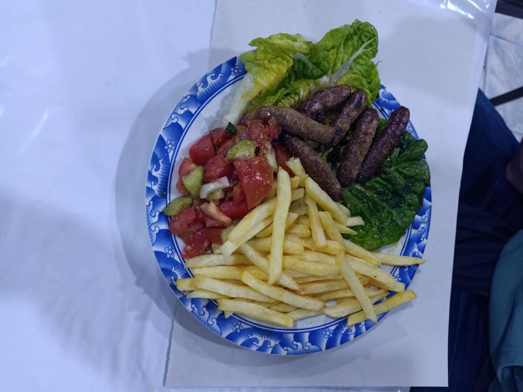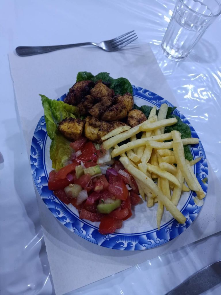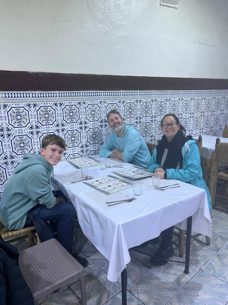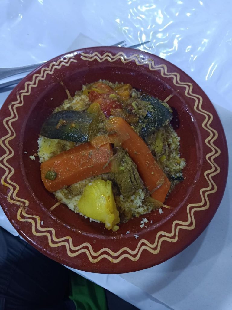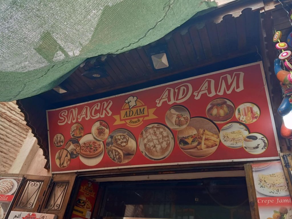 We walked past a snack place called Adam but we didn’t choose there to eat. Instead we went to a place near to it, that I forget the name of. Suzanna wasn’t hungry so just had soda water – which is excellent in Marrakech and cheap for a large bottle. Hugo had a local sausage dish and an Orangina, Captain Caveman ordered lamb, roasted veg and couscous tagine and I chose chicken shish and chips to be kind to my stomach. The food was good and cheap, it started raining as we were leaving and the restaurant we were at filled up quickly. We walked back to our respective riads with arrangements to meet up tomorrow to watch Morocco play football. We got back to our room before the rain got heavy and had a spiced rum for a night cap! Our first day in Marrakech had been surprisingly lovely and very relaxed.