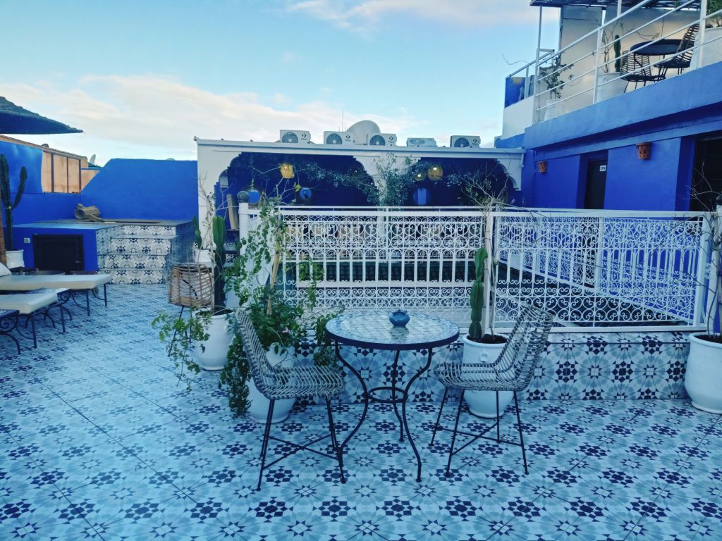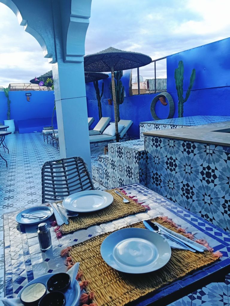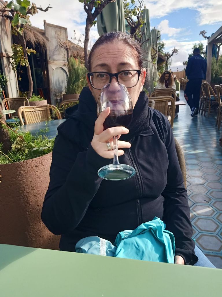 Our wandering had taken us outside of the Medina walls and we found a rooftop bar that had been recommended, Kabana. We did have to look carefully as it was a small doorway which led up to a massive rooftop bar. We had 2 glasses of red wine & 2 pints of lager for £35 so it wasn’t cheap but the Moroccan wine was palatable and they had excellent toilet facilities – this was also the second place we’d been where men and women use the same toilets so there are no male and female signs to look out for – very modern!