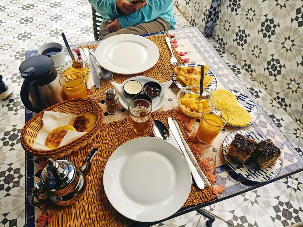 On Sunday 4th January I’d taken to using my work phone (which was on silent) to take the photos. I managed to get photos of the breakfast, the roof terrace and a grumpy cat who had sat in my seat. Today’s breakfast didn’t have yoghurt, which neither of us like, but it did have fruit salad and a different type of bread product which reminded me of pikelets crossed with pancakes, these were called baghrir. There was also chocolate cake which Captain Caveman didn’t have and I had only half of my piece despite it being very good.