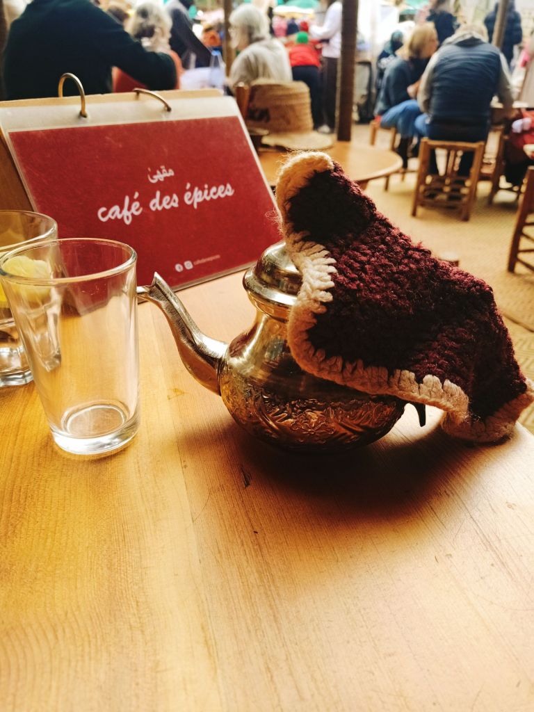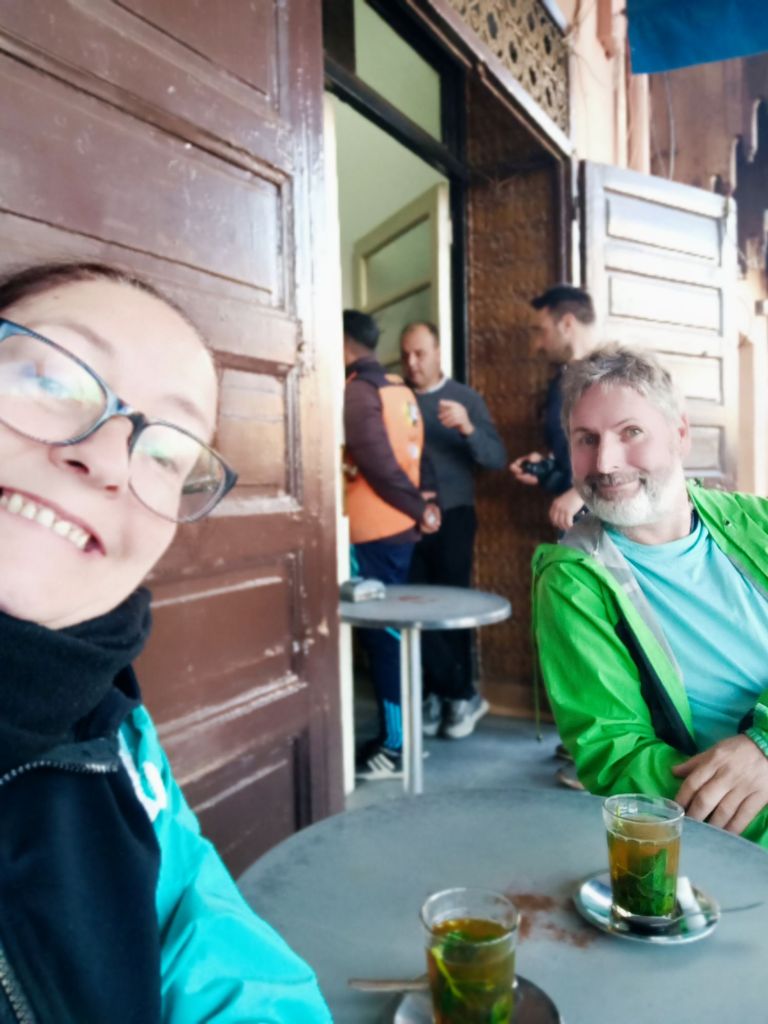 We hurried back as we needed to be back at Jemaa El-Fnaa to meet Suzanna and Hugo. They were keen to watch the football but I could already tell from the crowds of supporters in the streets that it was going to be busy wherever we went. As we got to the Grand Balcon Du Café Glacier, I could see it was rammed and there were staff on the doors. I get claustrophobic and am a little over the top on health and safety so I told Captain Caveman to go in without me. I sat downstairs on the outside terrace and ordered a mint tea. I also observed more and more people squishing in to the downstairs space where the football was on the TV. I envisaged getting trapped in there and didn’t want to be part of a Swiss New Year’s Eve scenario so refused to go inside. Captain Caveman came back when he realised Suzanna and Hugo weren’t there anyway and he joined me for a mint tea.