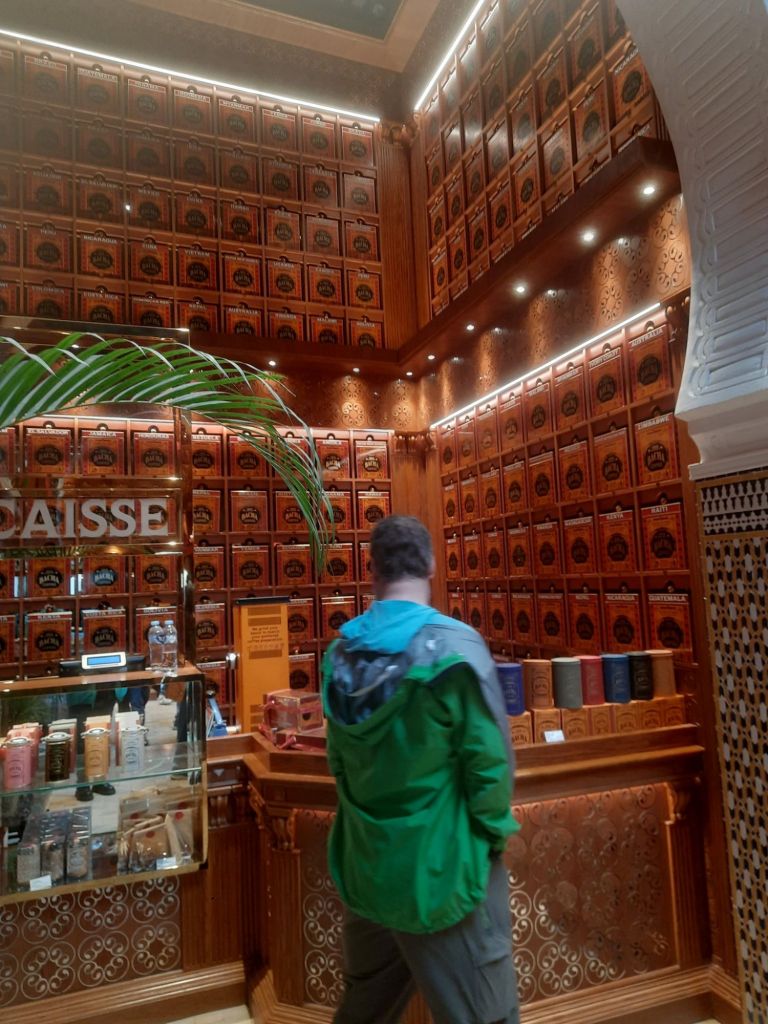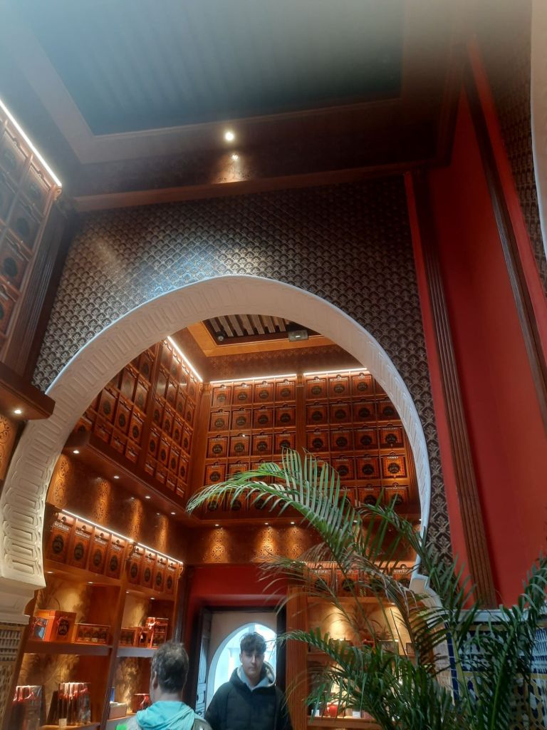 It had rained quite heavily during the night so I was definitely glad of sensible footwear today as the streets were a bit grubby. Our lunch stop today was Café Des Éspices which, by the time we left, was very busy so we were glad to have gone early. Service was quick, it had the tiniest (but clean) toilet I’d ever been in – and I’ve spent a lot of time in small toilets! We just ordered a falafel wrap for me and a köfte sandwich for Captain Caveman with hot drinks and a bottle of soda water for just shy of £20. The dishes were great but I had food envy for the harira (traditional soup) which all 3 people on the next table ordered.