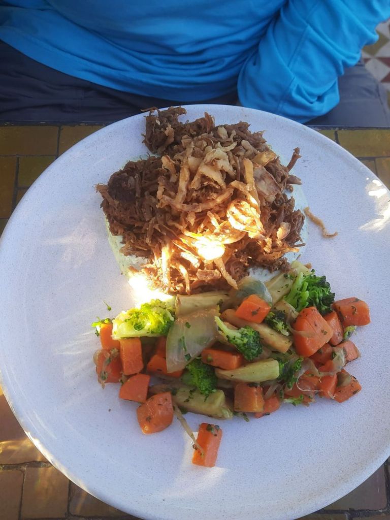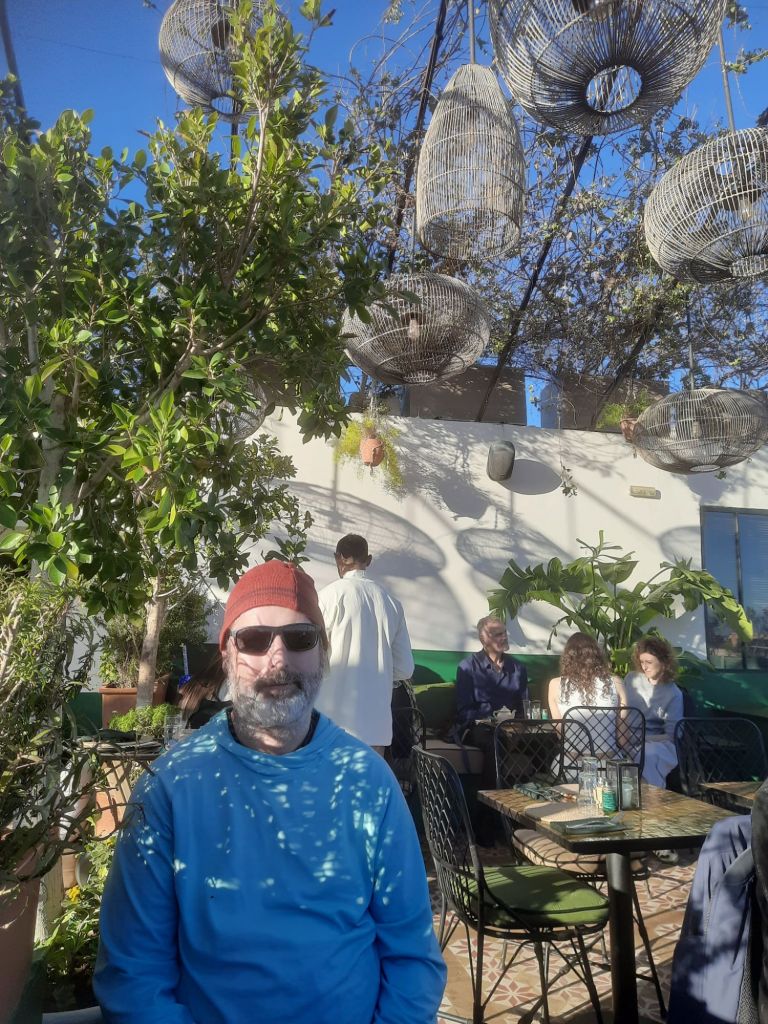 Captain Caveman and I had quite a few recommended eateries left on our list to try so Captain Caveman chose L’Mida. It had a great rooftop area and was quite busy – we were told they needed the table back in 2 hours, which was fine by us. We both had lemon water and a main course which came to a total of £30. My Makhani beef tagine was a bit heavy on the carrots and peas (which should’ve been green beans) so it wasn’t my favourite meal in Marrakech but was still very nice. Captain Caveman had a shredded lamb dish which looked fantastic. Back in the riad, we forced down the last of our spiced rum and totted up that we had enough cash to be able to get a cheap lunch tomorrow before our flight home.