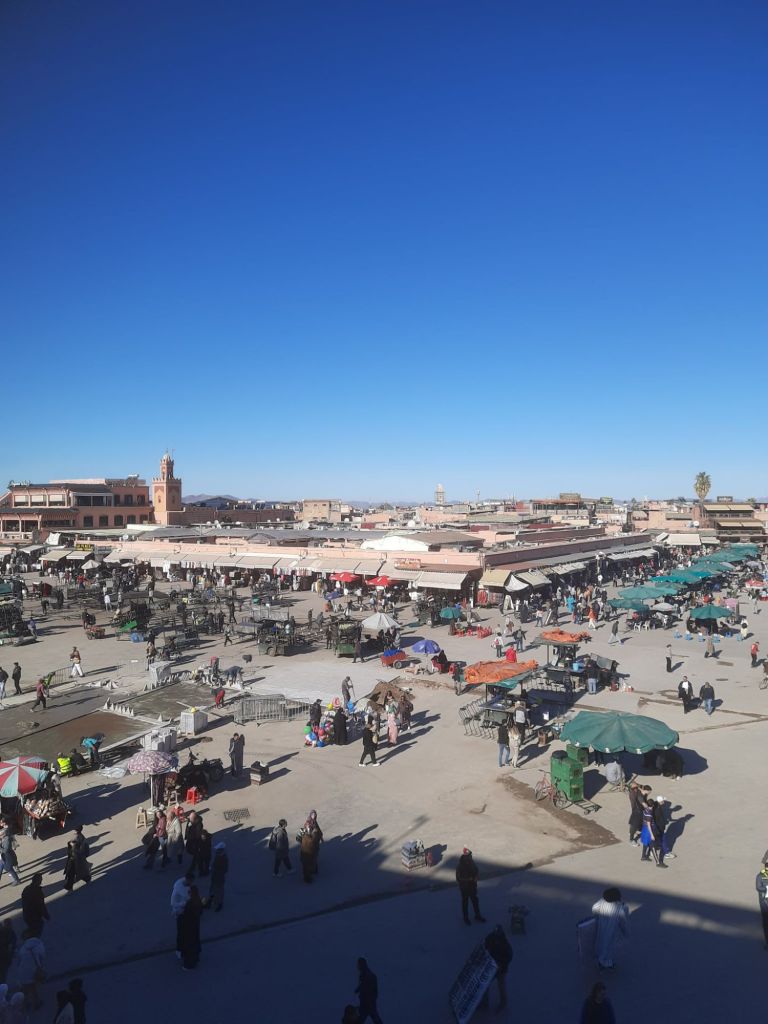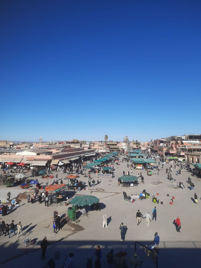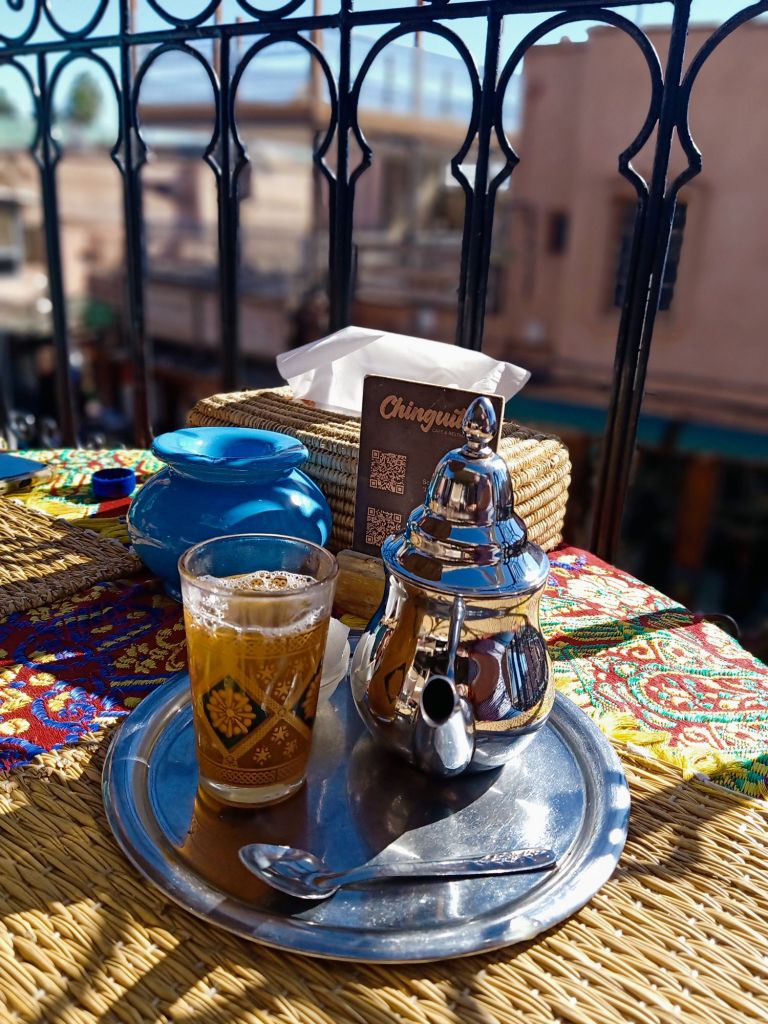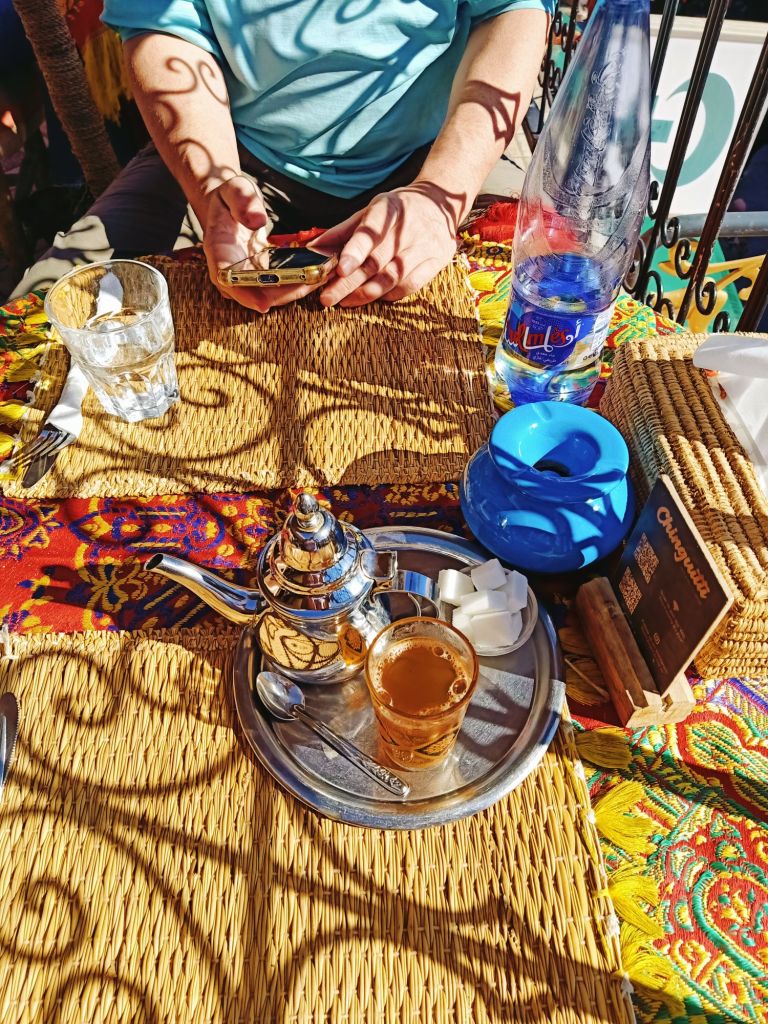 We decided to have one last visit to the Balcon Du Café Glacier where we sipped mint teas and paid over the odds for our pees! The tap water was off so the toilet attendant was using a bottle of water to pour on to our hands to wash them. I had a bit of a chat with him and we laughed when the water came back on after he had poured water on to both mine and Captain Caveman’s hands. We sat at the edge of the roof top terrace and spent hours watching the comings and goings of the Jemaa el-Fnaa square. The monkey men looked the dodgiest so we were glad we had avoided them but we are sure we witnessed some drug deals going down between a ‘disabled’ man and a tuk tuk driver. The sunglasses sellers were also doing some strange formation stances which looked to be synchronised with other vendors. We also saw a bit of a skirmish between what looked like a legit stall holder and a dodgy one. It was definitely the best place for people watching, despite us spending almost £12 on hot drinks and toilet visits!