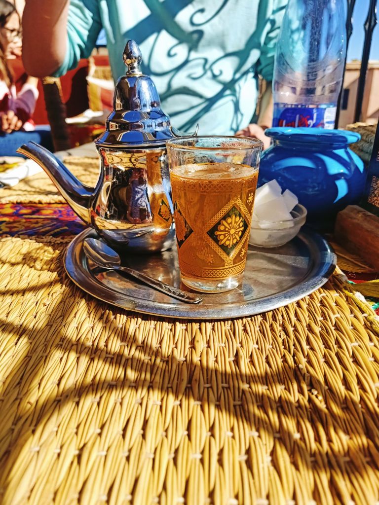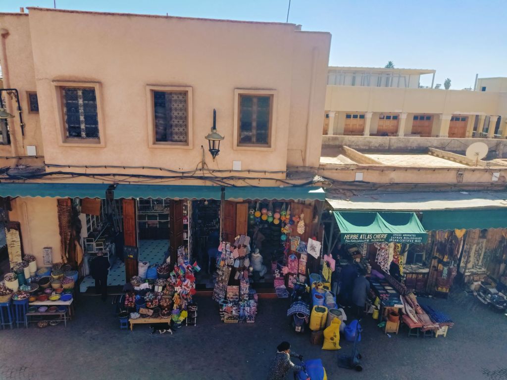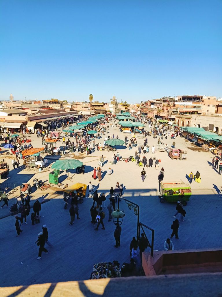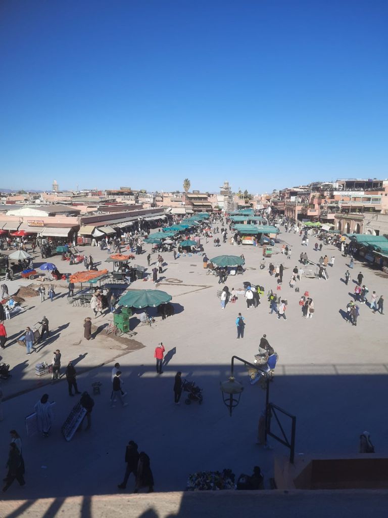 We decided to have one last visit to the Balcon Du Café Glacier where we sipped mint teas and paid over the odds for our pees! The tap water was off so the toilet attendant was using a bottle of water to pour on to our hands to wash them. I had a bit of a chat with him and we laughed when the water came back on after he had poured water on to both mine and Captain Caveman’s hands. We sat at the edge of the roof top terrace and spent hours watching the comings and goings of the Jemaa el-Fnaa square. The monkey men looked the dodgiest so we were glad we had avoided them but we are sure we witnessed some drug deals going down between a ‘disabled’ man and a tuk tuk driver. The sunglasses sellers were also doing some strange formation stances which looked to be synchronised with other vendors. We also saw a bit of a skirmish between what looked like a legit stall holder and a dodgy one. It was definitely the best place for people watching, despite us spending almost £12 on hot drinks and toilet visits!