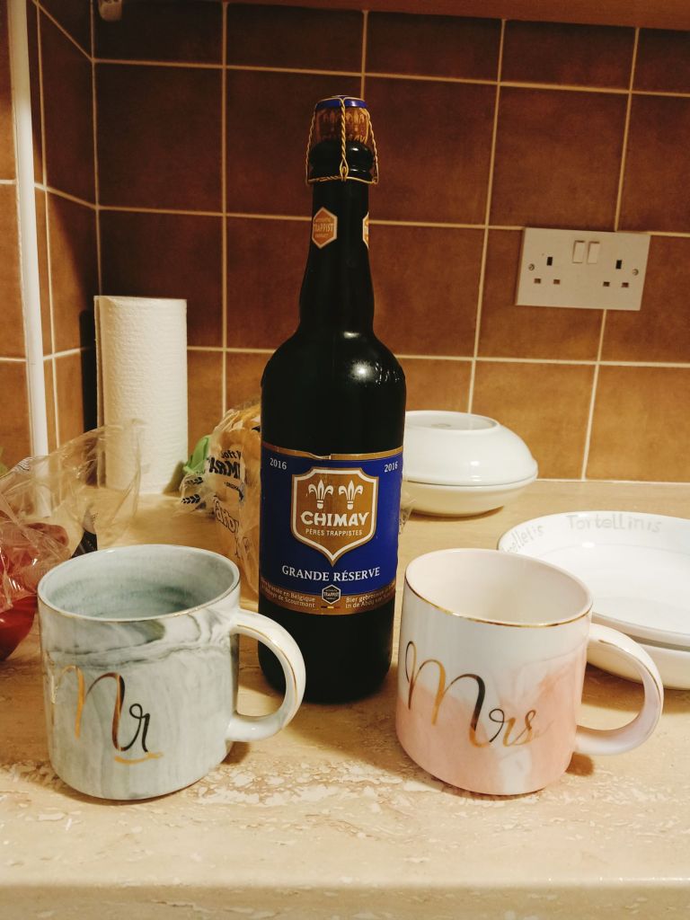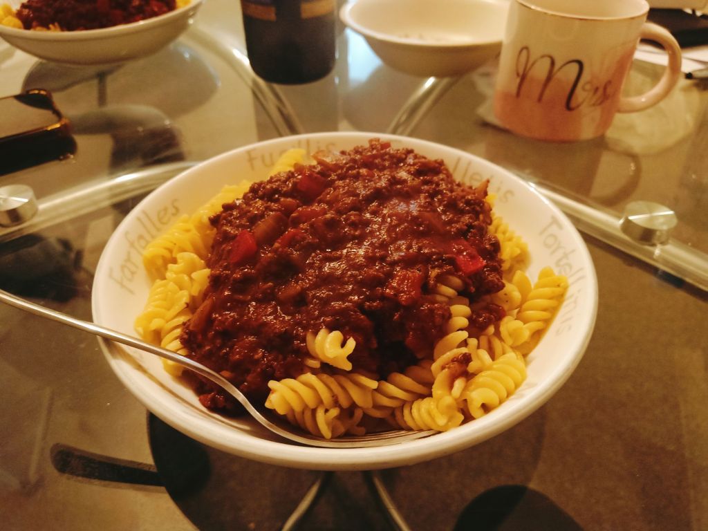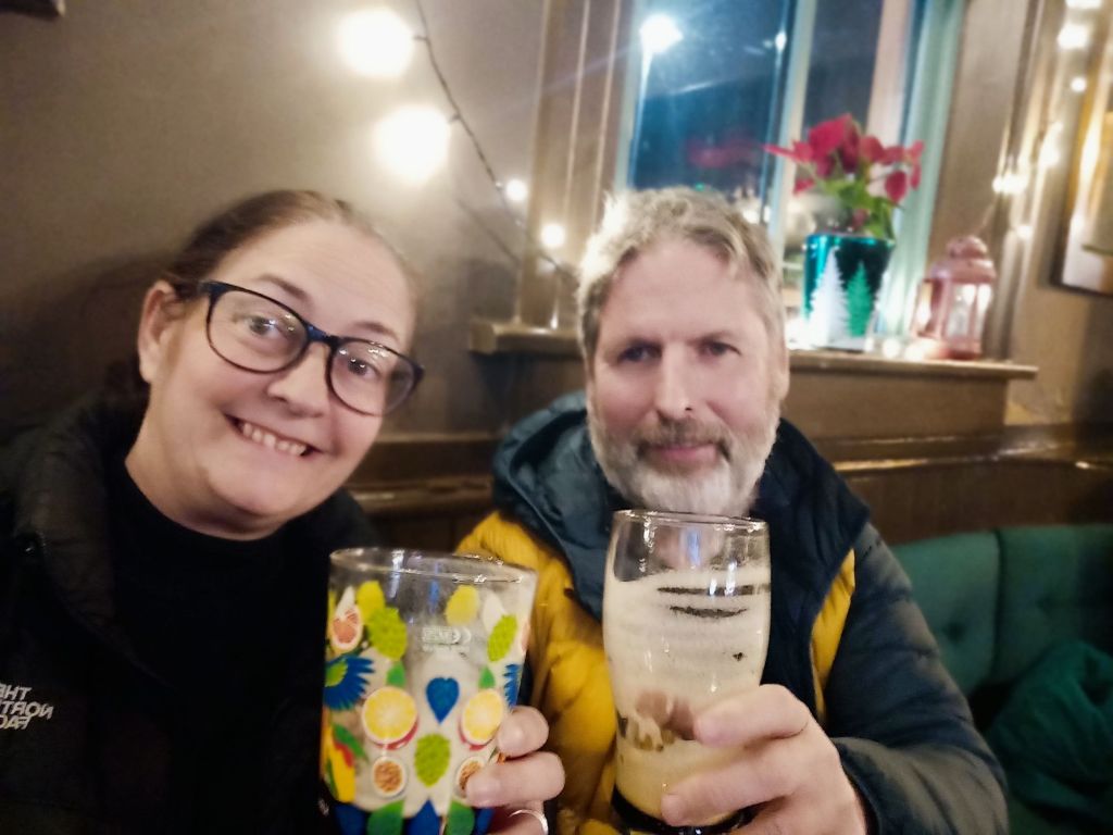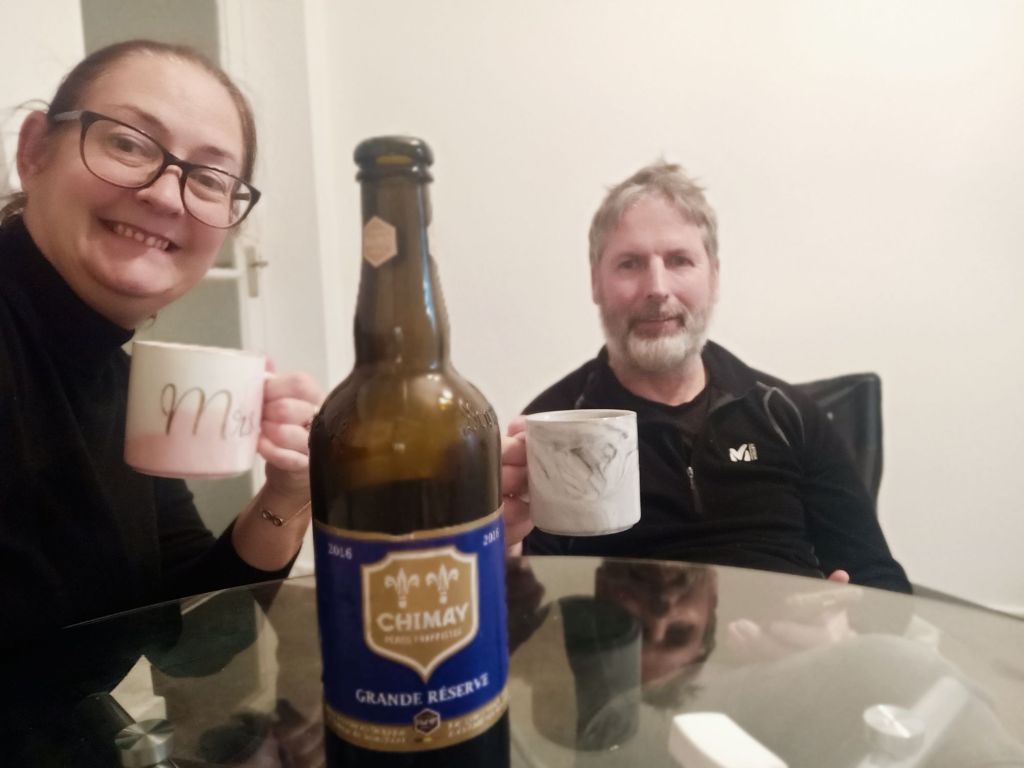 During the shopping, I needed the loo and discovered that Asda didn’t have a toilet so I had to call back in to the pub, but didn’t get another drink. It was really cold so we hurried home to have a pasta bolognese, cooked by Captain Caveman. We opened the Christmas Belgian beer to drink in mugs and I only managed a little bit – it was very nice but the alcohol was not going down well with me.