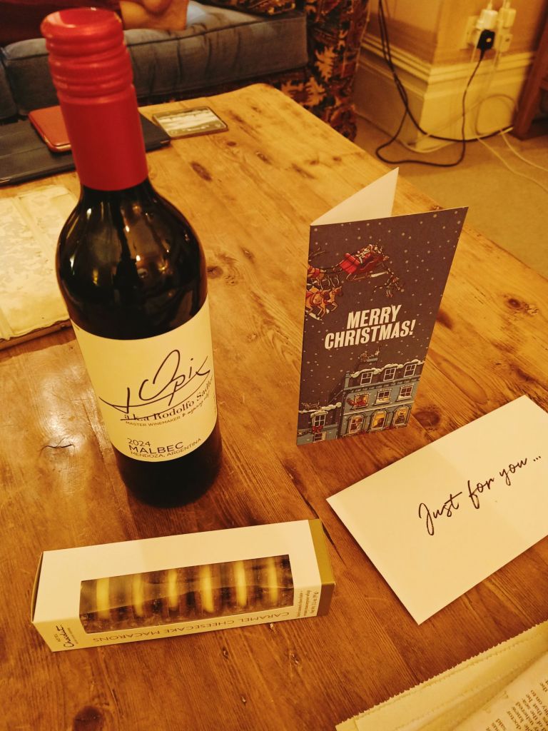 When we arrived in Barnes, at Captain Caveman’s parents’ home, it was gone 8.30pm. As we said our hellos I could smell a roast dinner cooking (nothing gets past me). Captain Caveman had failed to mention that his parents were doing a full on roast pork dinner for my last dinner in the UK – I almost cried. In the living room with a glass of wine, more excitement came as I opened a delayed Christmas gift from a friend – a thoughtful bottle of Argentinian Malbec and some caramel cheesecake macarons. We decided to have these with dinner and for afters we ate cheese and biscuits then the macarons. It was such a lovely last evening in the UK and I knew that this time I was going to miss it more than usual.